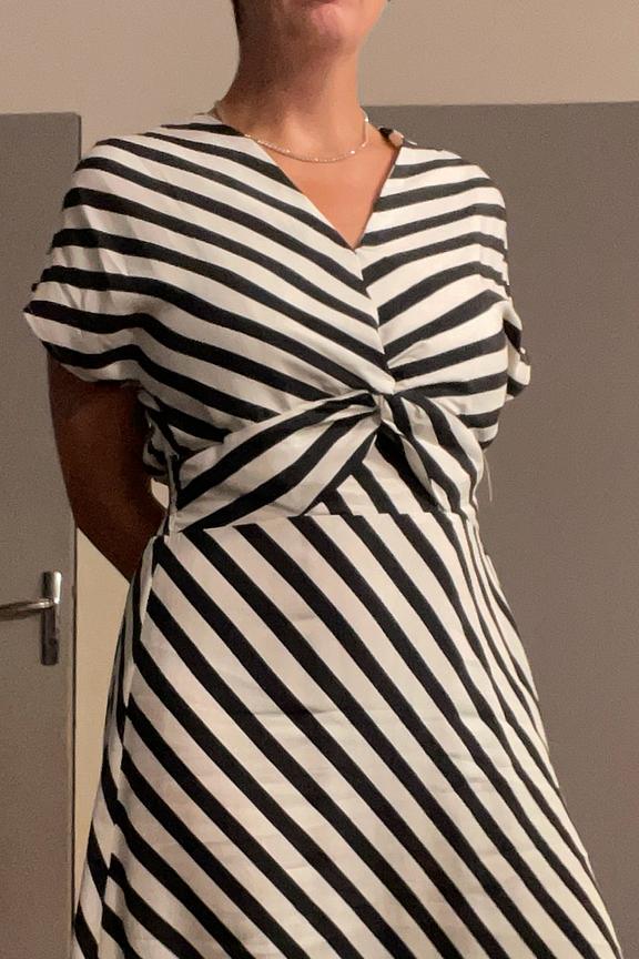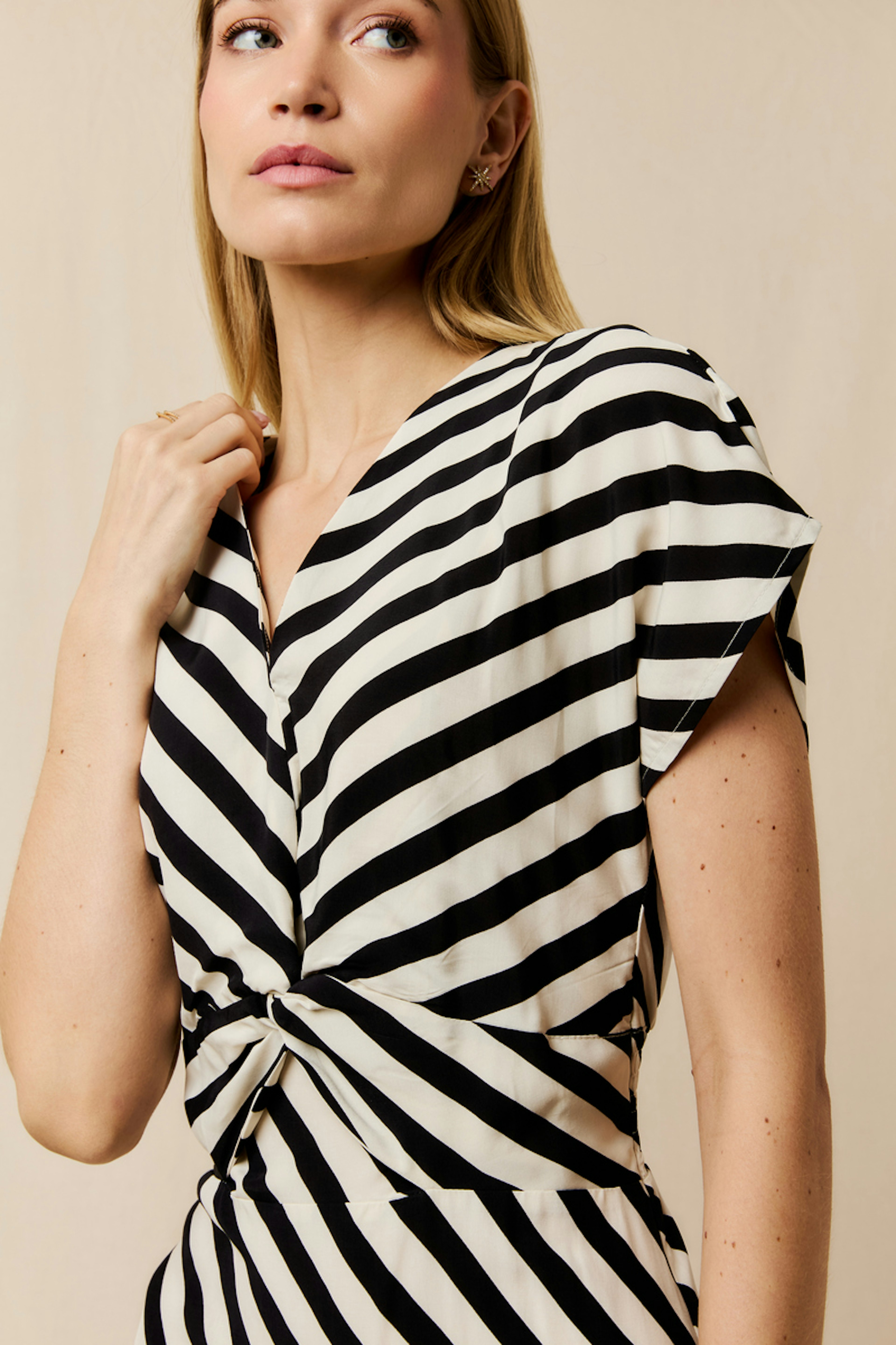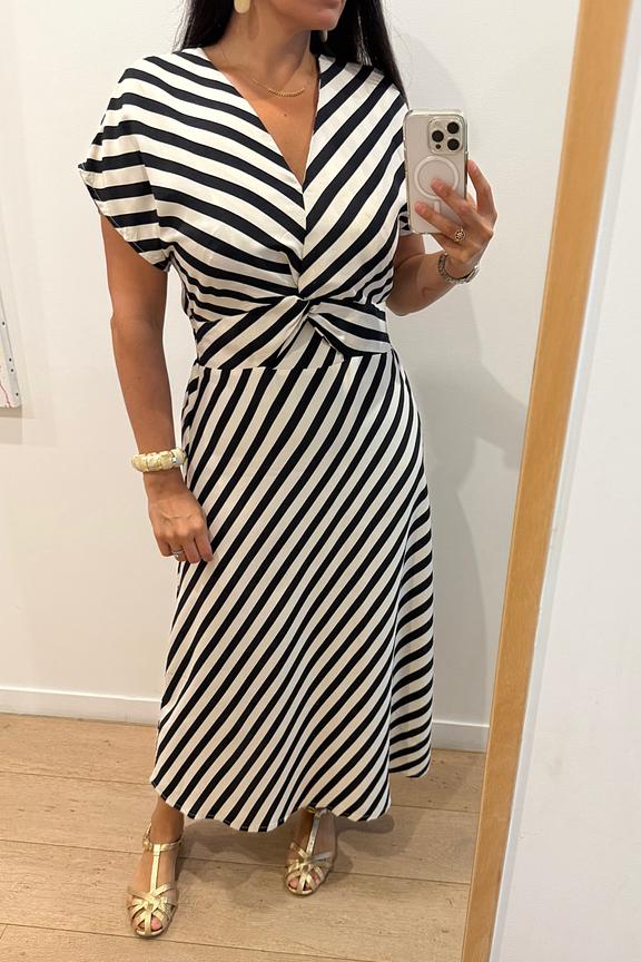 Portez cette robe avec des sandales à talons élégantes et un chapeau de paille pour un look estival chic. • Robe cache-cœur • Décolleté en V • Manches courtes • Longueur mi-mollet • Motif rayé
