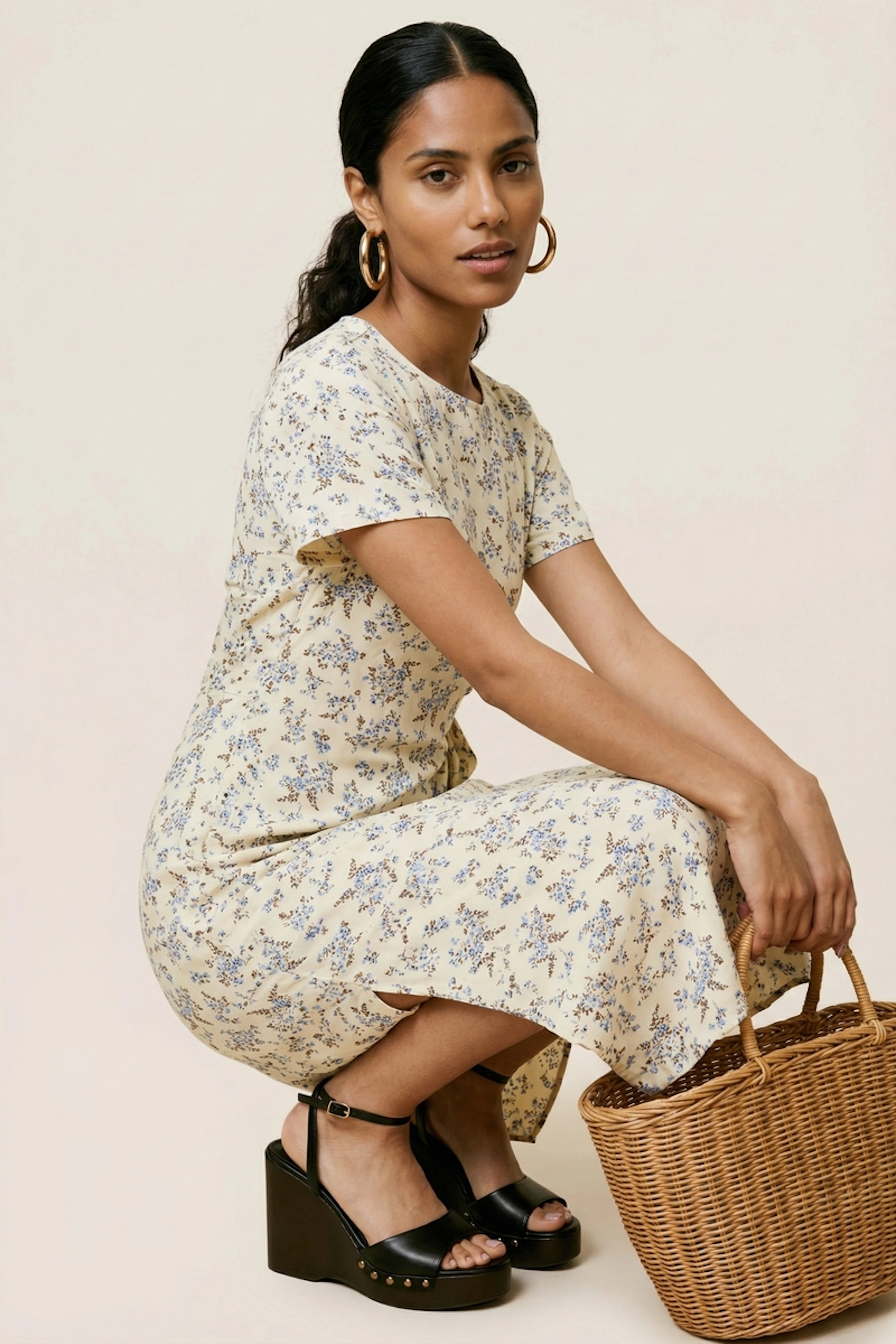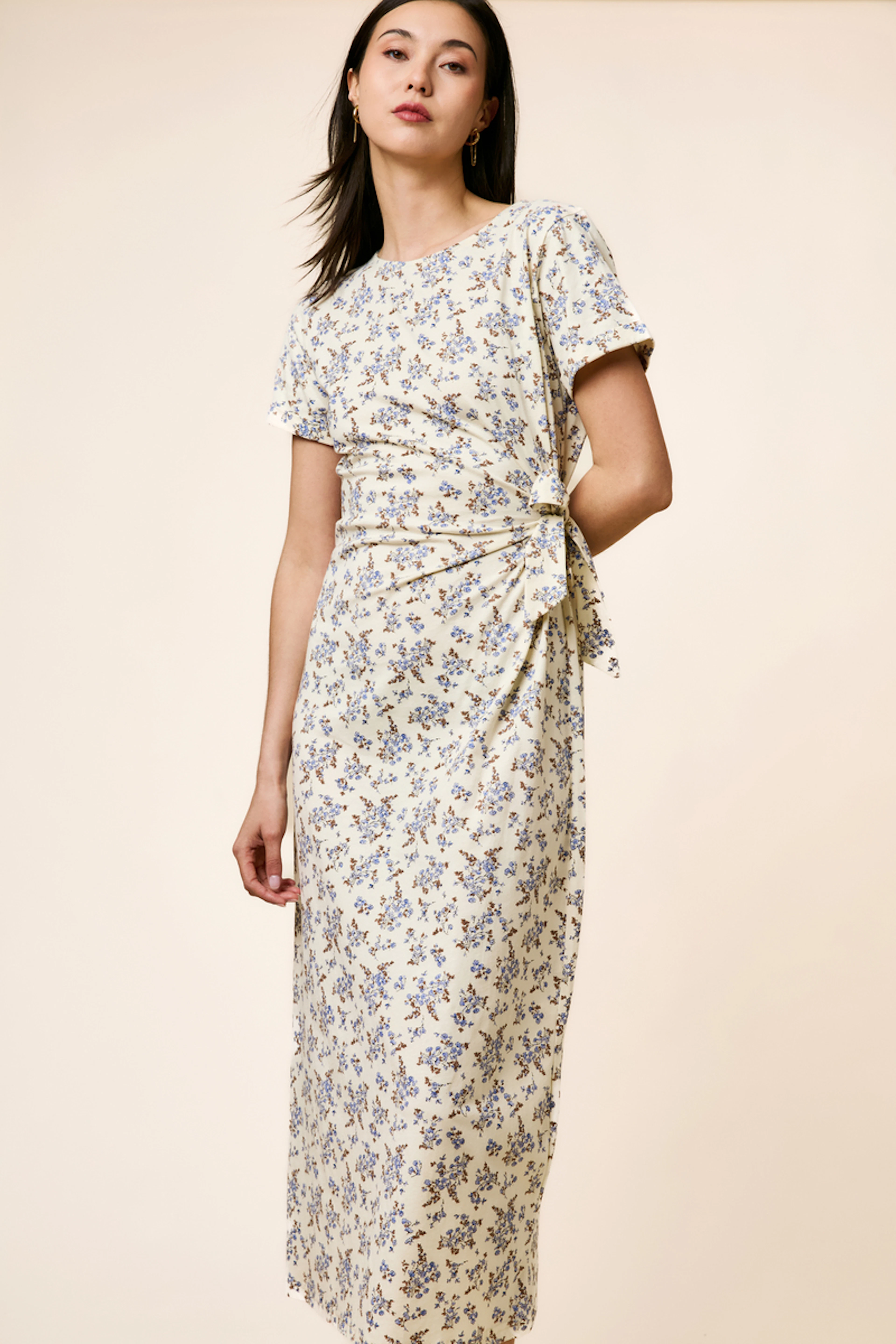 Associez cette robe florale à des sandales en cuir brun et un sac en osier pour une promenade estivale décontractée. • Robe trapèze en coton • Manches courtes • Taille nouée à l'arrière • Encolure ronde • Motif floral