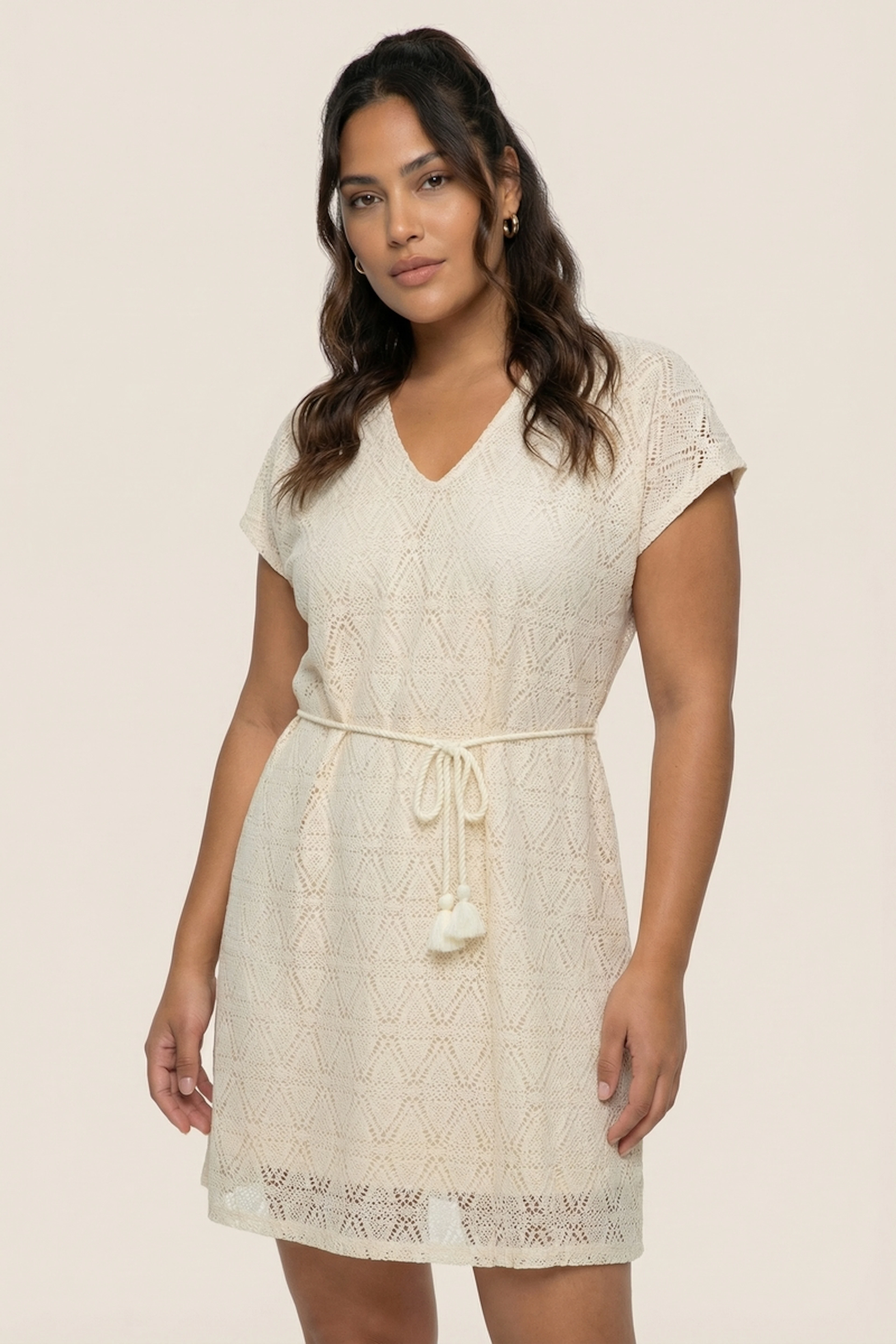 Associez cette robe légère à des boucles d'oreilles dorées et des sandales pour un look estival décontracté. • Robe courte • Décolleté en V • Manches courtes • Lien à la taille • Motif ajouré