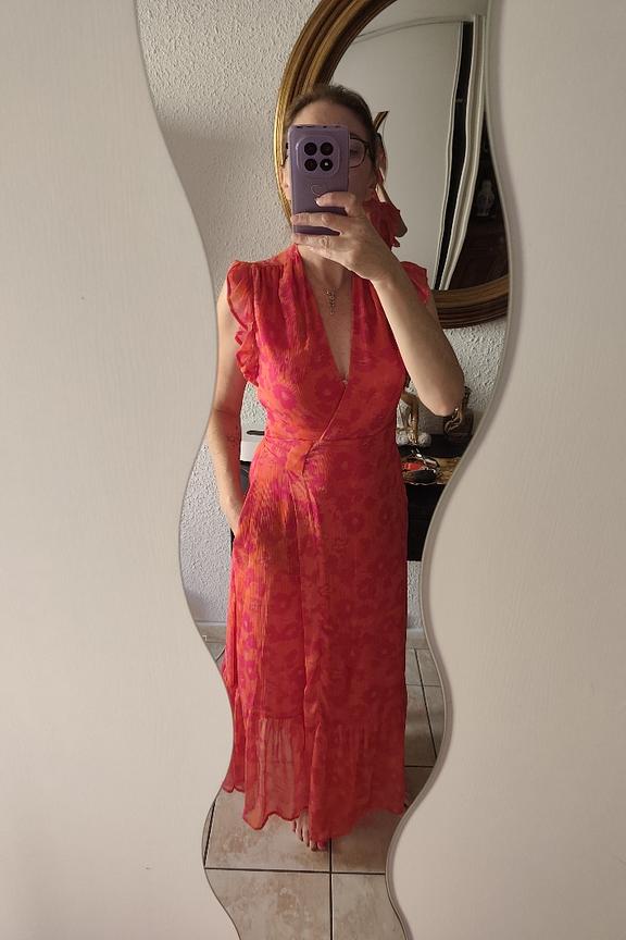 Vous cherchez une robe à la fois simple, élégante et légère ? La robe Meghan saura répondre à toutes vos attentes ! • Matière légère • Tons colorés • Imprimés fleuris • Coupe portefeuille réhaussée de volants • Manches aux finitions volantées • Détails qui incarnent un romantisme particulier • Taille cintrée • Col V plongeant • Robe portefeuille vaporeuse