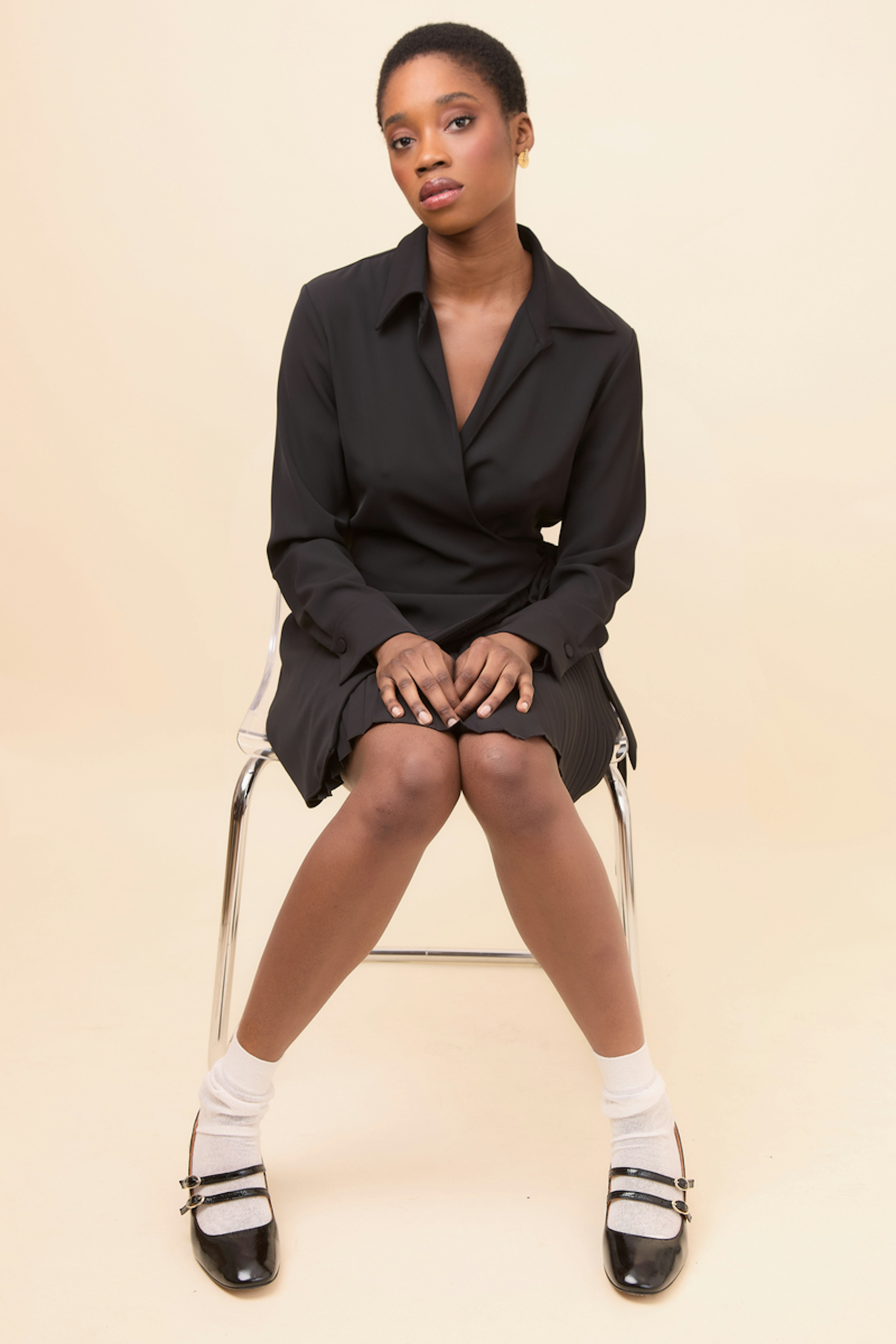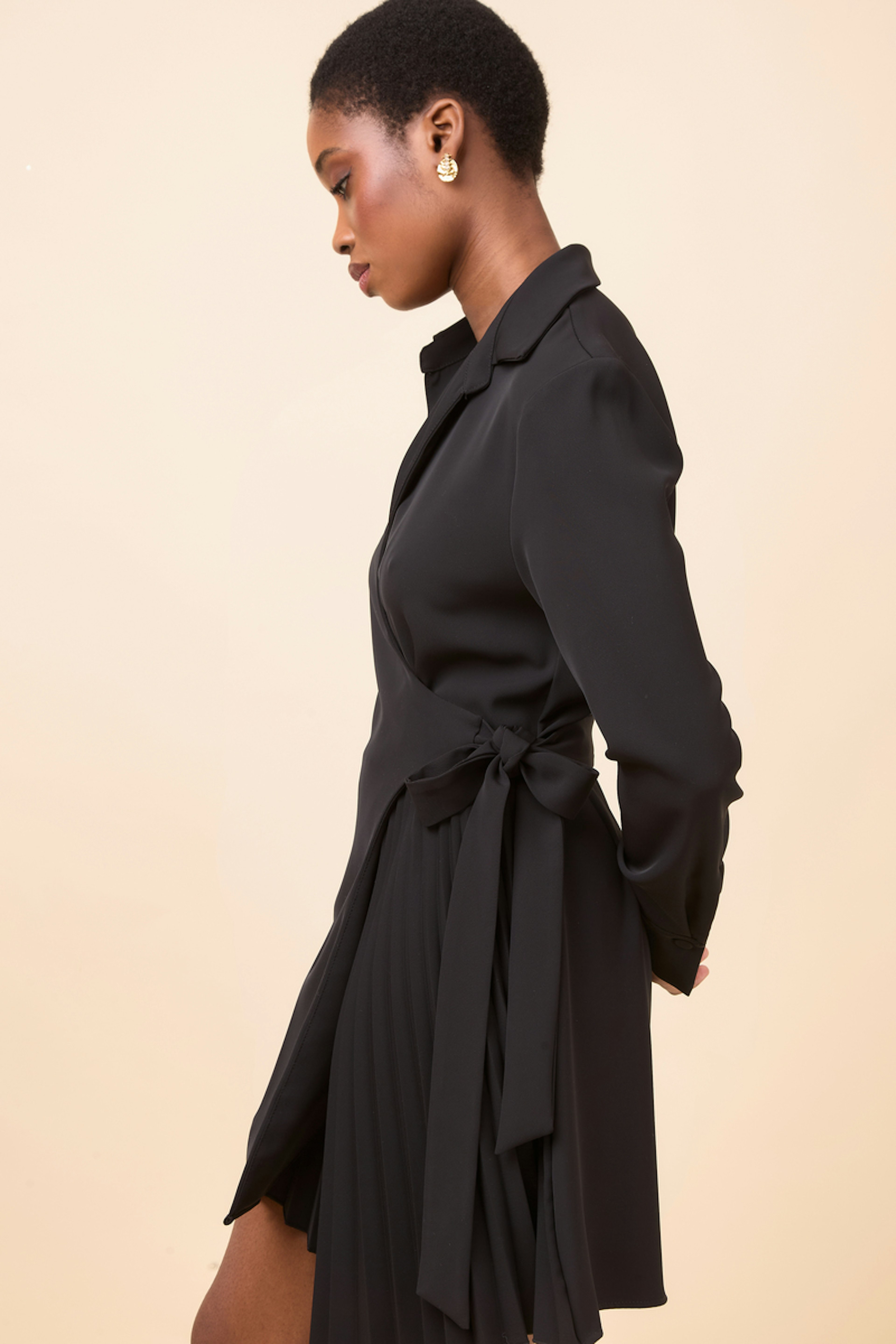 Ajoutez une touche chic avec des talons aiguilles et un sac métallisé pour un look parfait en soirée. • Robe courte • Coupe portefeuille • Manches longues • Détail plissé • Noire élégante