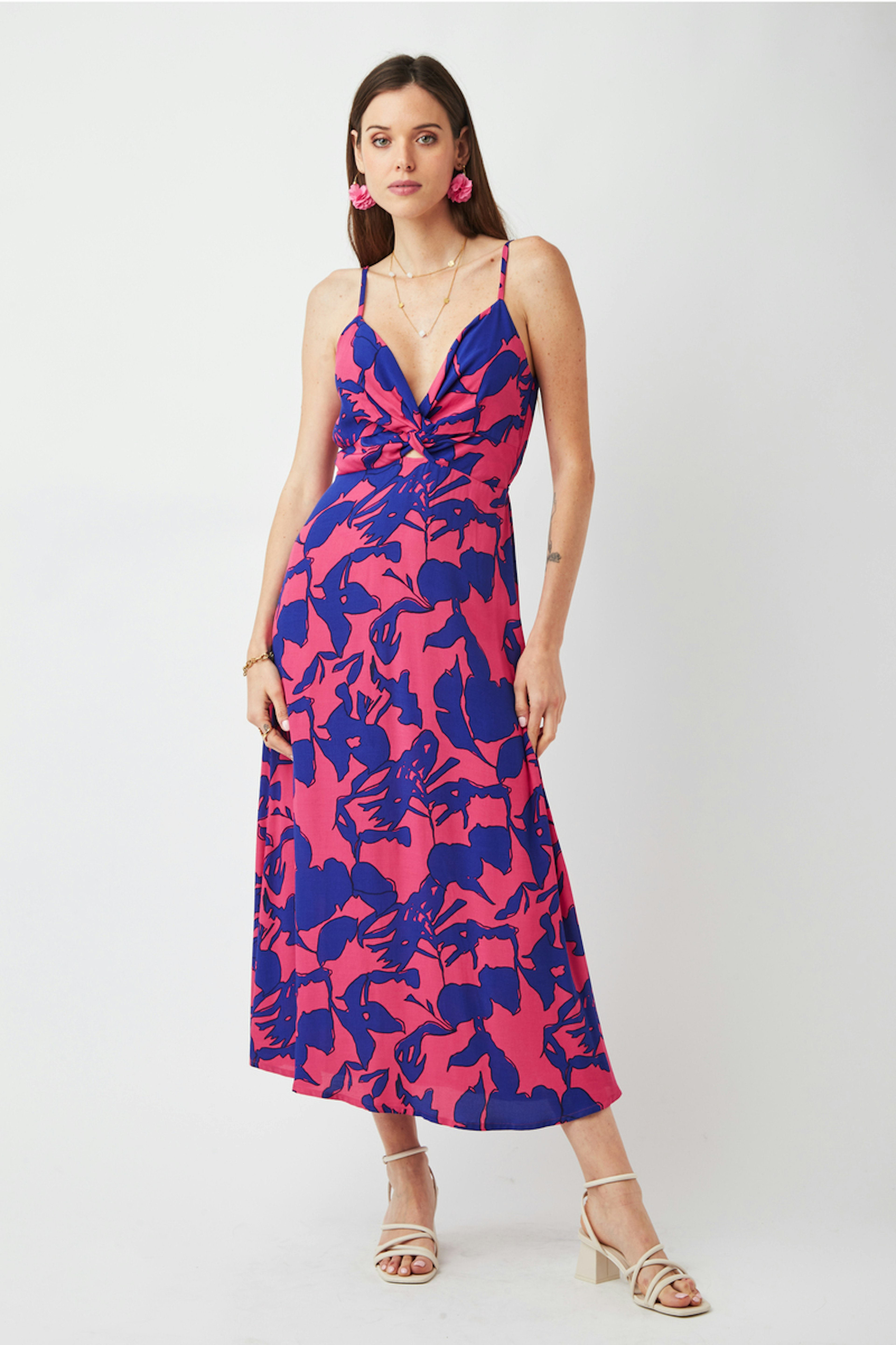 โข Tissu fluide et lรฉger โข Coupe ample โข Longueur midi โข Col V nouรฉ โข Bretelles rรฉglables โข Ceinture รฉlastique dans le dos โข Finitions surpiquรฉes โข Longueur du produit depuis l'รฉpaule pour la taille S : 117 cm Vous allez totalement craquer pour la robe imprimรฉe MERIKA. Ses bretelles sont rรฉglables et ses imprimรฉs sont dessinรฉs dans nos bureaux parisiens. Son charme fou ? Son nลud qui ajoute un dรฉtail fashion ร cette piรจce.