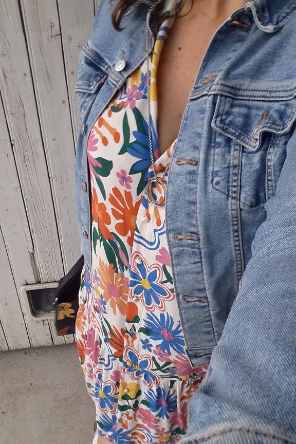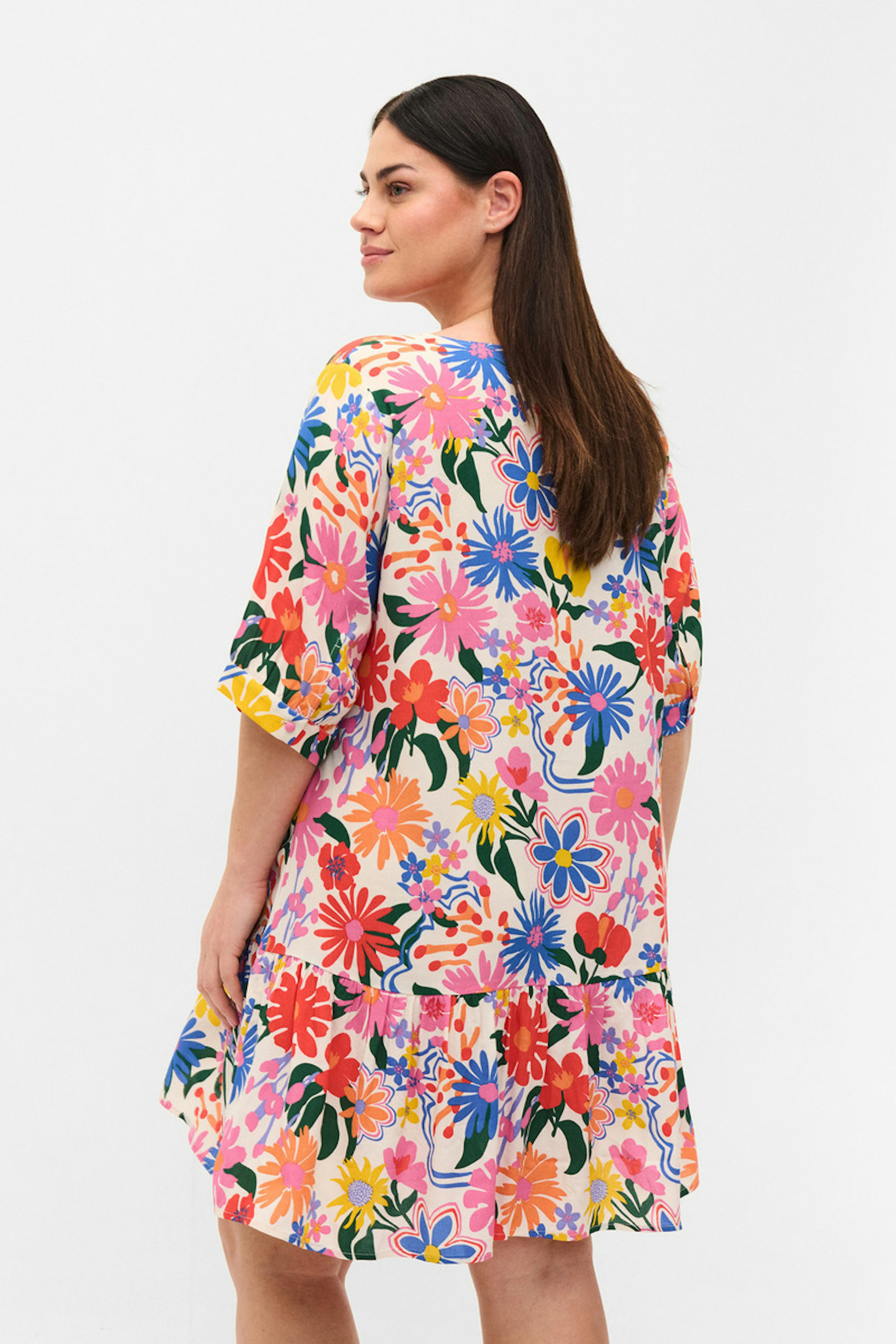 โข Robe colorรฉe ร imprimรฉ fleuri โข Encolure en V โข Manches courtes โข Coupe รฉvasรฉe avec volant en bas de jupe โข Tissu composรฉ ร 51% de viscose certifiรฉe รฉcovero