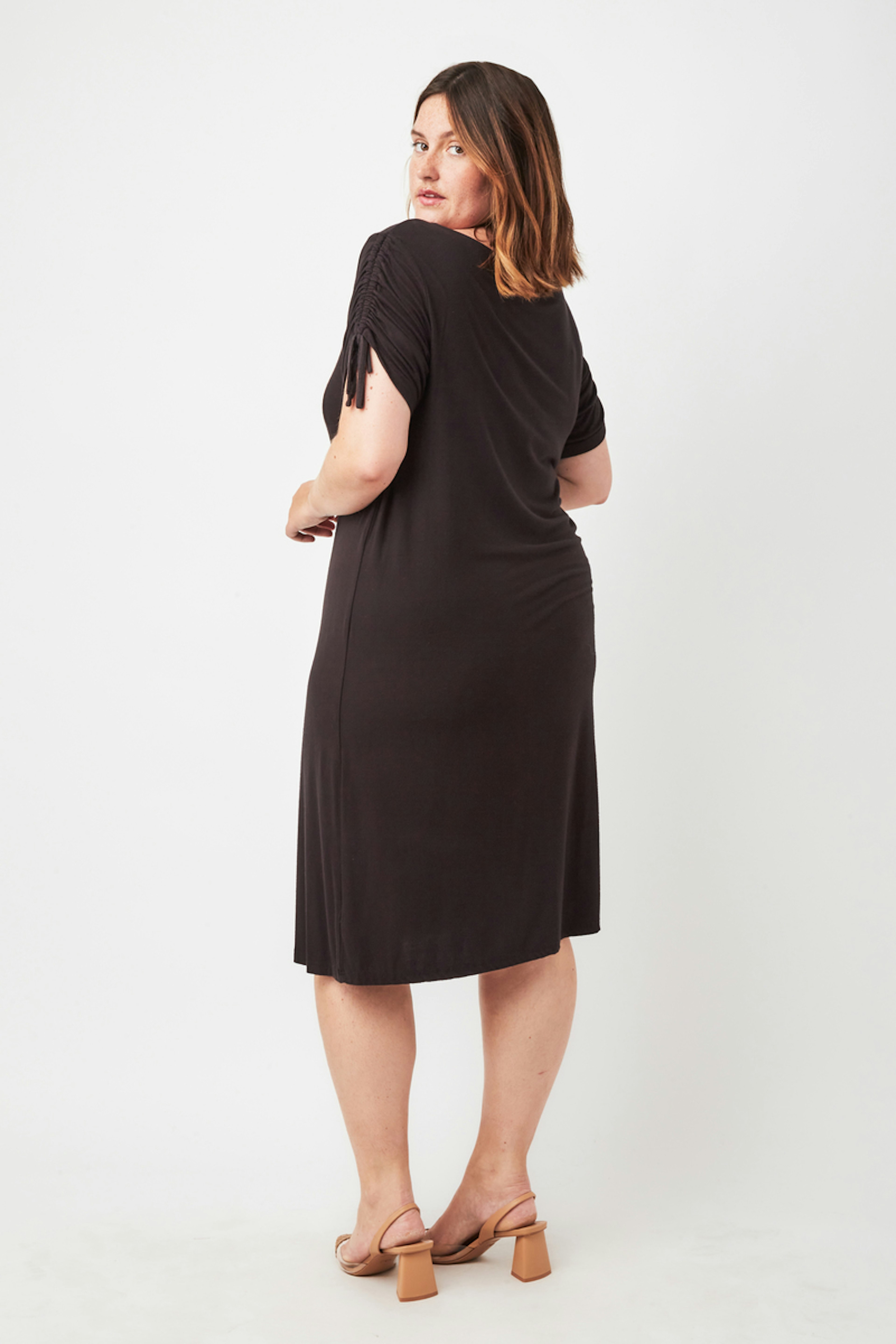 โข Robe noire โข Manches courtes avec liens de serrage โข Col rond โข Coupe prรจs du corps โข Longueur au-dessus du genou โข Tissu contenant 95% de viscose certifiรฉe รฉcovero