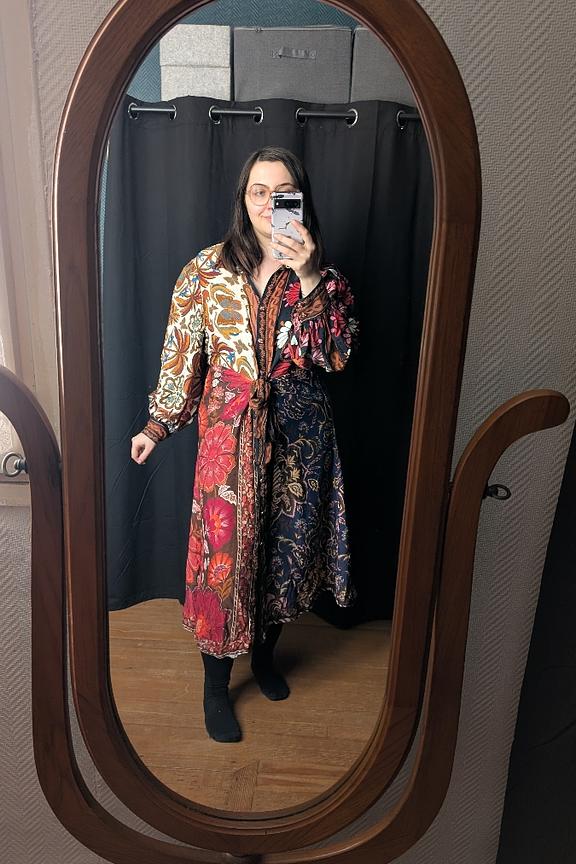 “Je mesure 1m50 et elle est vraiment très longue. Avec des talons, ça ne trainait pas par terre, mais tout juste. Matière très agréable et d’une grande qualité, de même que les motifs et couleurs. Manches un peu trop bouffantes à mon goût.”