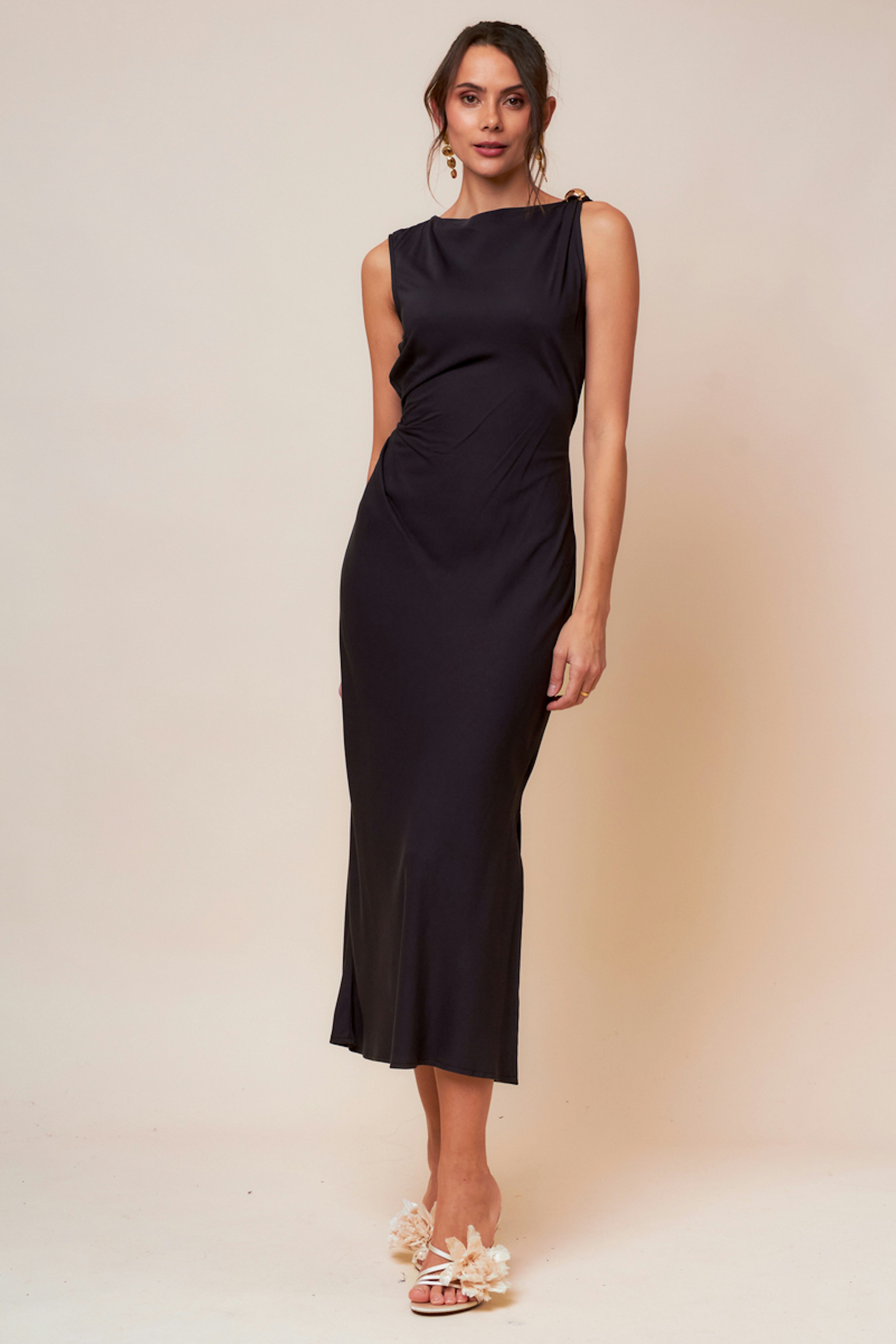 Ajoutez une paire de sandales à talons et une pochette minimaliste pour un look chic en soirée. Parfait en toute saison. • Robe longue en rayon • Coupe ajustée • Col bateau • Sans manches • Broche décorative sur l'épaule