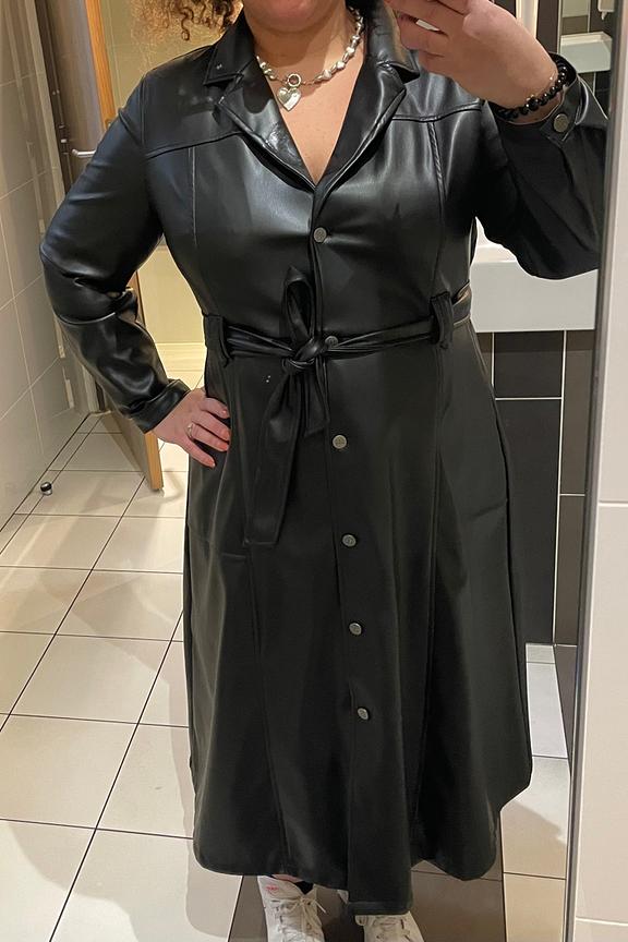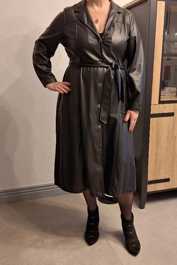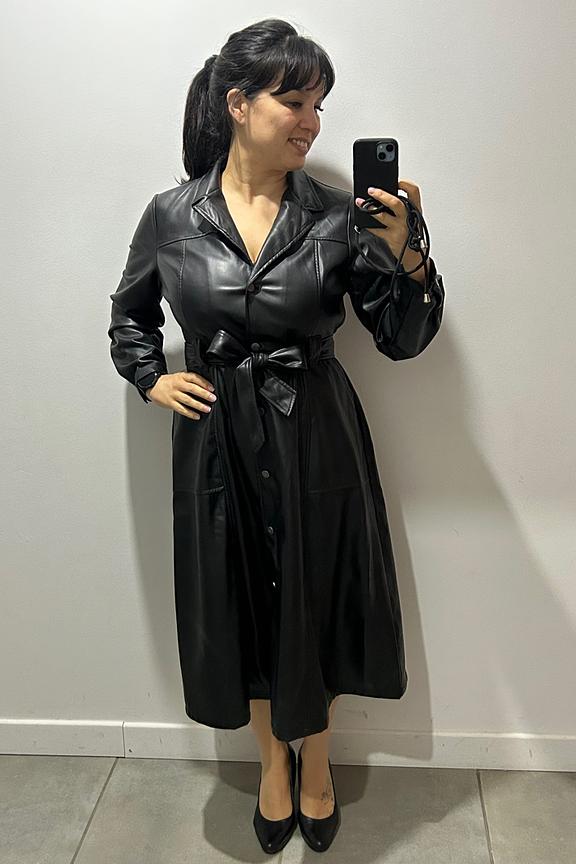 Associez cette robe chemisier noire à des bottines élégantes pour un look hivernal chic. Ajoutez un chapeau en feutre pour une touche de sophistication. • Robe en simili cuir noir • Forme trapèze • Longueur mi-mollet • Col cranté • Ceinture amovible