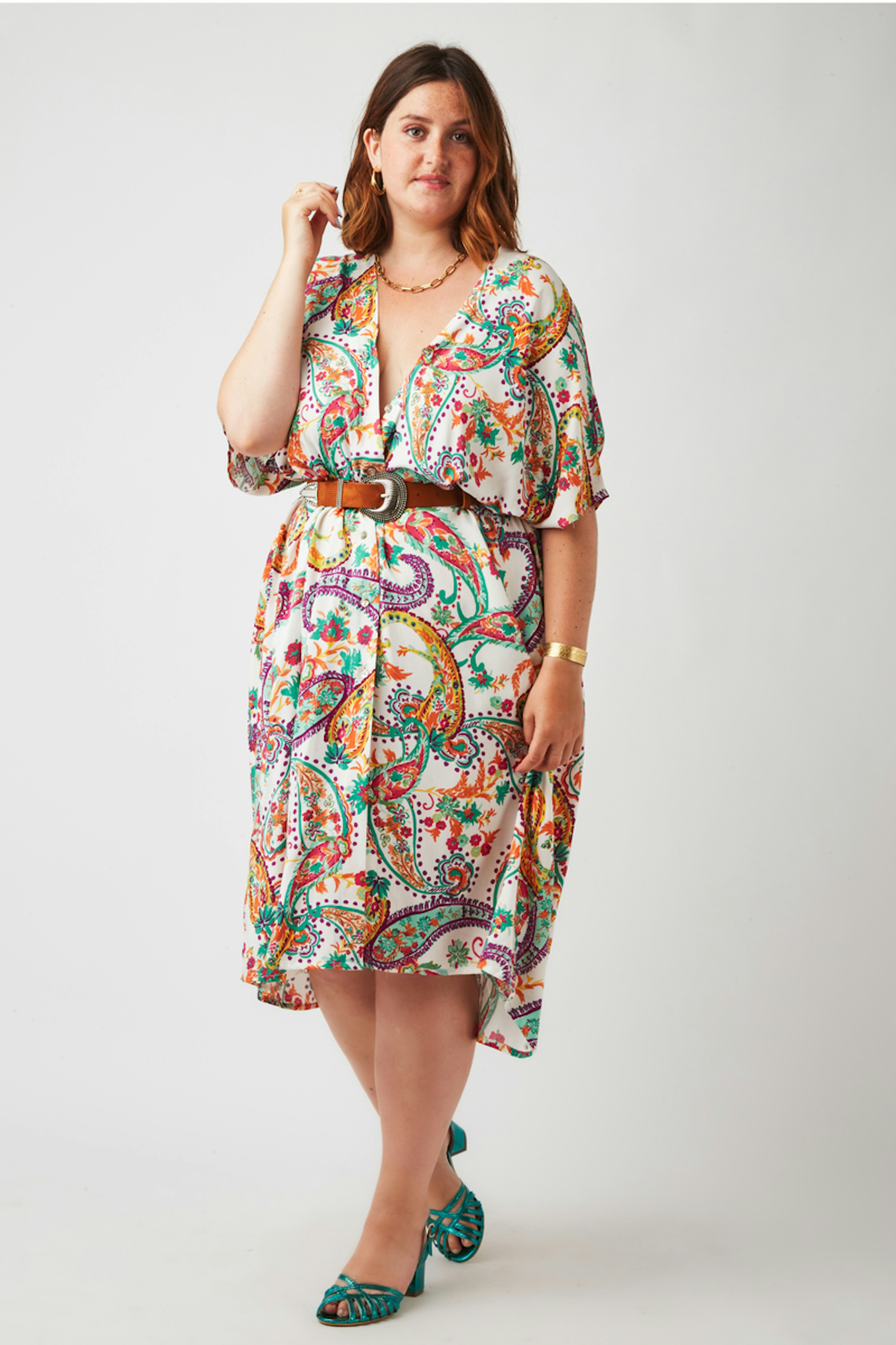 โข Robe Morea โข Col ร chemise โข Longueur courte โข Motif floral abstrait โข Fermeture ร boutons โข Taille unique qui convient du 36 au 44
