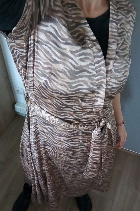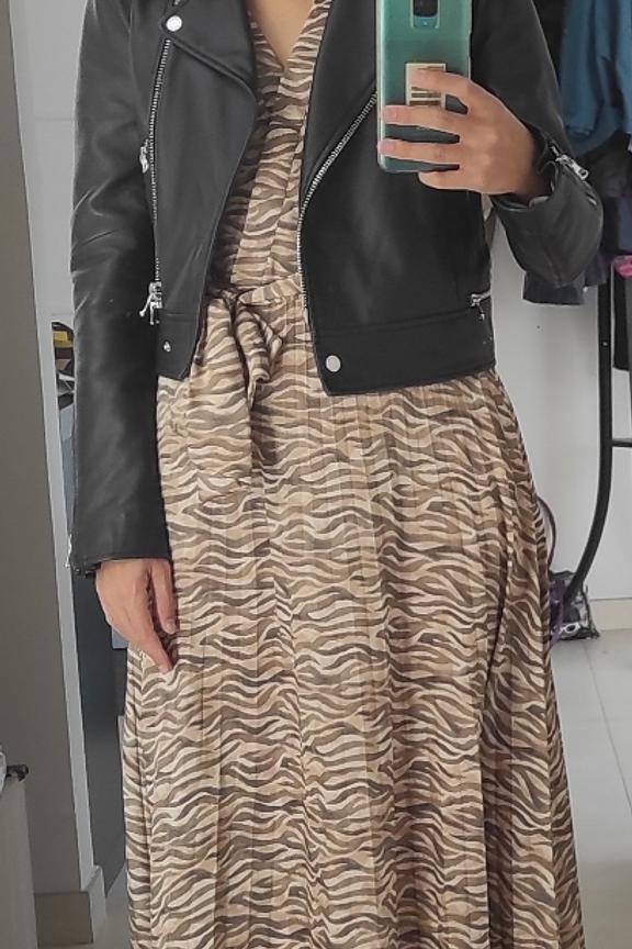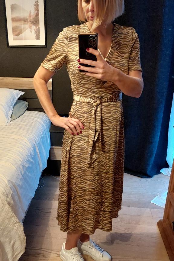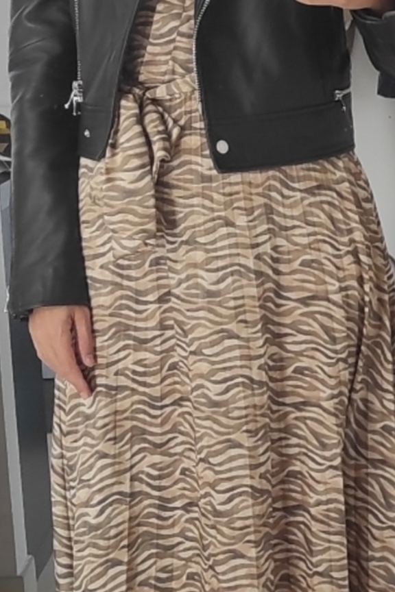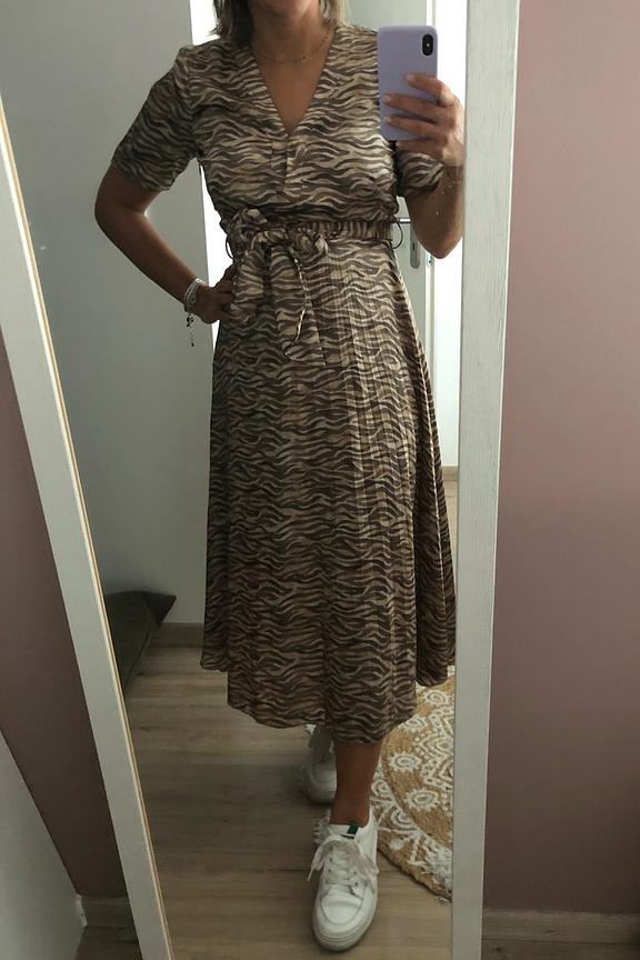 โ€ข Robe longue ร  imprimรฉ zรฉbrรฉ โ€ข Jupe plissรฉe โ€ข Taille cintrรฉe avec ceinture ร  nouer โ€ข Col V effet cache-coeur โ€ข Manches courtes โ€ข Tissu en polyester 100% recyclรฉ