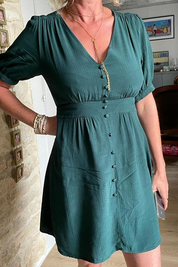 โ€œCe vert bouteille est superbe. La coupe est parfaite pour moi. Dommage la couture du devant qui descend jusquโ€™au bas de la robe, moyennement esthรฉtique je trouve. Le tissu pourrait รชtre de meilleure qualitรฉ mais elle fait son effet.โ€