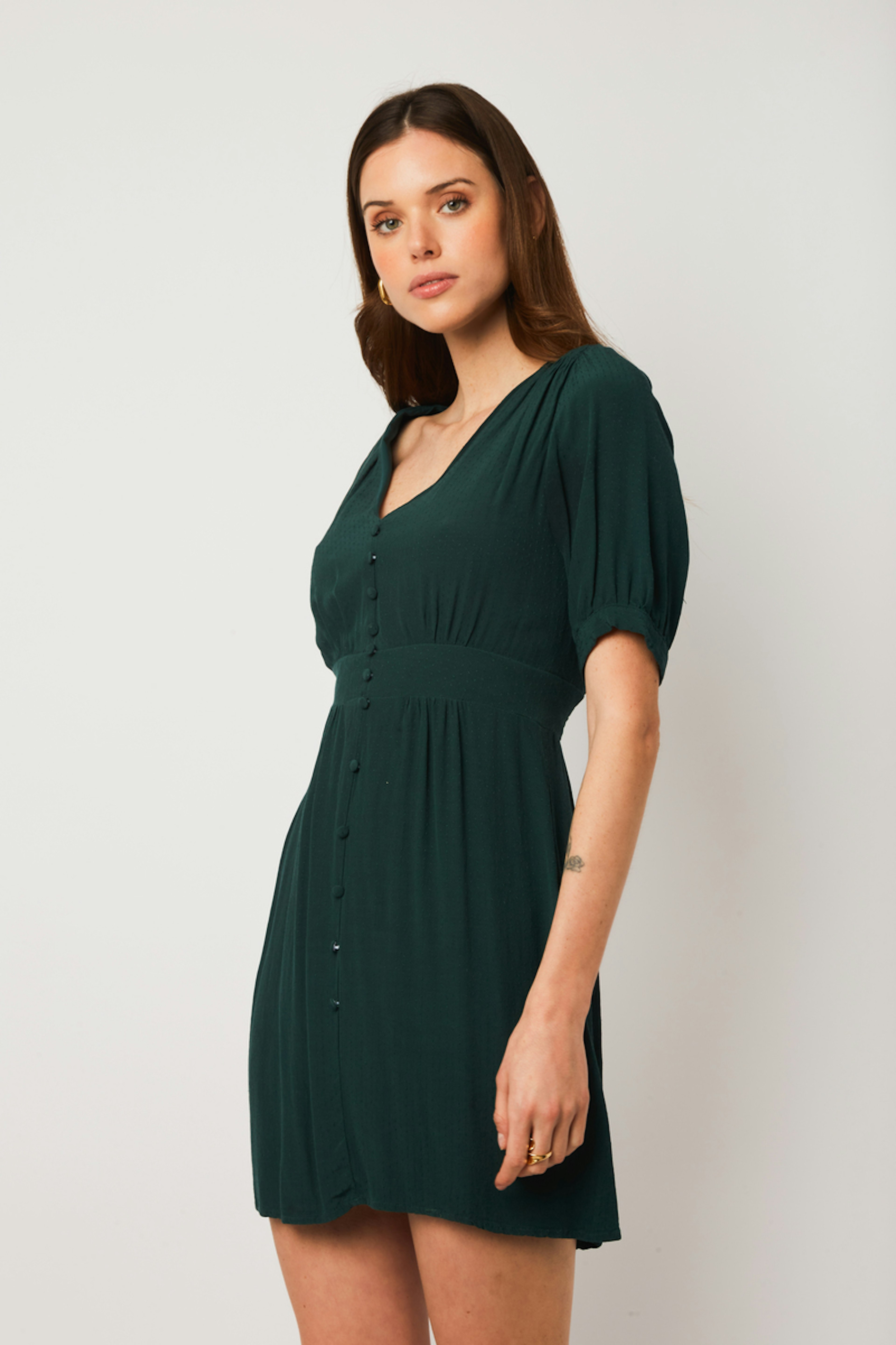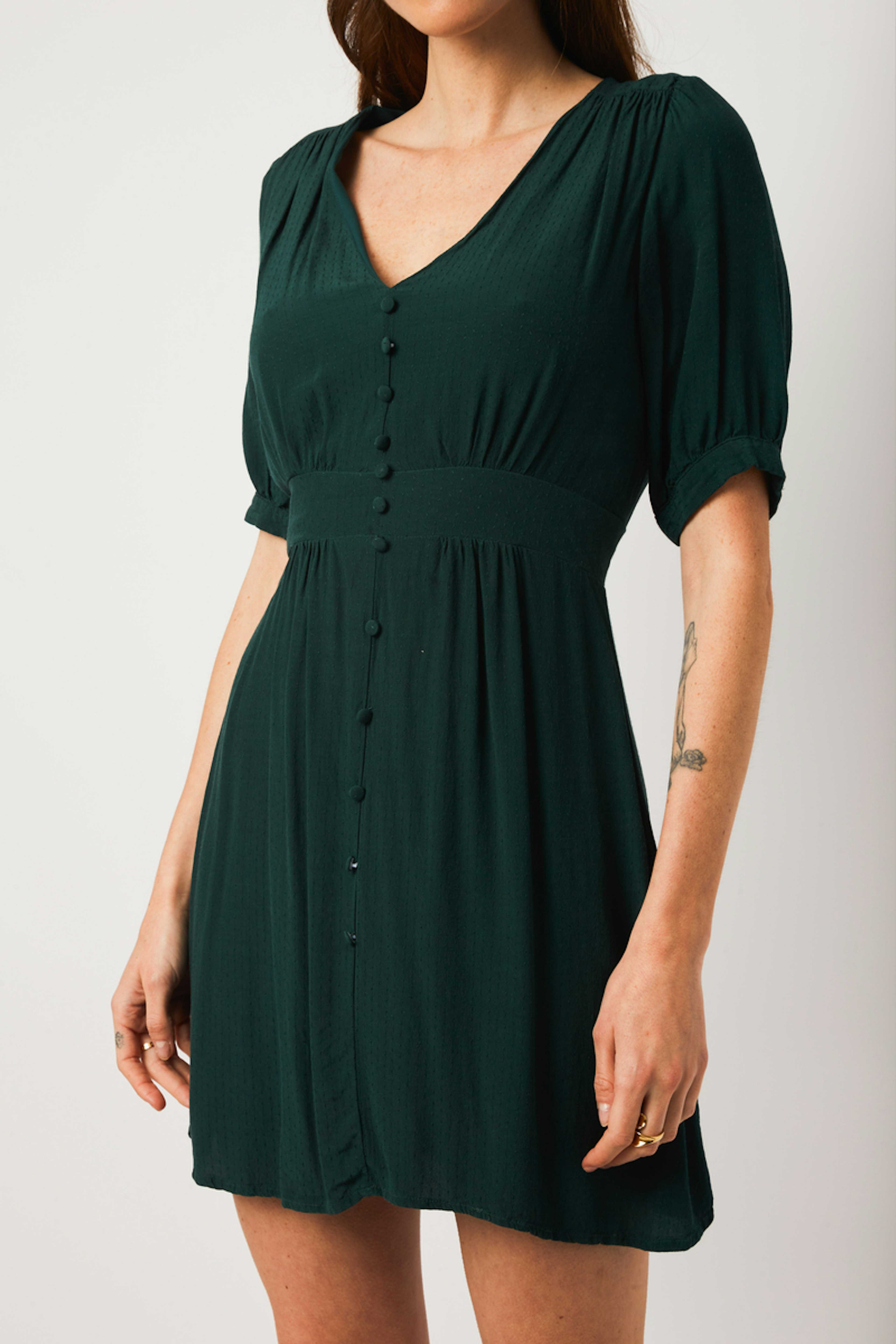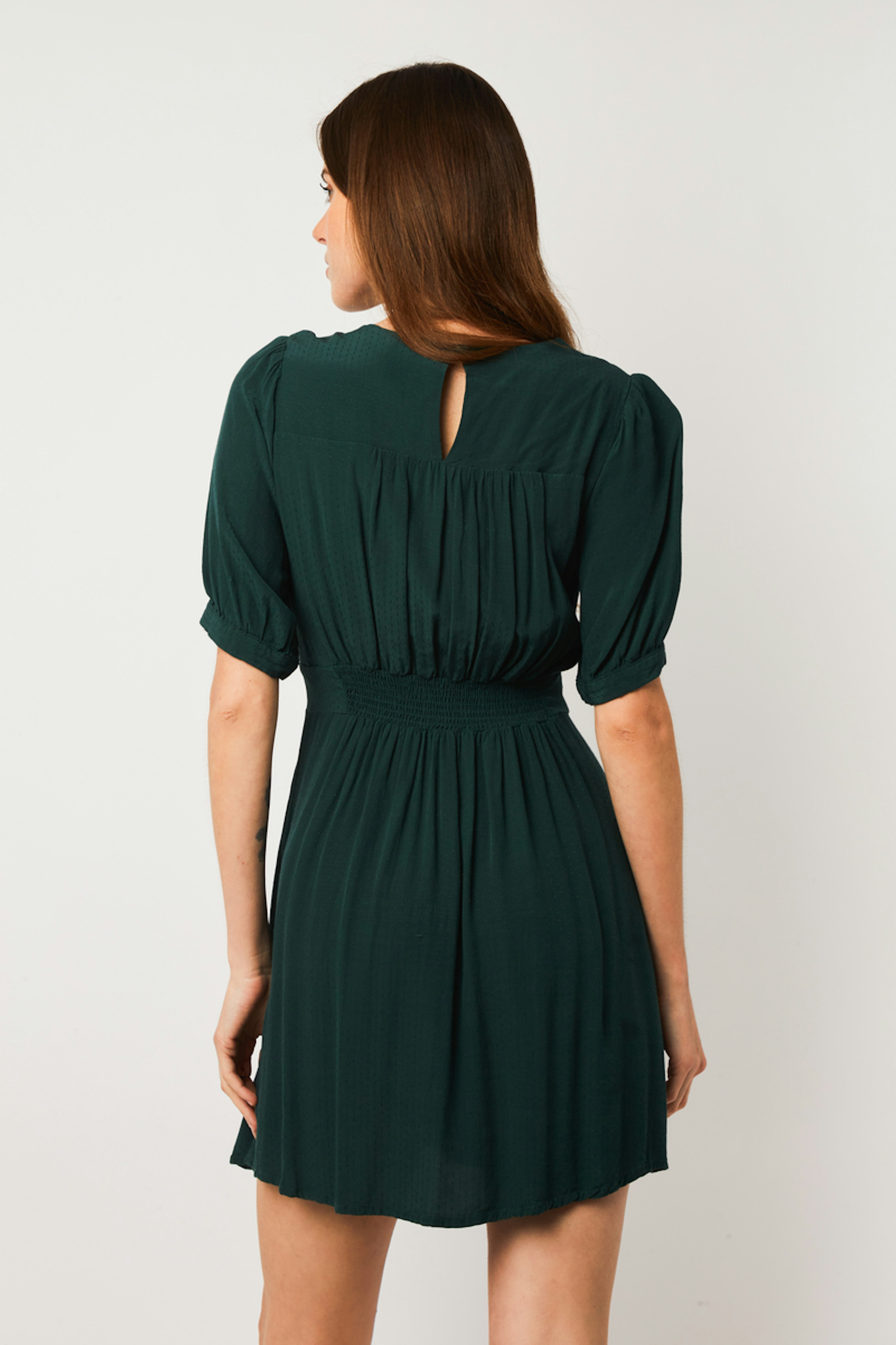 โ€ข Robe courte fluide โ€ข Encolure en V โ€ข Manches courtes โ€ข Fronces aux รฉpaules, dos, poitrine et ร  la taille โ€ข Goutte dans le dos fermรฉe par un bouton โ€ข Faux boutonnage intรฉgral devant โ€ข Boutons en tissu ton sur ton โ€ข Taille dos รฉlastiquรฉe