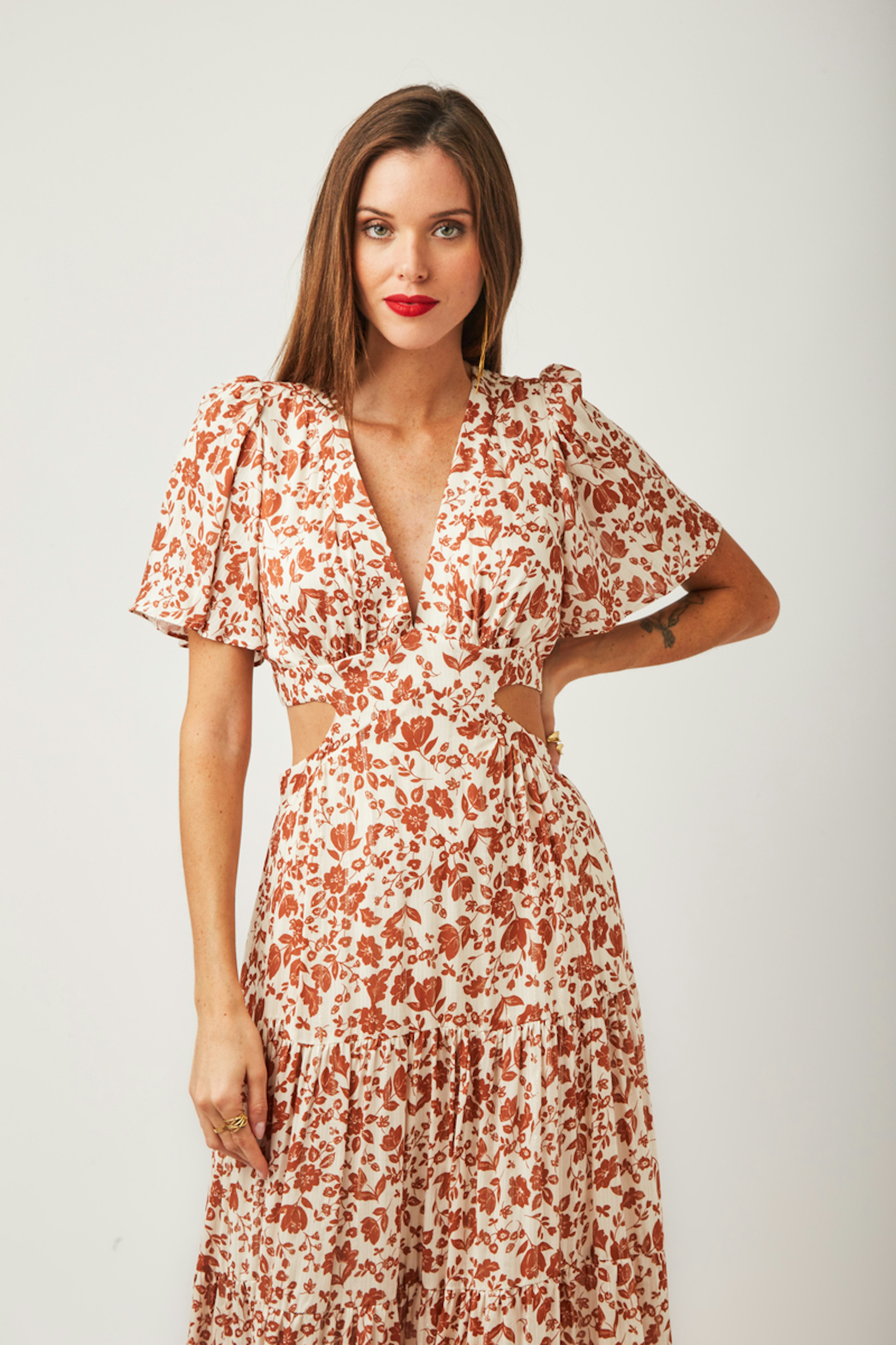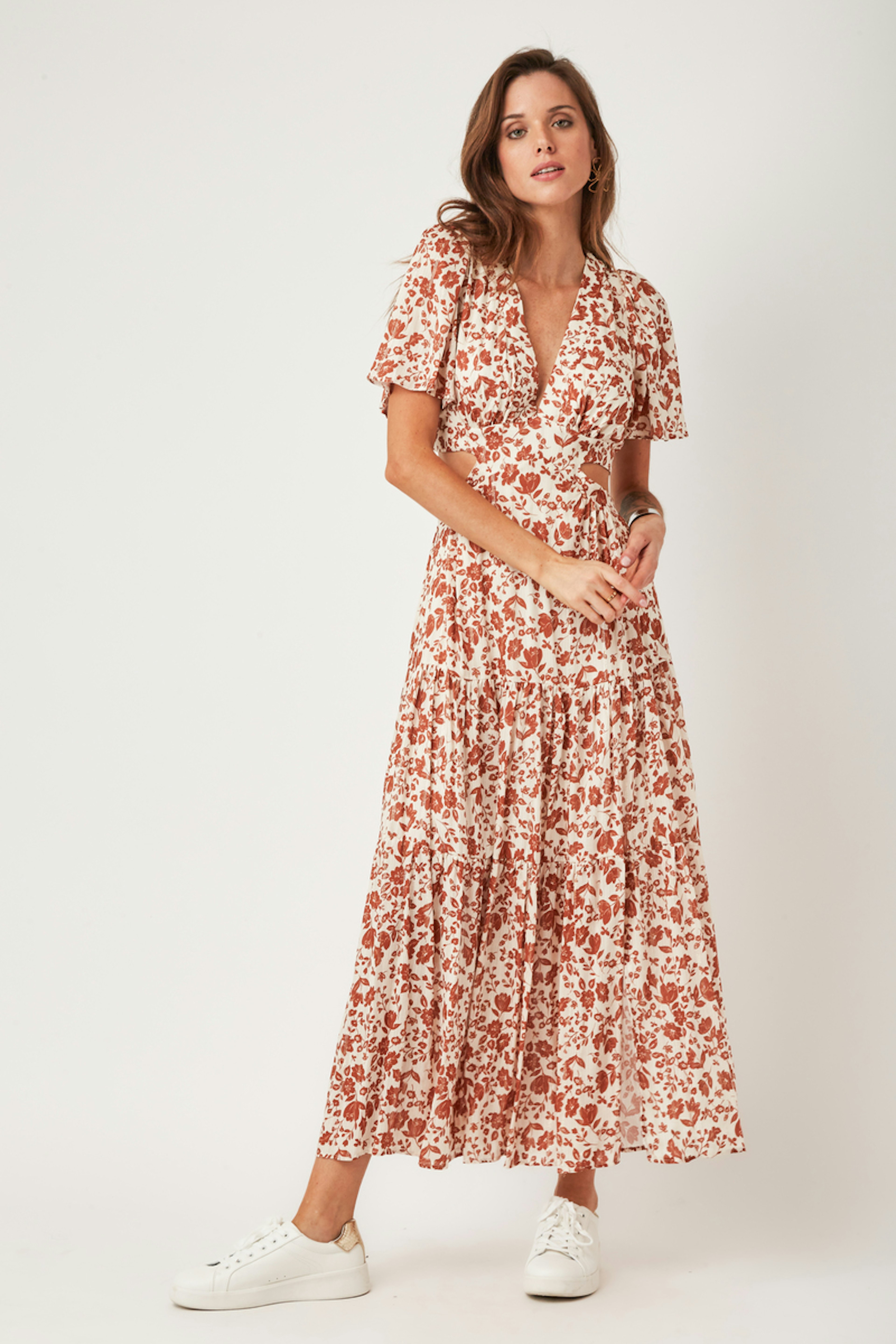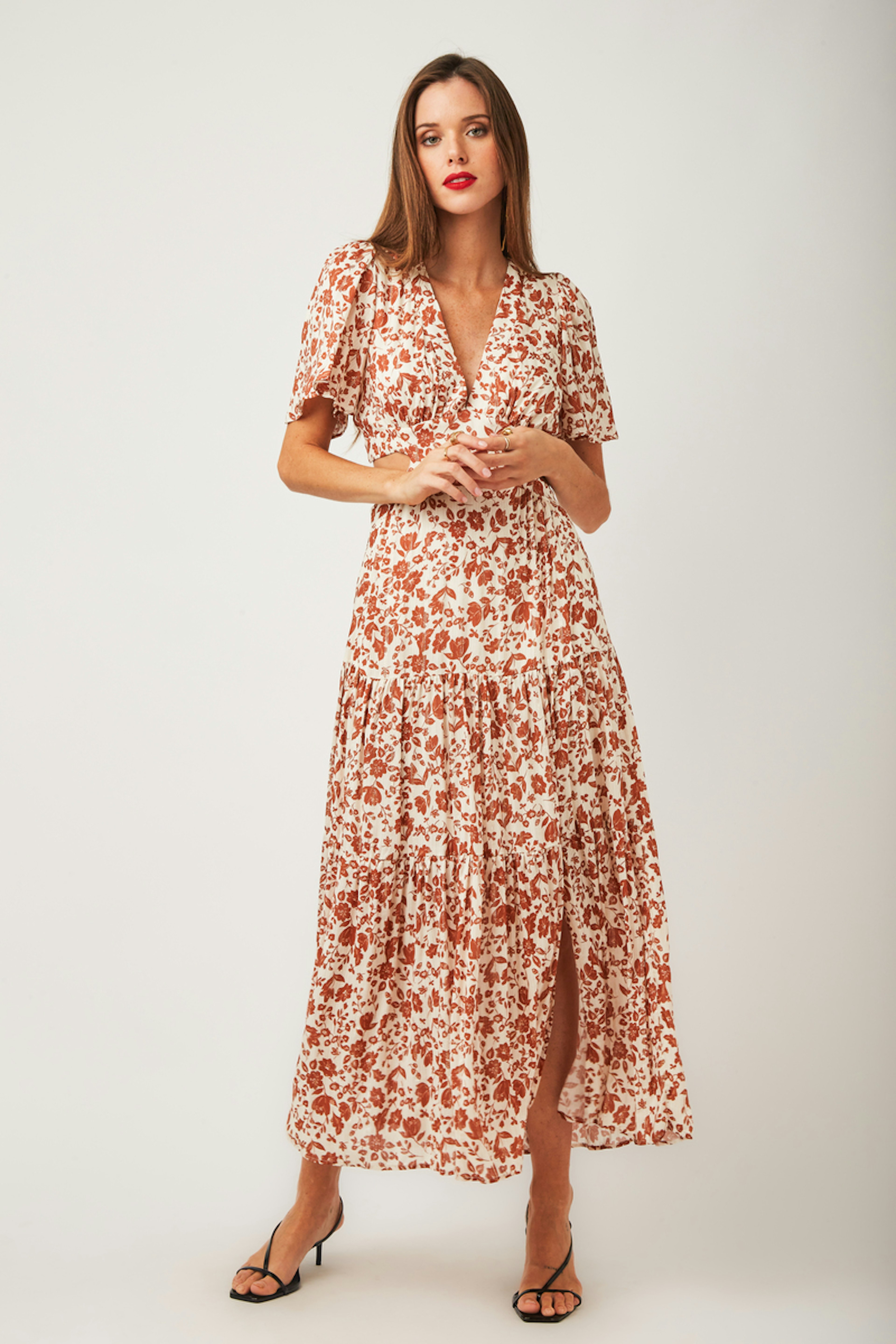 โข Robe longue Nelly โข Manches courtes โข Dรฉcolletรฉ en V โข Motif floral โข Ouvertures sur les cรดtรฉs