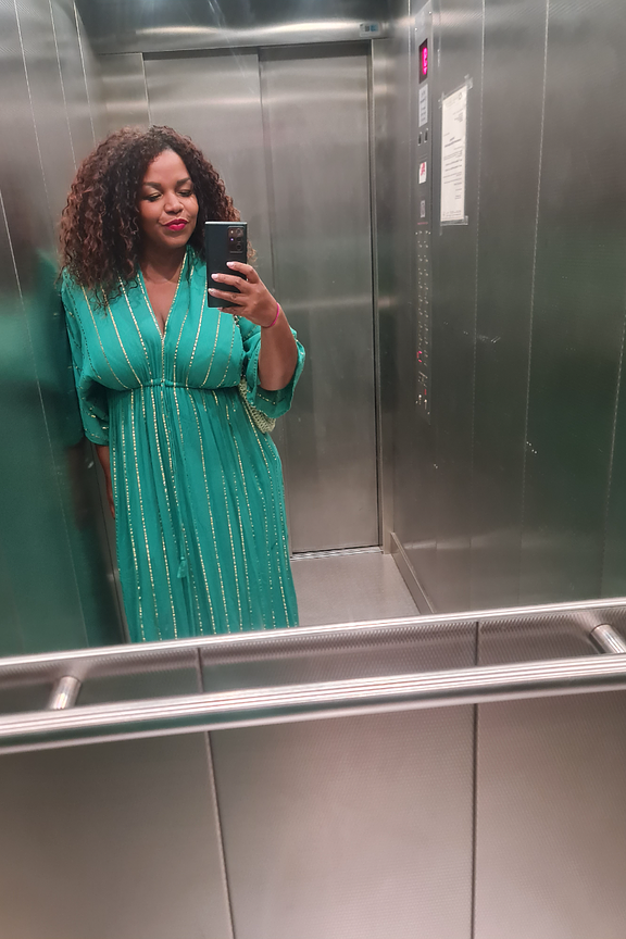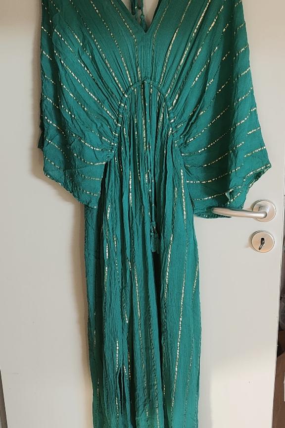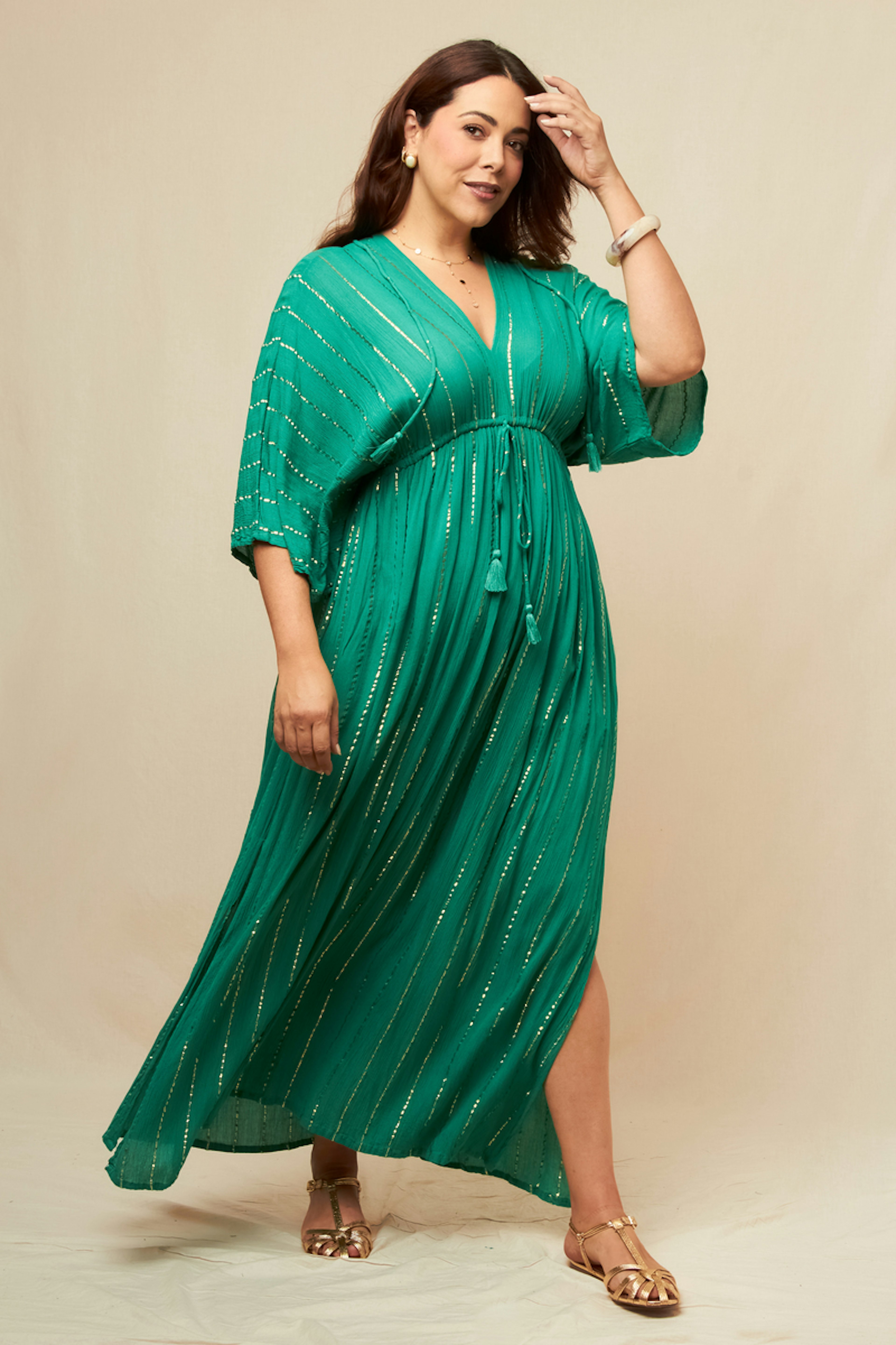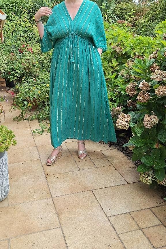 Portez cette robe fluide avec des sandales dorées et des boucles d'oreilles pendantes pour une touche d'élégance en toute saison. • Robe longue fluide • Manches chauve-souris amples • Décolleté en V flatteur • Taille élastiquée avec lien à nouer • Motif rayures