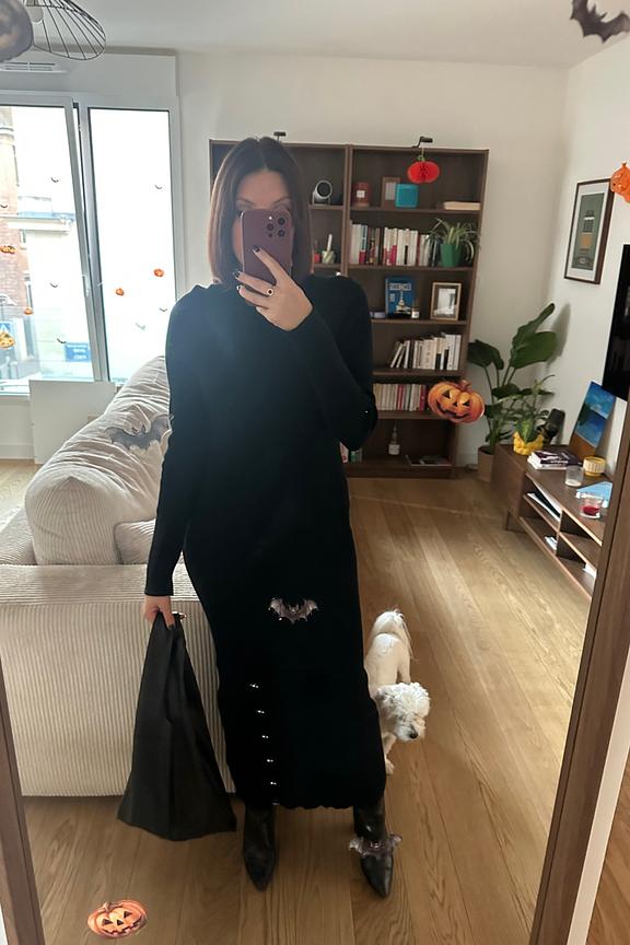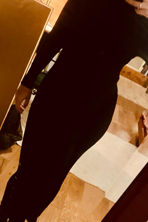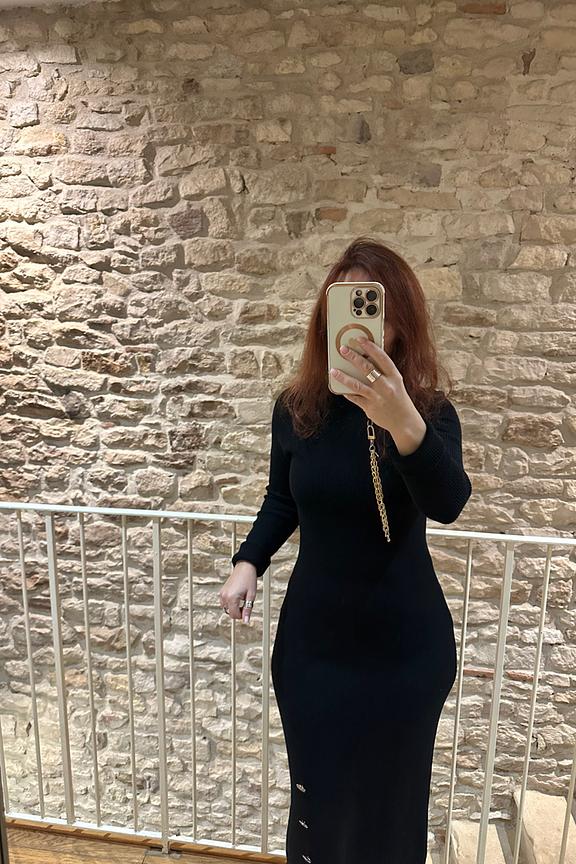 Optez pour des boucles d'oreilles métalliques et des bottines pour un style chic en hiver. • Robe longue noir • Col montant • Manches longues • Coupe ajustée • Pattes de boutonnage sur le côté