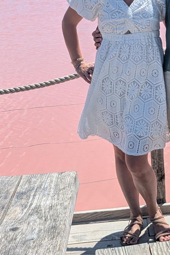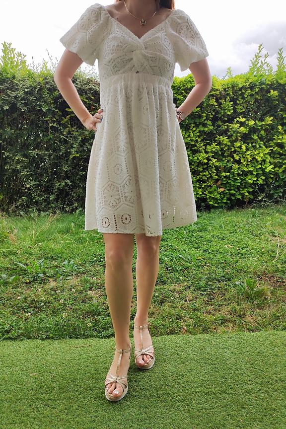 Associez cette superbe robe avec des sandales en cuir clair et un chapeau en paille pour une élégance estivale. • Robe courte en dentelle • Décolleté en V • Manches courtes • Taille cintrée • Motif géométrique
