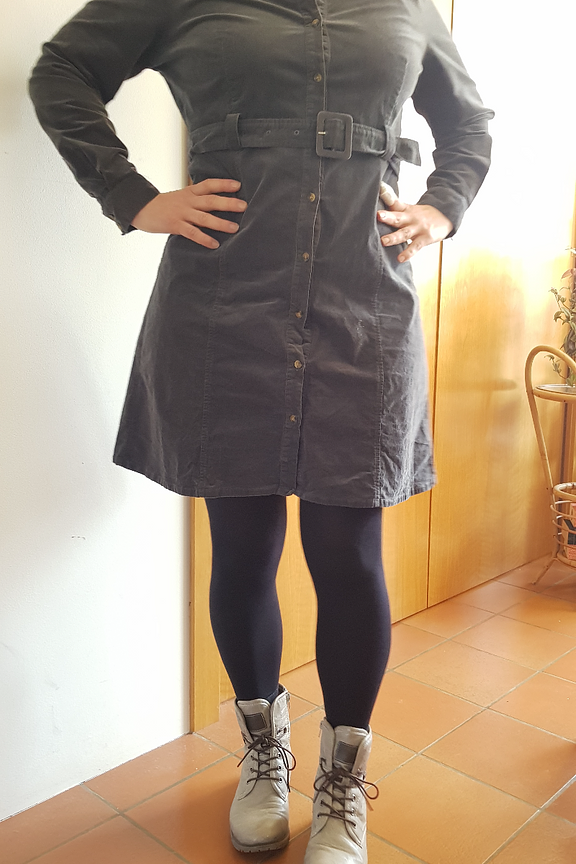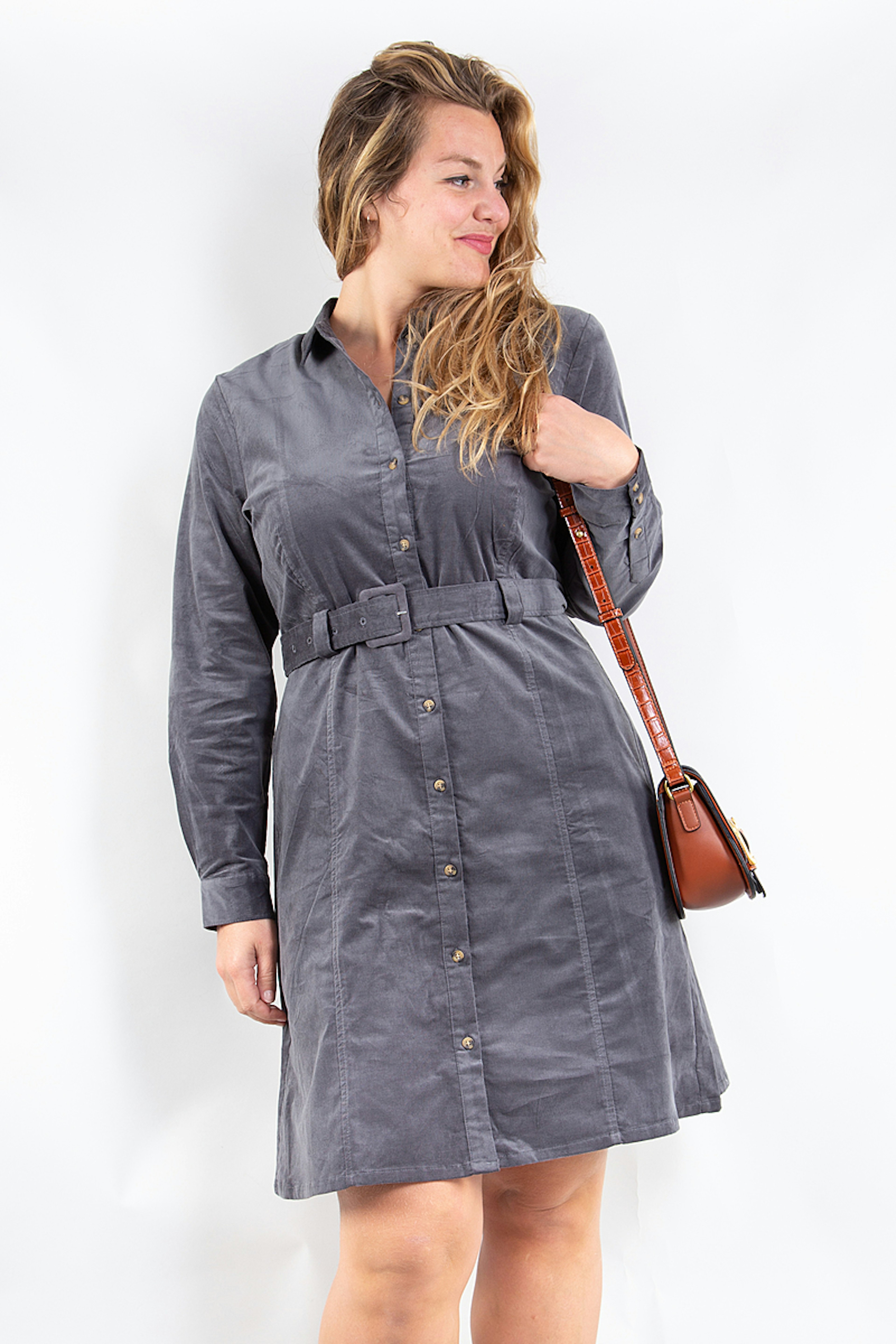 โข Robe courte en velours cรดtelรฉ gris โข Manches longues โข Patte de boutonnage โข Taille resserrรฉe ร l'aide d'une ceinture