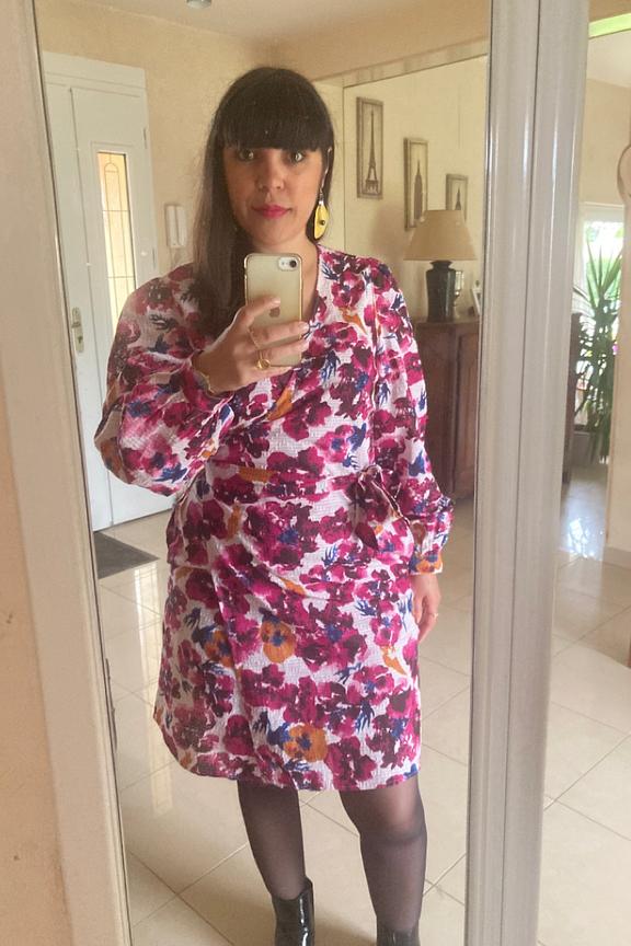 โJโadore ! Les couleurs sont belles, le dรฉcolletรฉ pas trop plongeant. Le seul dรฉfaut cโest que lorsquโon est assise elle sโouvre un peu trop, comme souvent pour les robes portefeuilles.โ