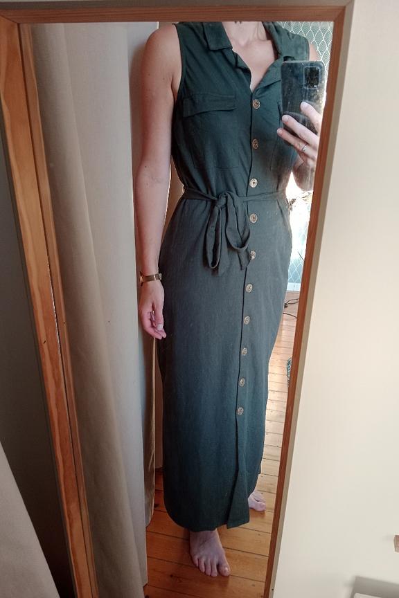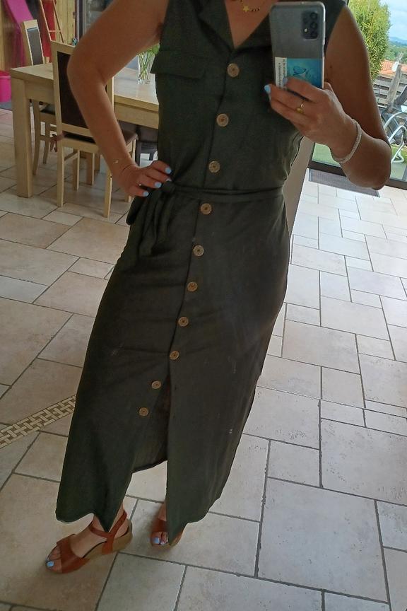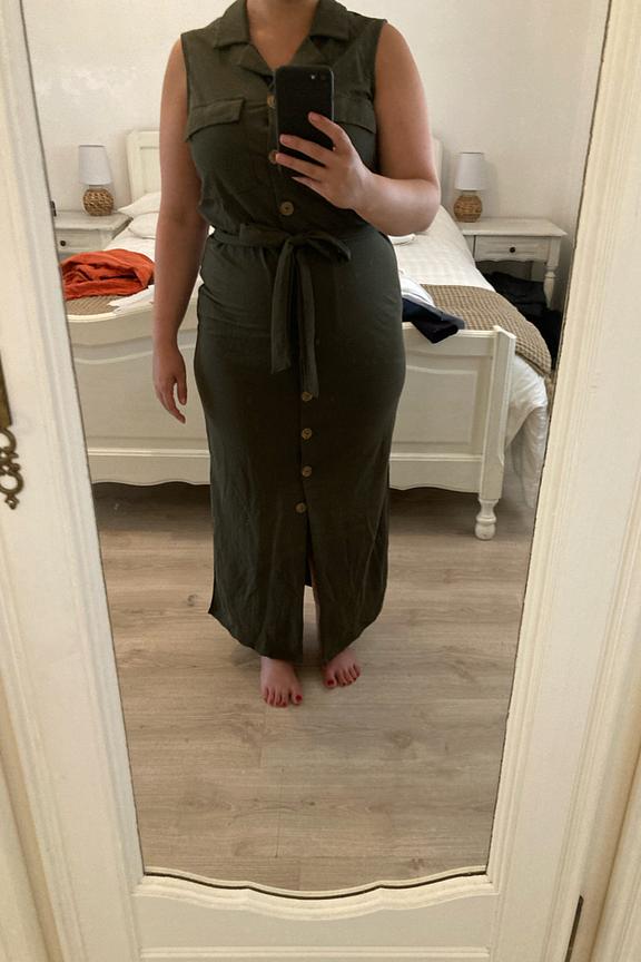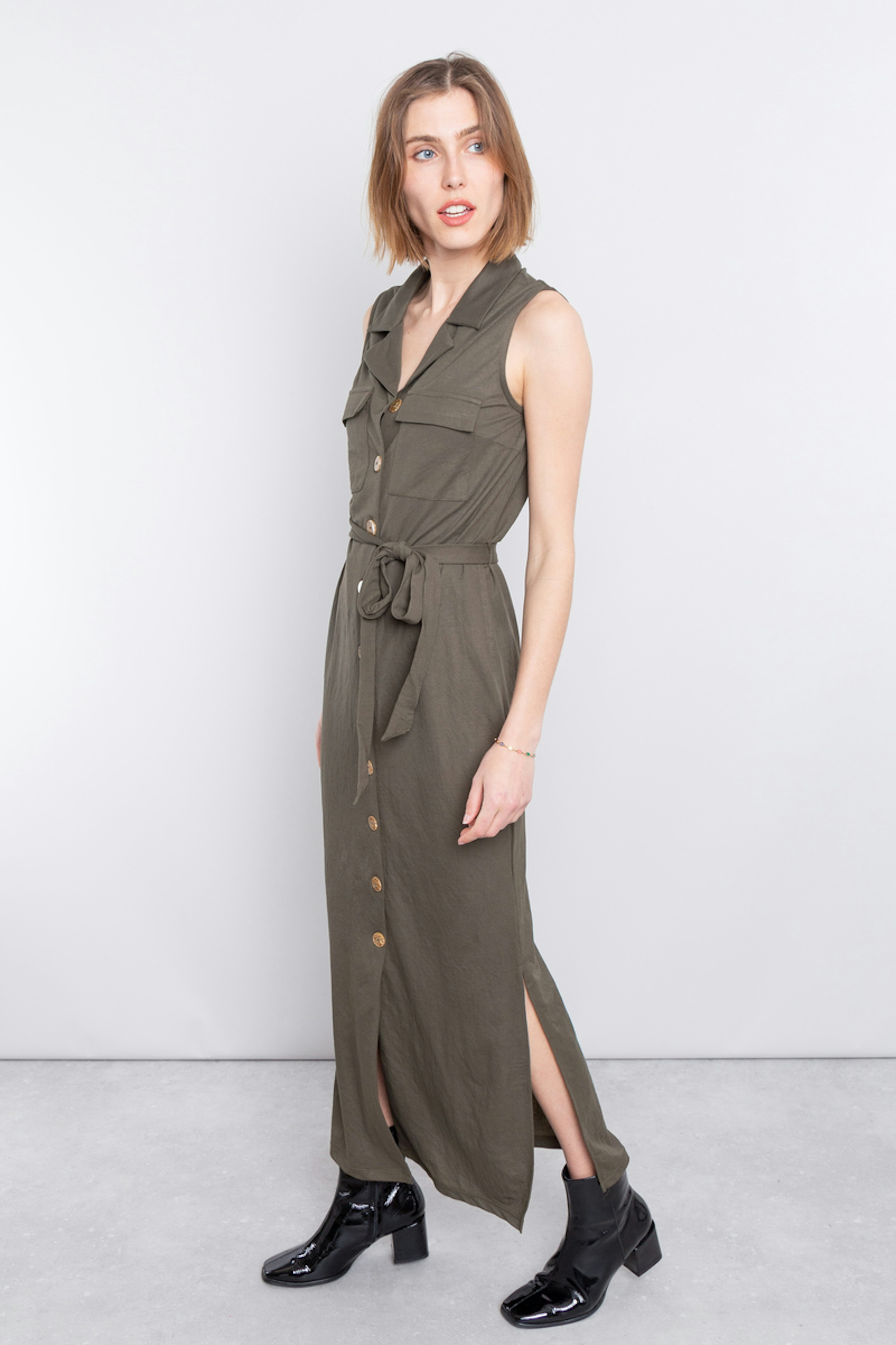 โข Robe longue kaki โข Col crantรฉ โข Sans manches โข Poches plaquรฉes ร la poitrine โข Boutons sur le devant โข Taille cintrรฉe avec ceinture