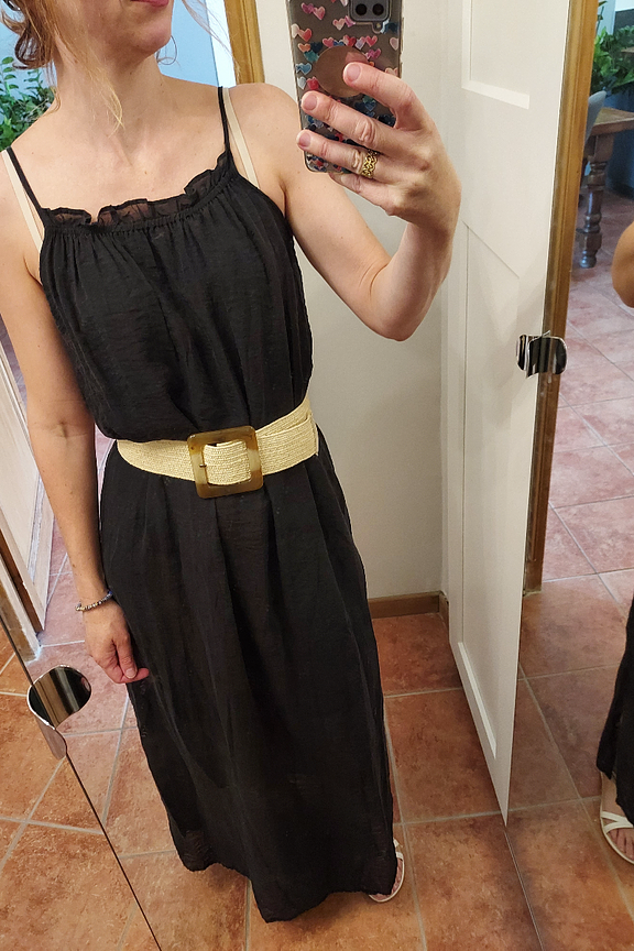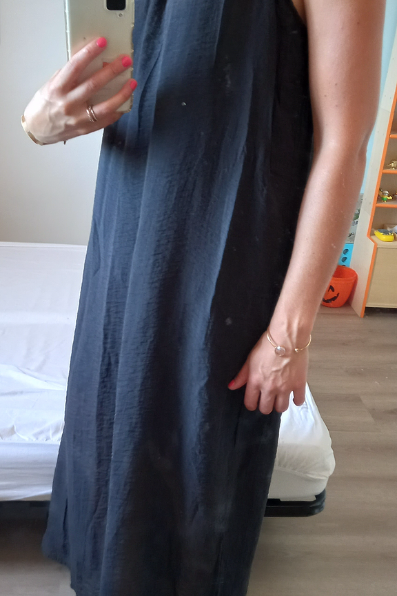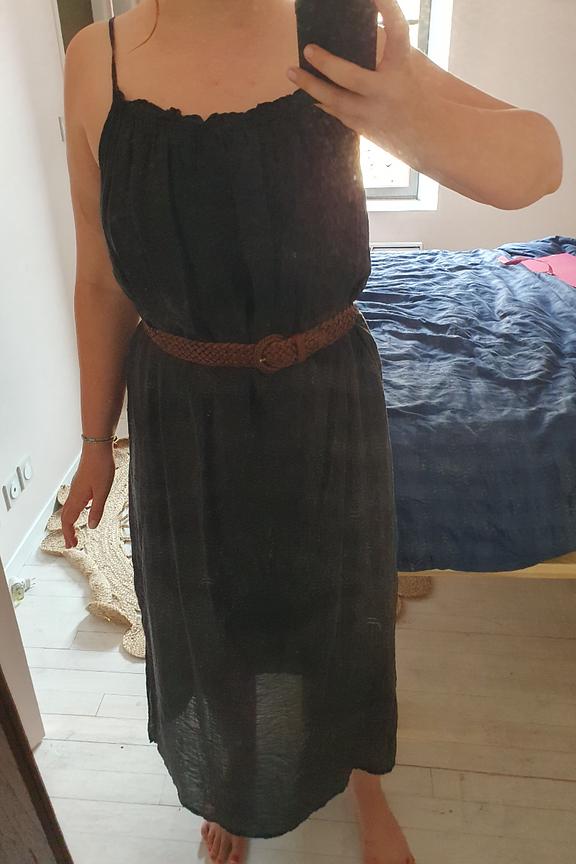 โข Robe longue noire style caraco โข Fines bretelles โข Col rond รฉlastiquรฉ โข Tissu doux et confortable contenant 80% de tencel