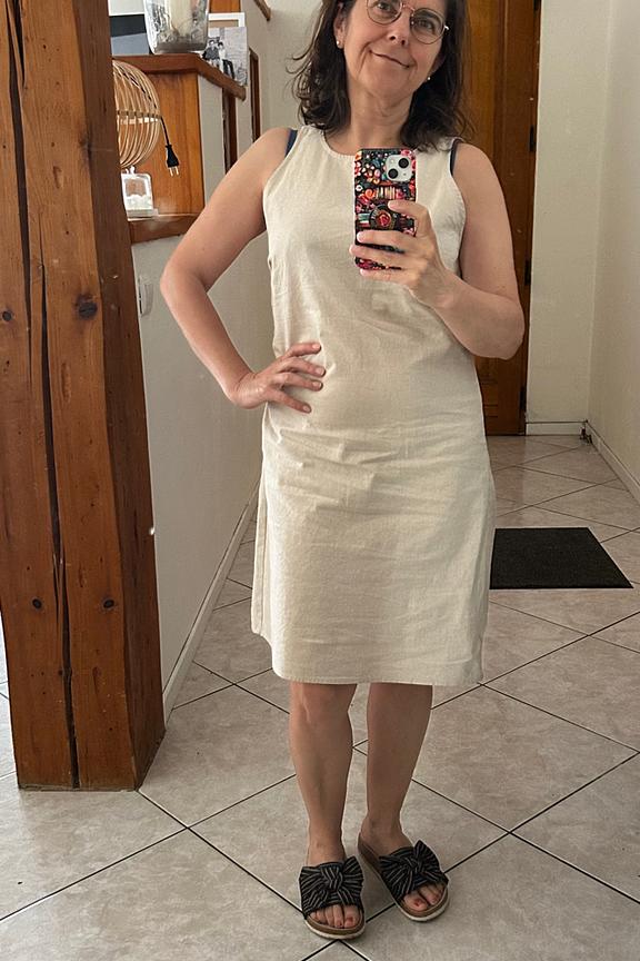 Ajoutez une paire de sandales dorées et un sac en raphia pour un look estival et élégant. • Robe trapèze en lin et coton biologique • Coupe sans manches • Col rond • Longueur courte • Fermeture éclair au dos