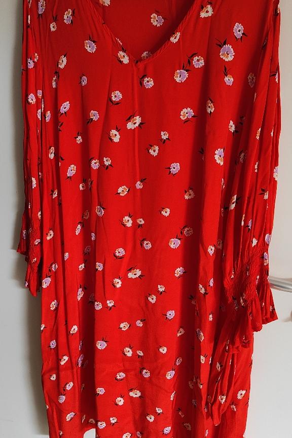 โข Robe courte rouge ร imprimรฉs fleuris blancs โข Tissu fluide effet satinรฉ โข Col en V โข Manches 3/4 avec ourlets รฉlastiques et dรฉtails de fronces