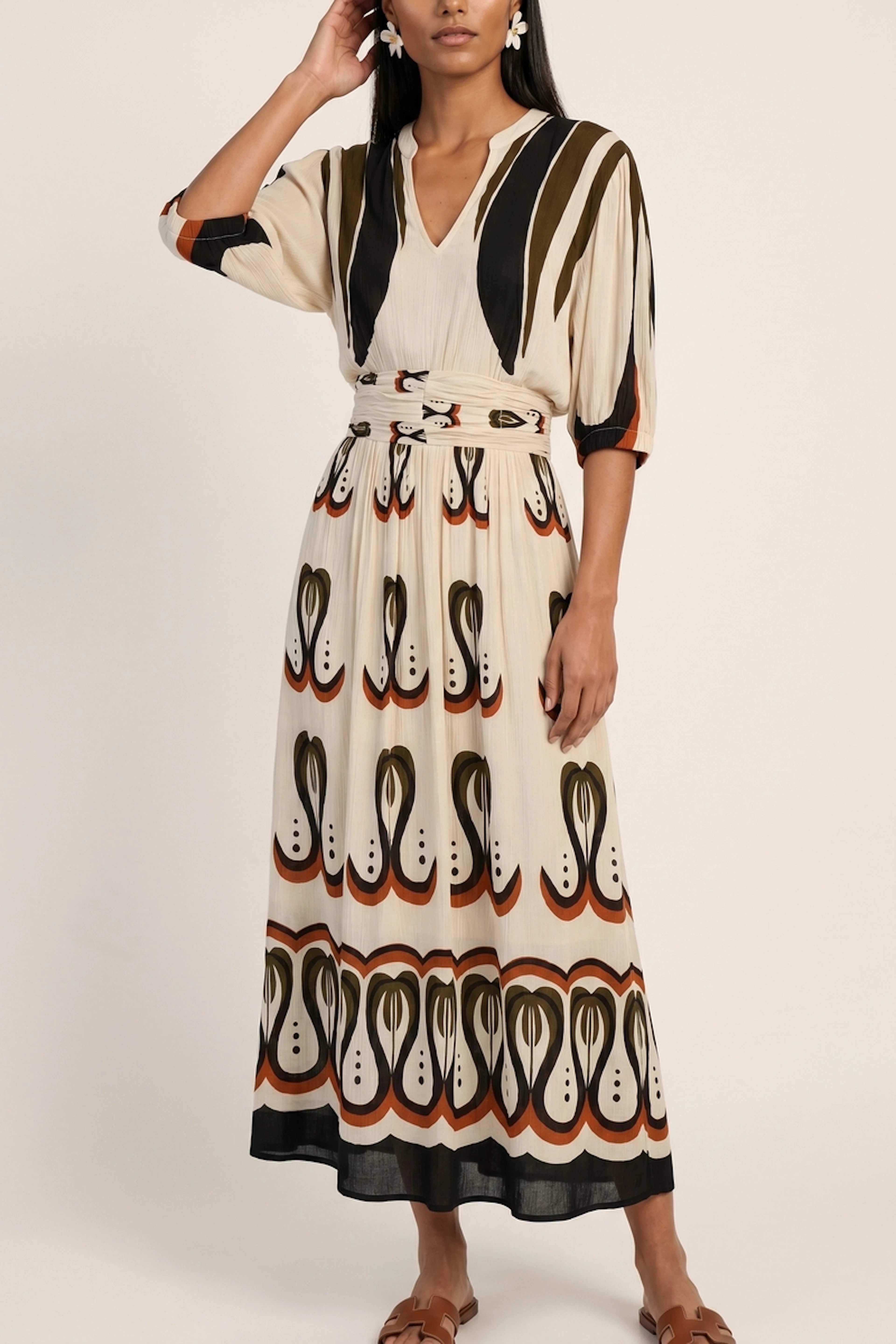 Associez cette robe avec des sandales en cuir et des boucles d'oreilles pendantes pour une allure estivale élégante. • Robe longue en viscose • Manches trois-quarts amples • Taille cintrée • Décolleté en V • Motif graphique