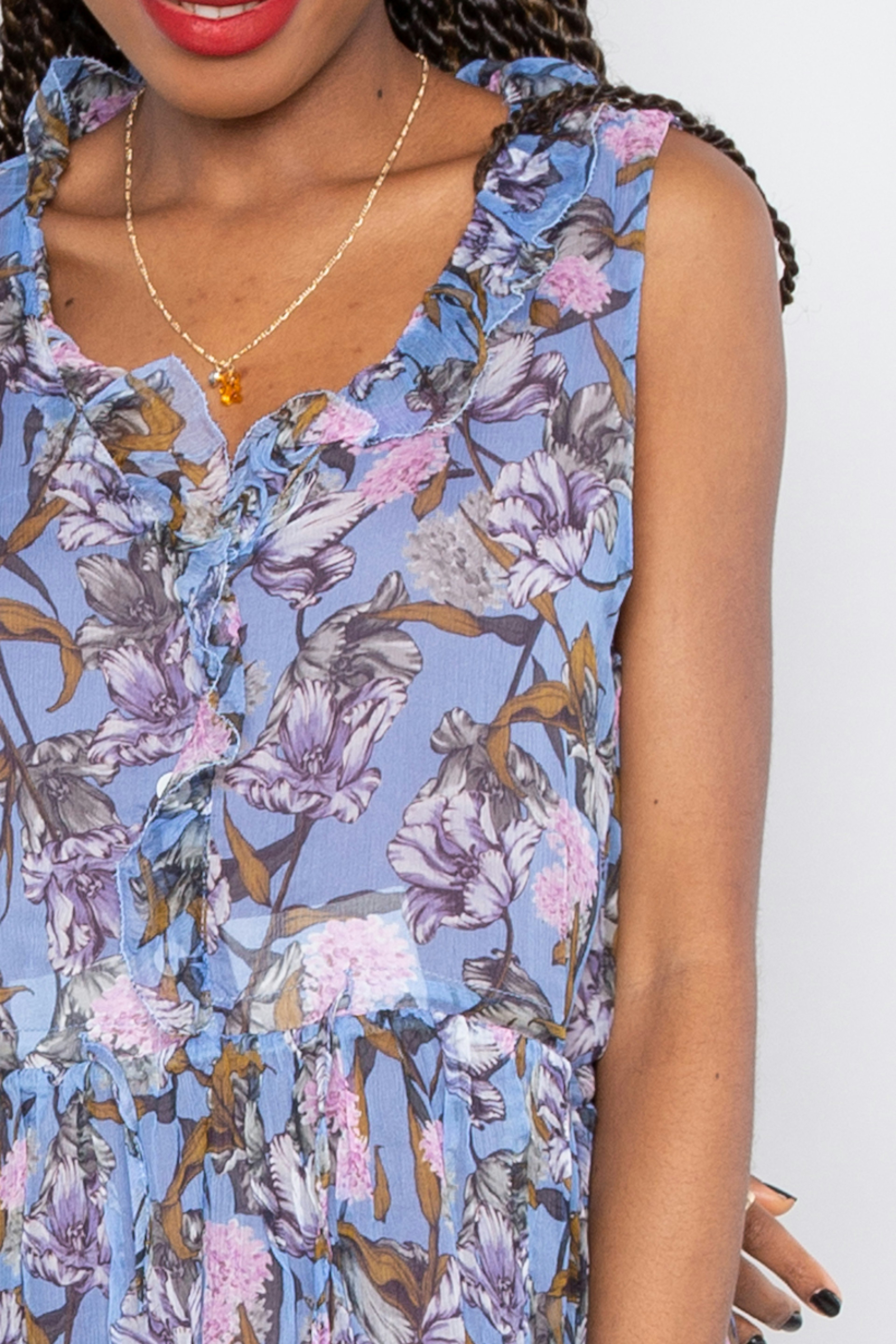 โข Robe en voile de soie lรฉgรจre sans manches avec notre imprimรฉ Blue Flowers โข Encolure en V bordรฉe d'un dรฉlicat volant โข Taille joliment cintrรฉe grรขce ร un lien ร nouer sur le devant