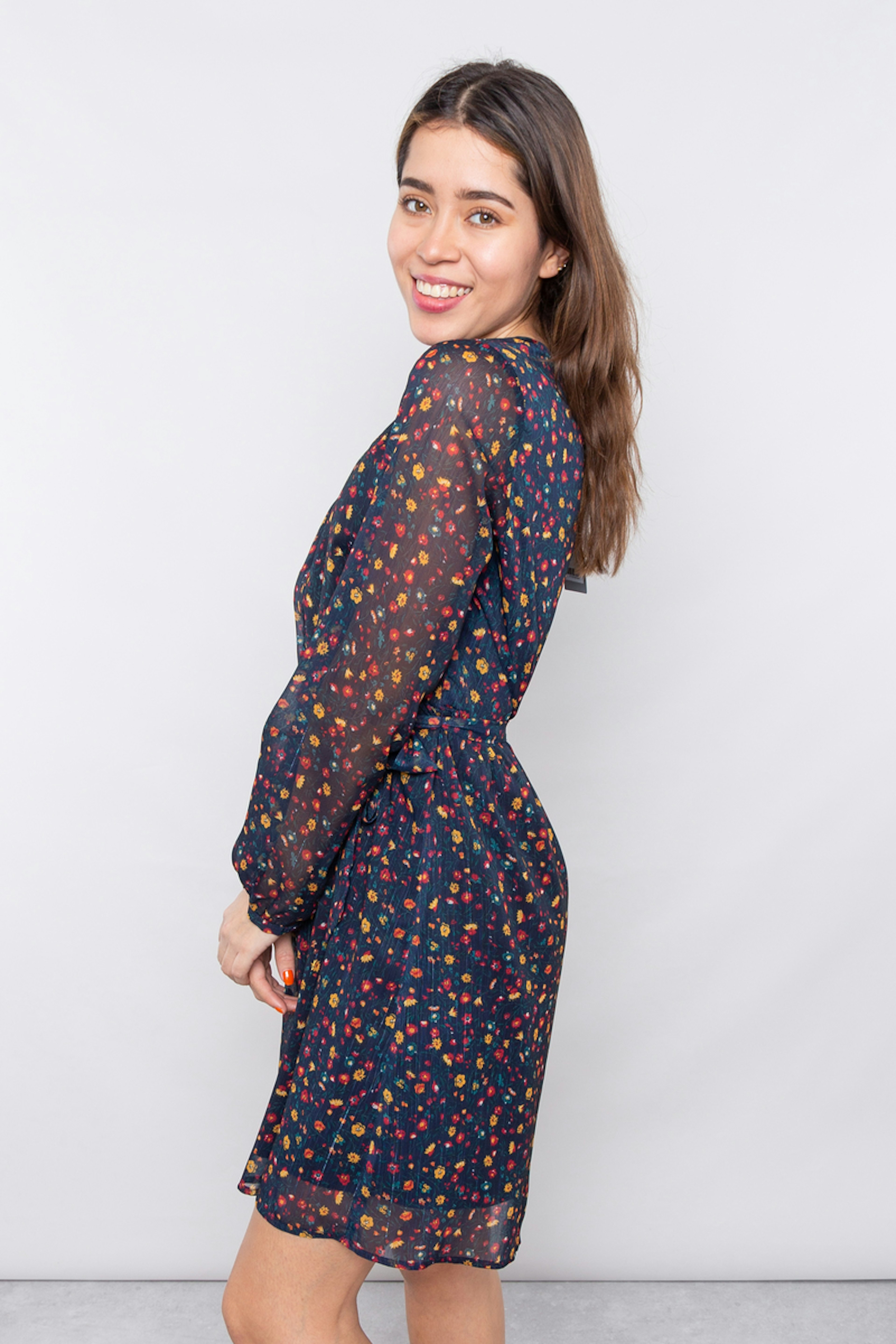 - Robe en voile imprimรฉ ornรฉ de fils de lurex - Doublure unie - Manches longues resserrรฉes - Col V