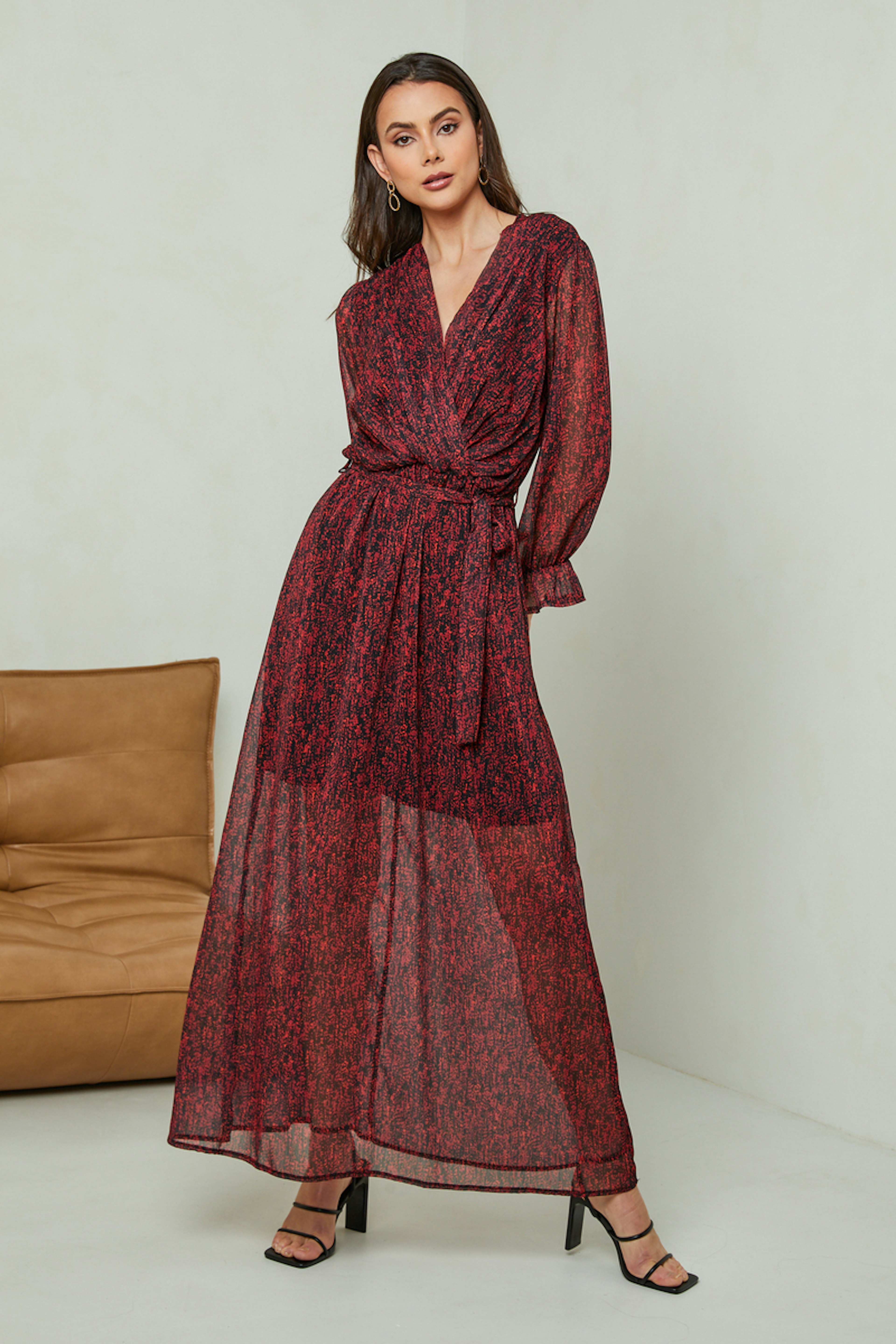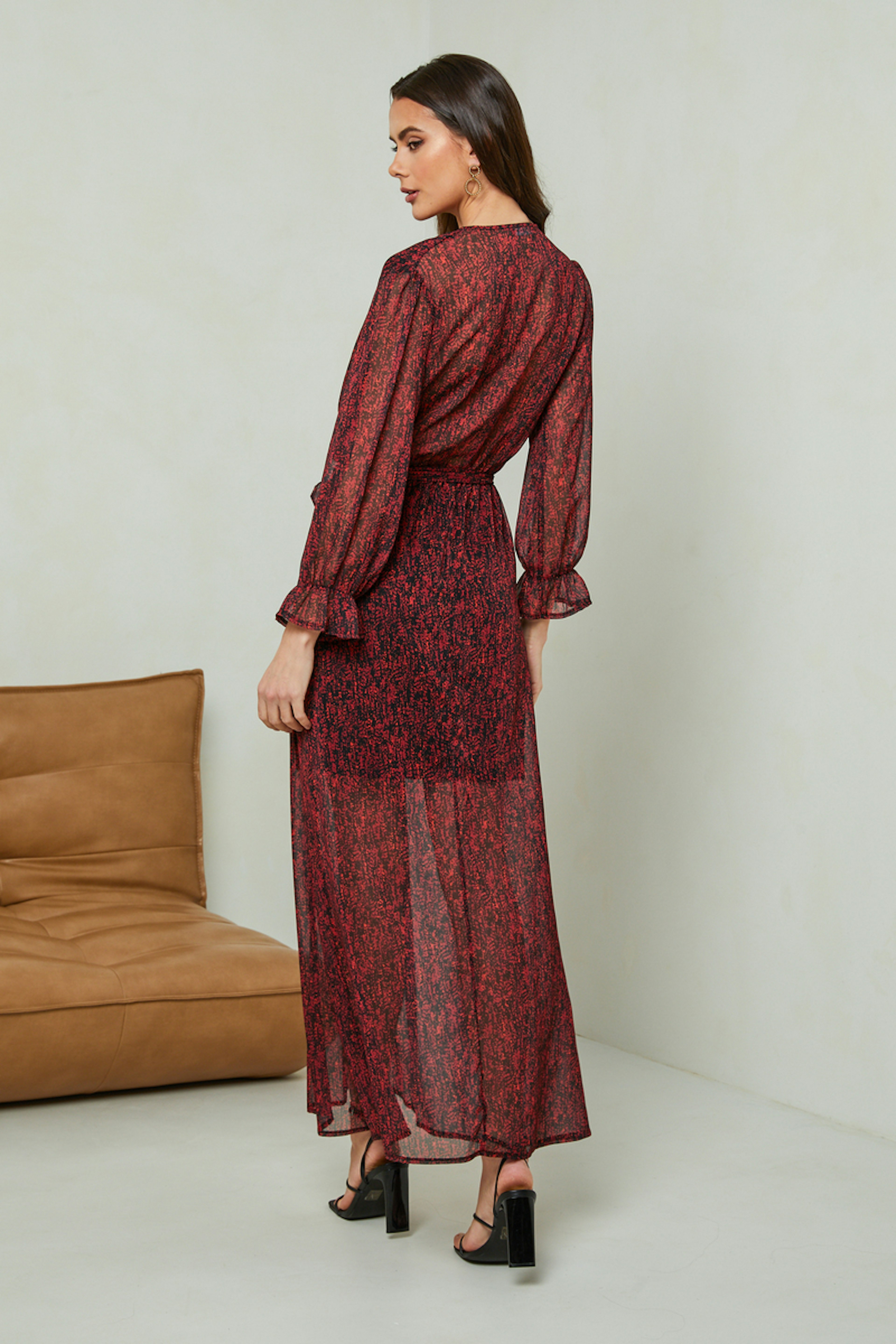 โ Fabrication Franรงaise ๐ซ๐ท โ Robe longue portefeuille โ Manches fluides transparentes resserrรฉes aux poignets โ Volants aux poignets โ Dรฉcolletรฉ en V - Doublure courte Le mannequin mesure 1m78 et porte une taille S