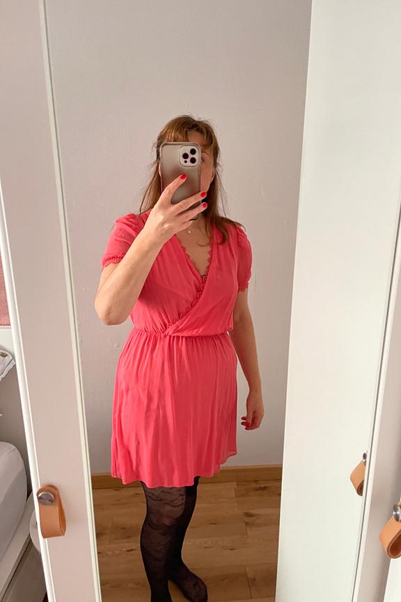 Pour une allure estivale, associez cette robe corail avec des sandales dorรฉes et un sac en osier. Parfaite pour toute saison. โข Robe courte รฉlรฉgante corail โข Dรฉcolletรฉ en V croisรฉ โข Manches avec dentelle โข Taille รฉlastiquรฉe โข Empiรจcements en dentelle au niveau du dรฉcolletรฉ et des manches โข Longueur genou