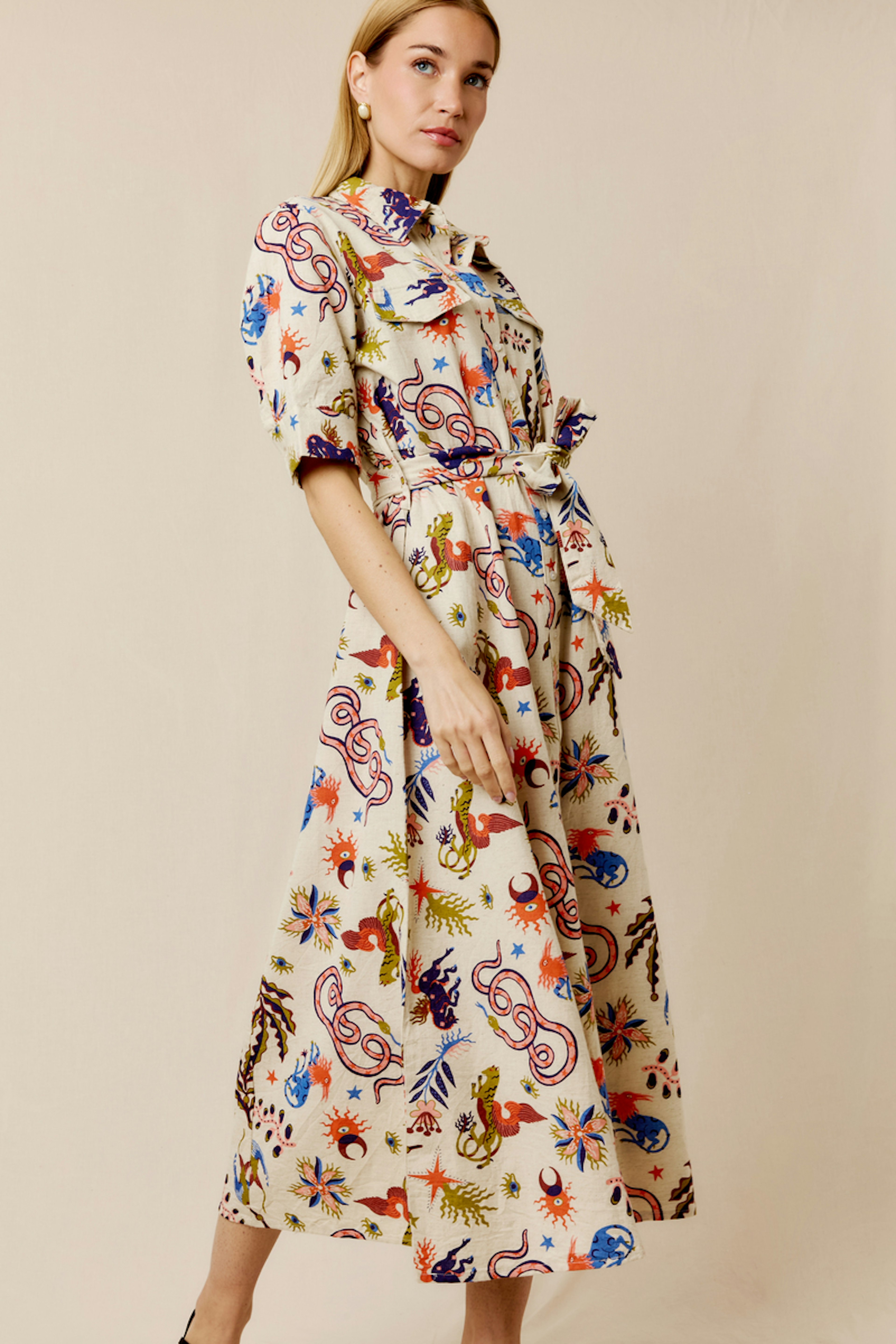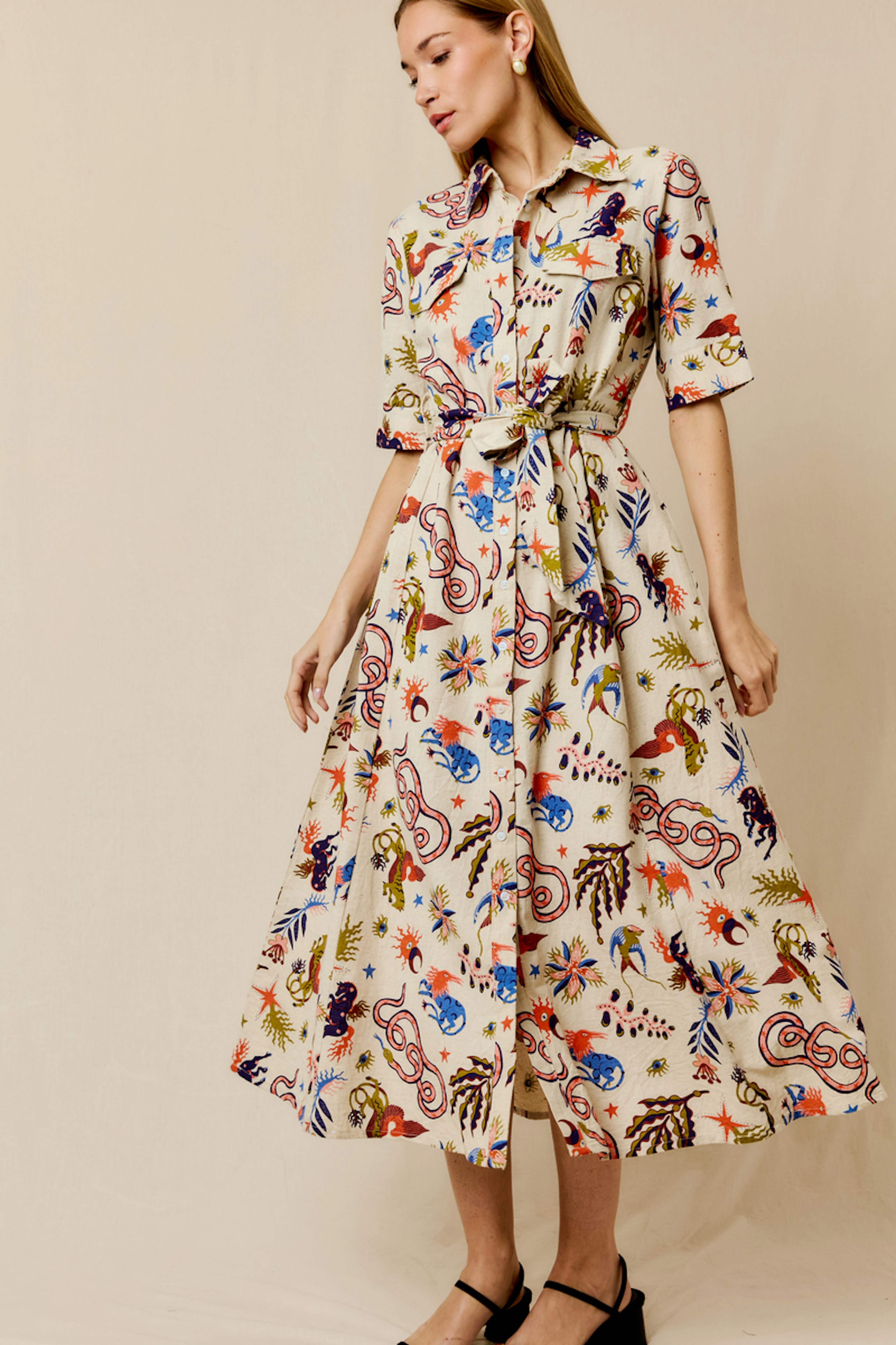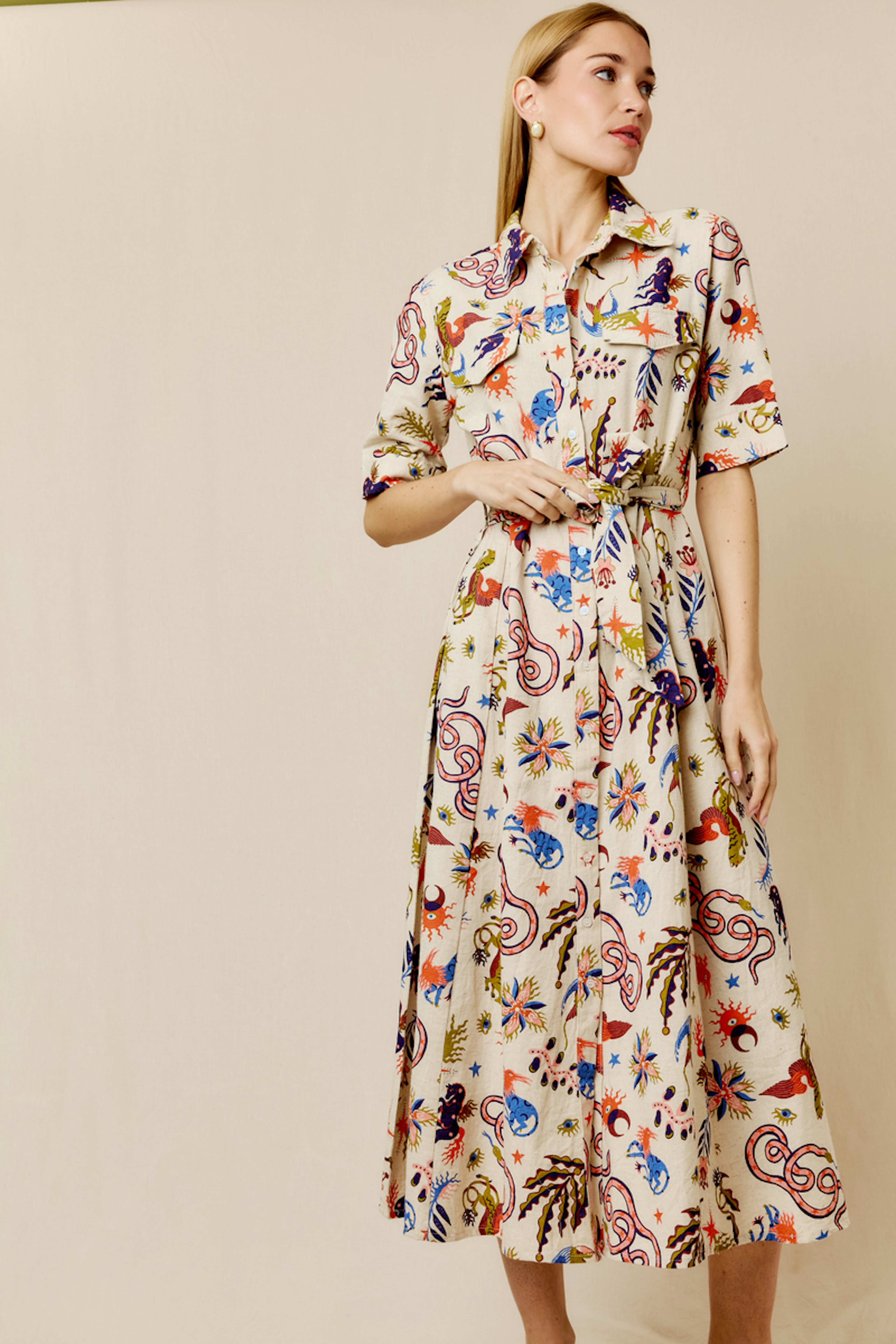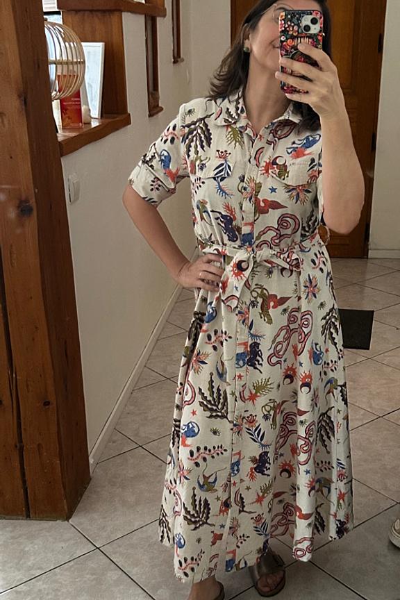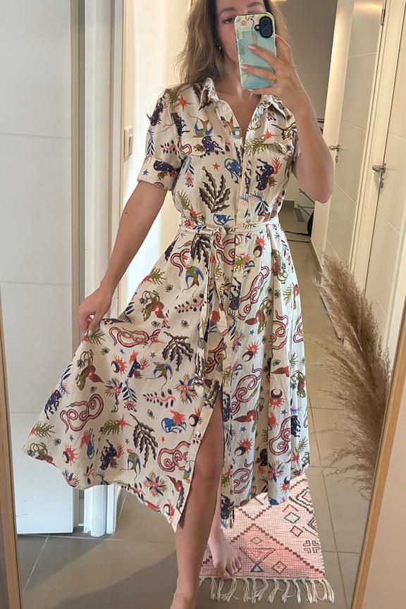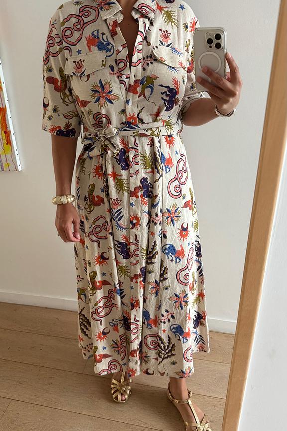 Associez cette robe imprimée avec des bottines en cuir et un cardigan épais pour un look chic hivernal. • Robe longue en coton et lin • Ceinture à nouer à la taille • Col chemise structuré • Manches courtes • Motif imprimé vivant