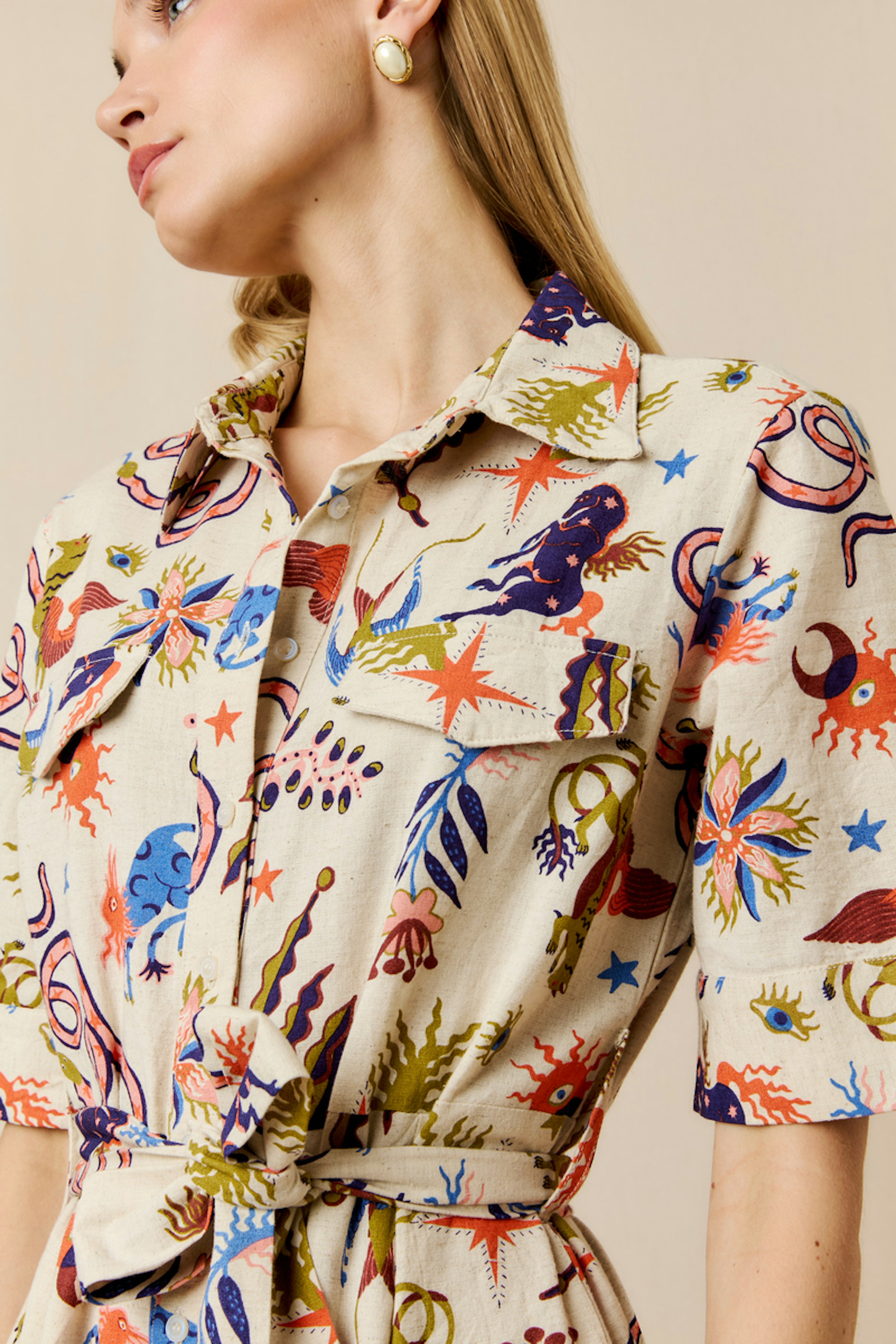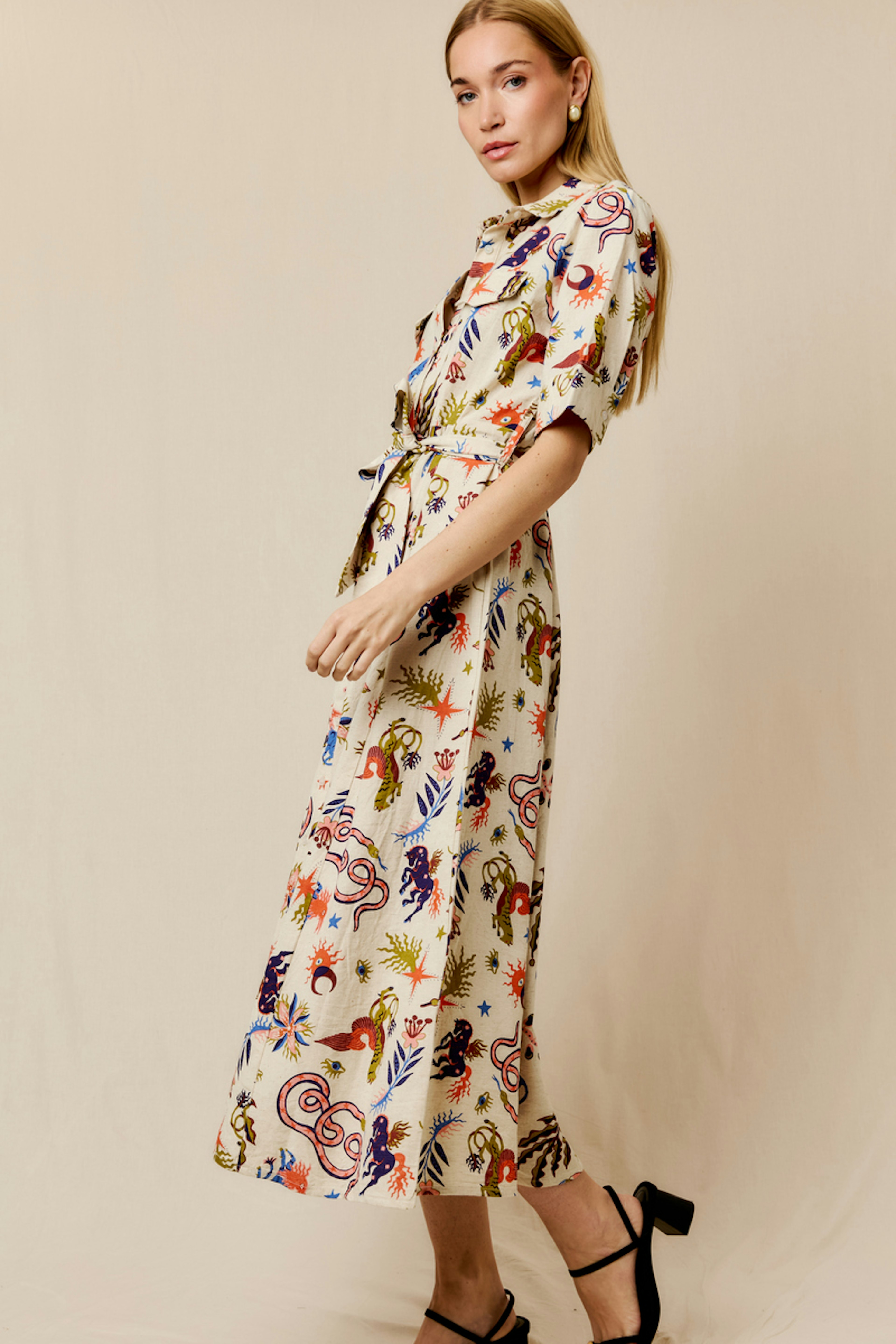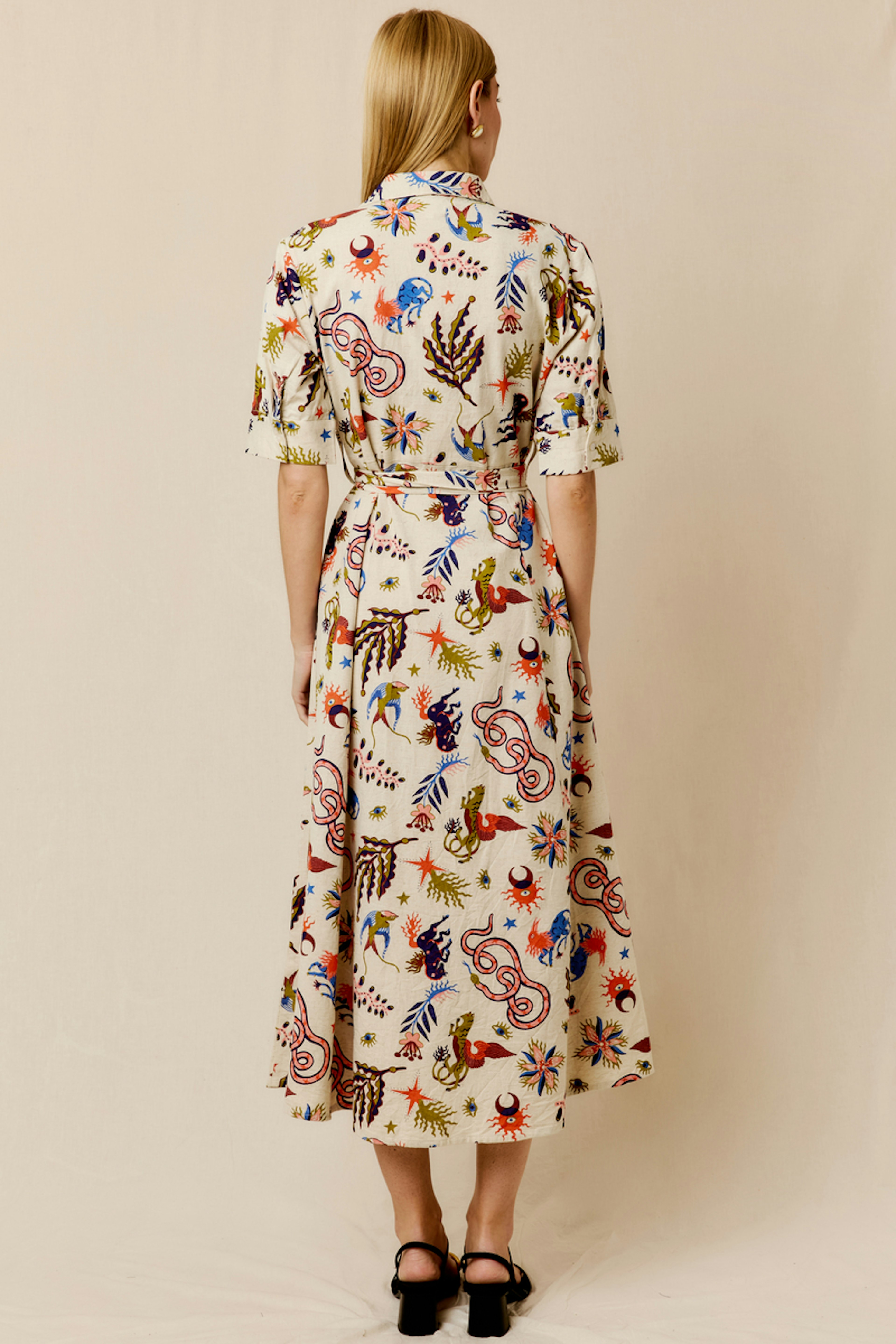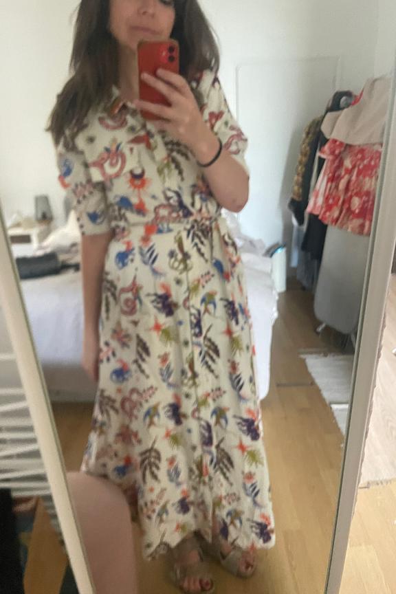 Associez cette robe imprimée avec des bottines en cuir et un cardigan épais pour un look chic hivernal. • Robe longue en coton et lin • Ceinture à nouer à la taille • Col chemise structuré • Manches courtes • Motif imprimé vivant