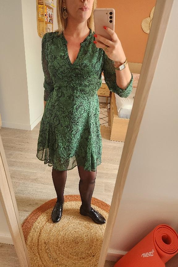 โBelle robe, bien coupรฉe. Joli tissu voile, entiรจrement doublรฉ sauf aux manches. Jolis plis godets dans la jupe qui la rendent ยซย dansanteย ยป, sans alourdir la taille. Bonne longueur pour mon 1,65m.โ