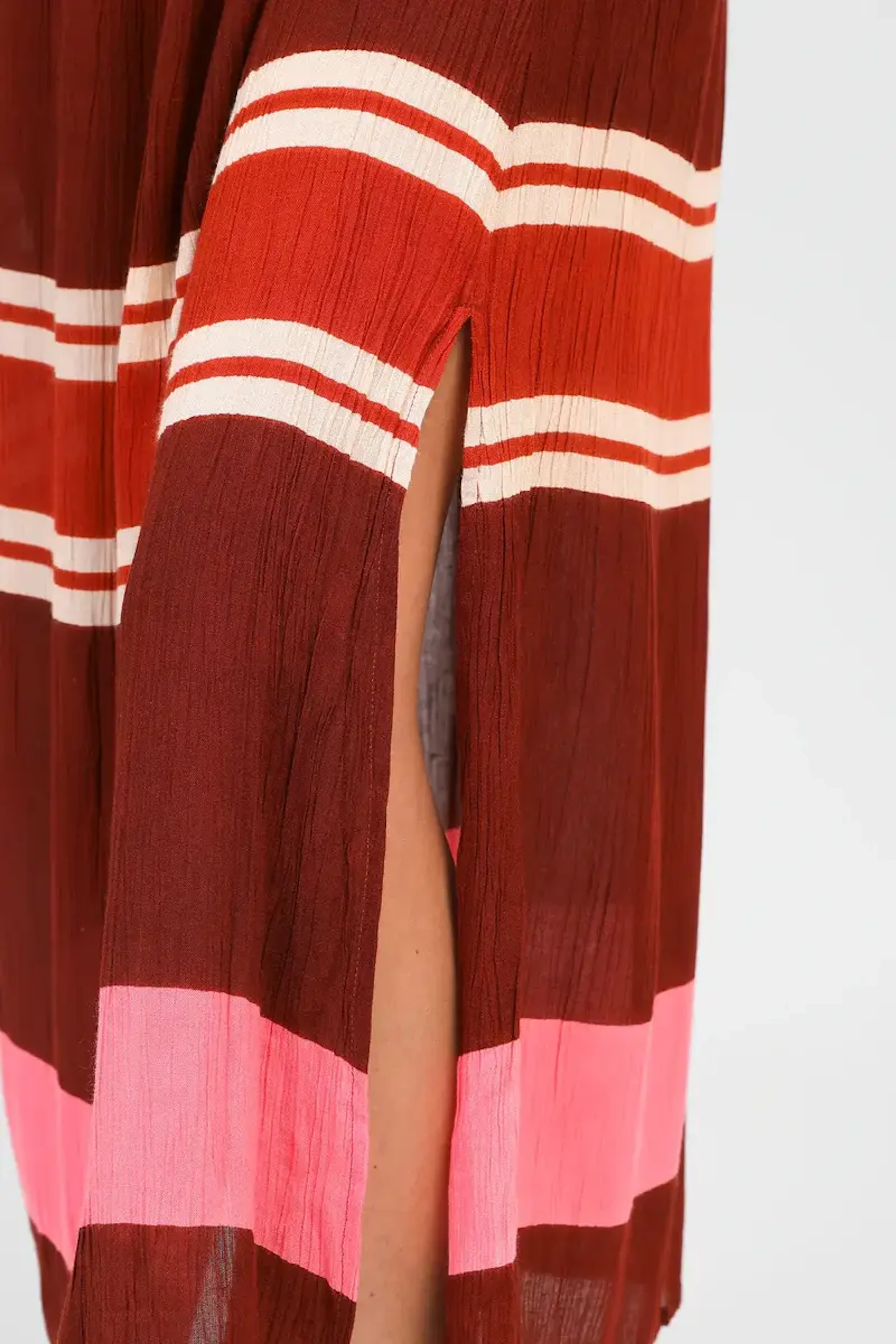 Associez cette robe à des sandales légères et un chapeau de paille pour une allure estivale chic. • Robe longue à rayures • Coupe droite • Sans manches • Encolure ronde • Motif rayé