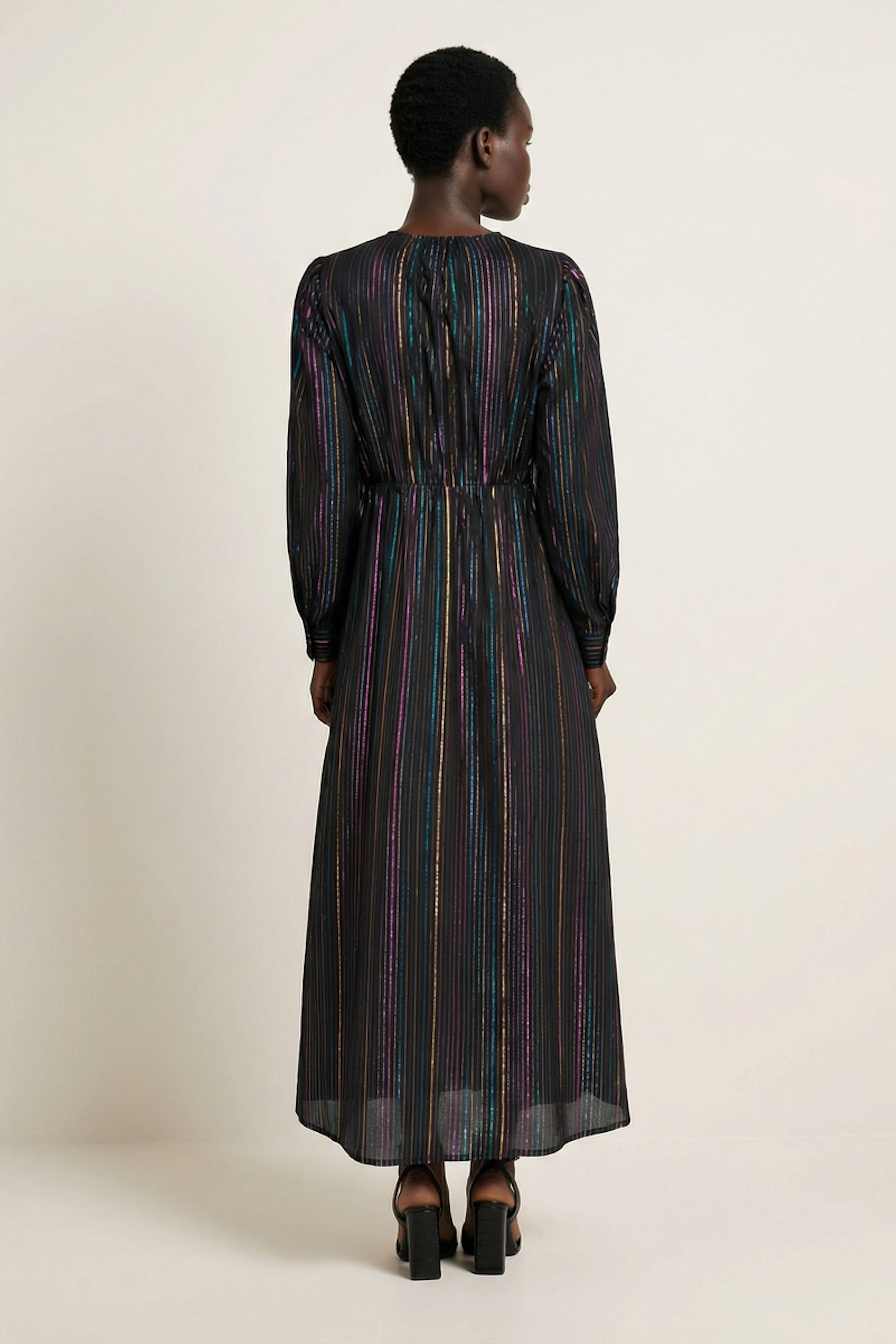 Associez cette robe avec des escarpins noirs et des boucles d'oreilles argentées pour une allure chic. Idéale pour les soirées d'hiver. • Robe en coton et fibres métalliques • Taille ajustée • Manches longues • Col chemise • Rayures multicolores en lurex