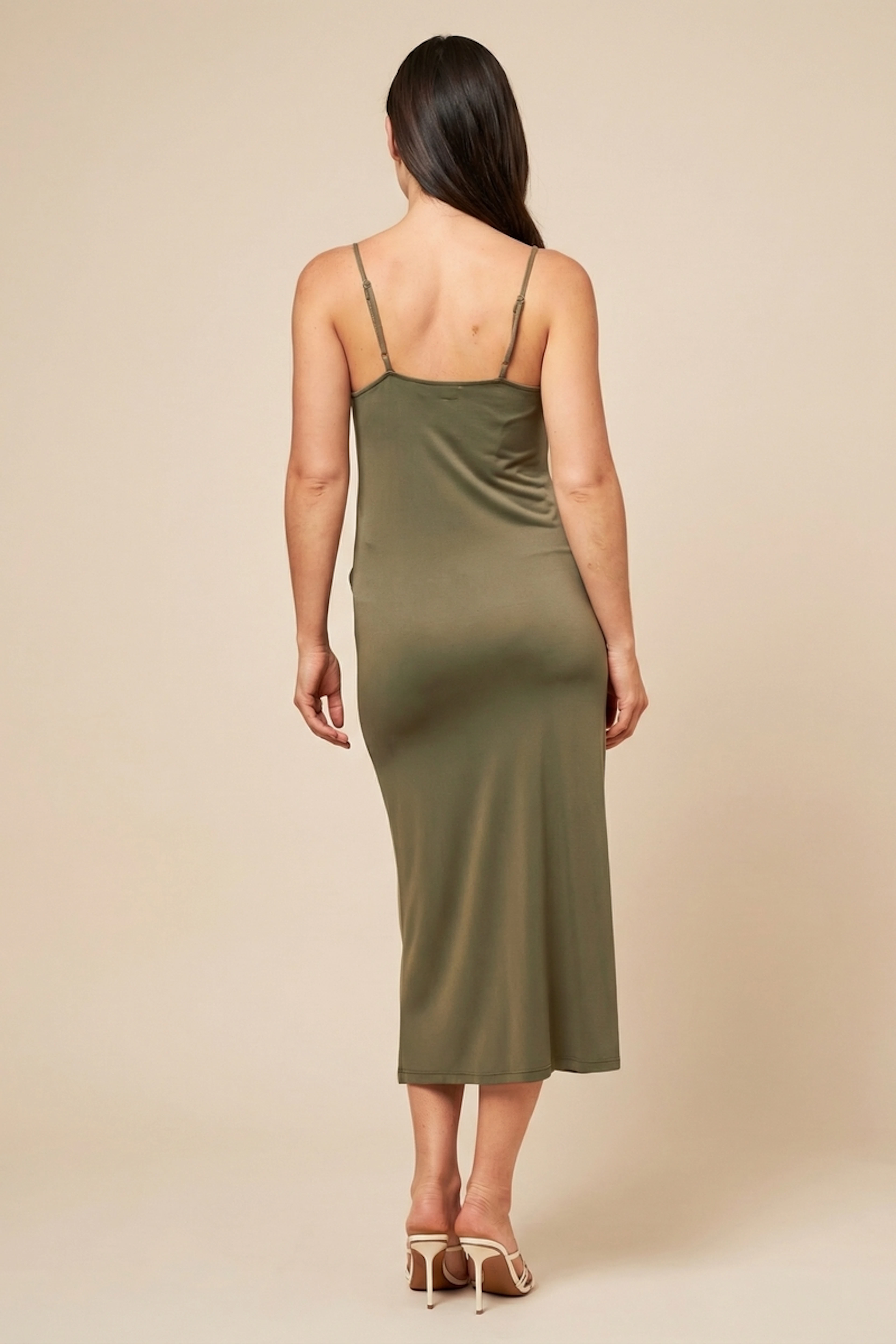 Associez cette robe élégante avec des sandales à talons et un collier doré pour un look chic tout en étant décontracté cet été. • Robe longue • Coupe ajustée • Bretelles fines • Détails froncés • Couleur kaki