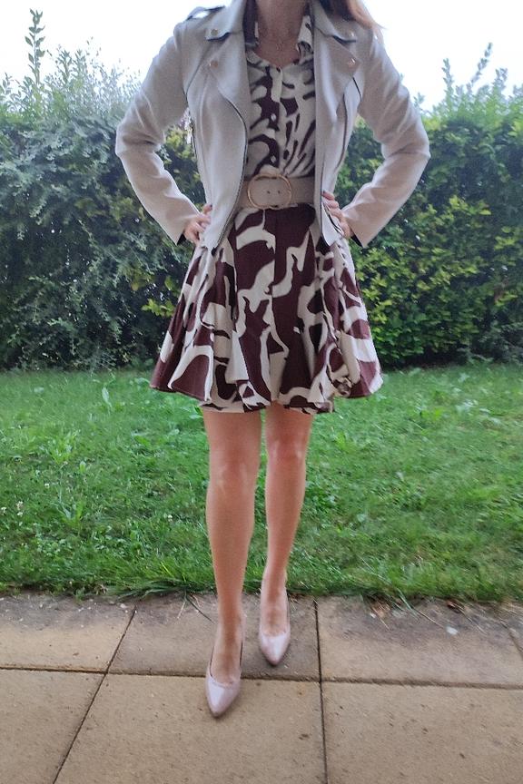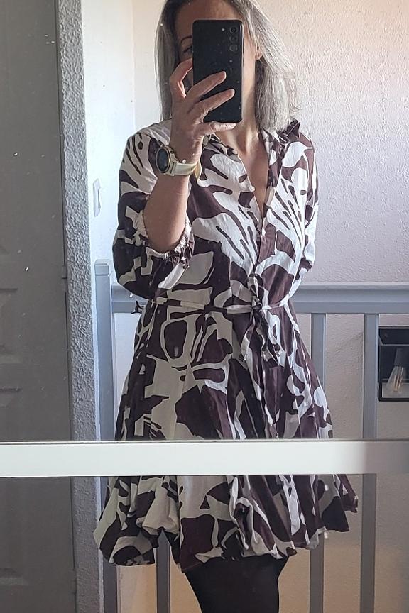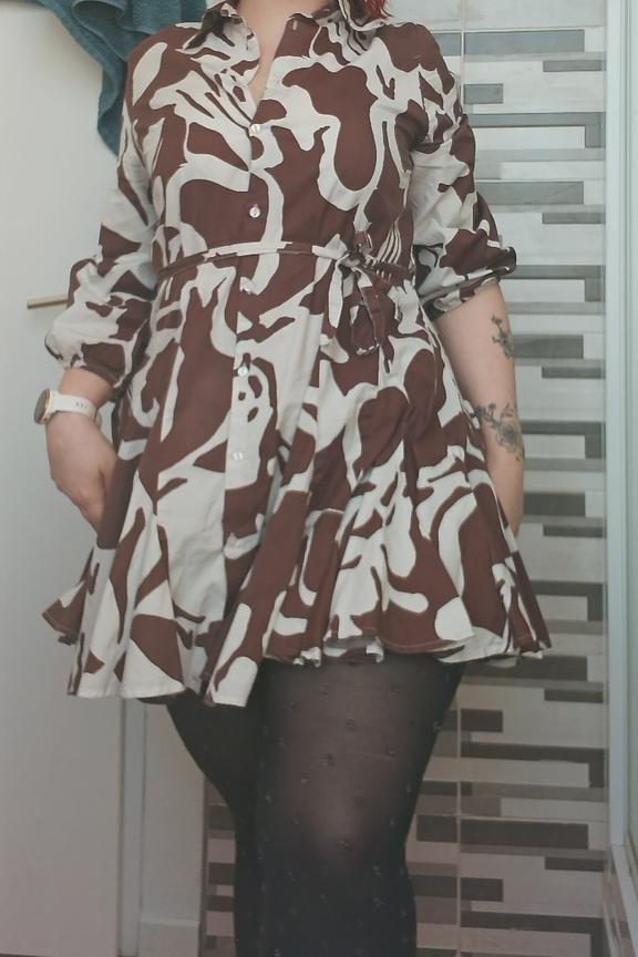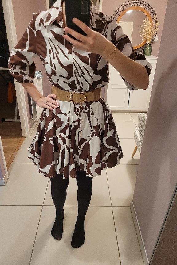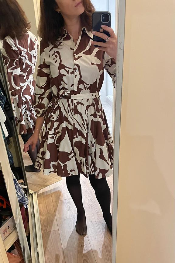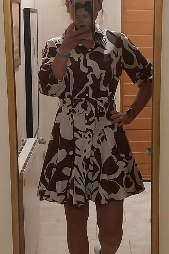 “Robe chemise sympa pour le printemps ou l’été. Tissu coton à l’imprimé original, jolie jupe à godets. Longueur correcte pour mon 1,65m mais comme la robe est légèrement plus courte devant, elle convient davantage aux vacances qu’au bureau.”