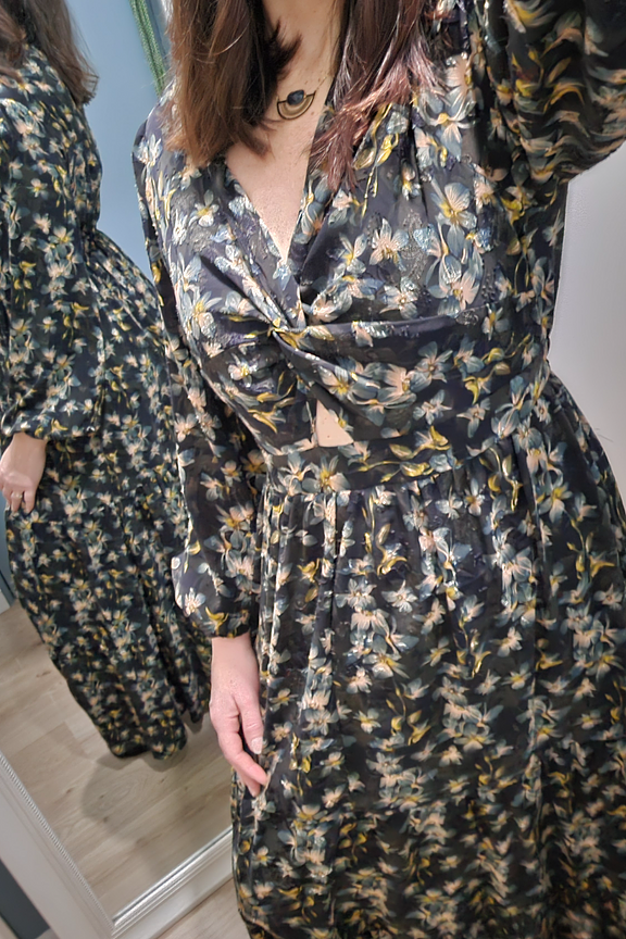 Ornée de motifs fleuris, la robe Pippa est la pièce parfaite pour la saison. Avec ses couleurs et sa coupe, elle s’impose comme la robe idéale à porter lors d'une douce journée d'automne. • Robe longue à motifs fleuris • Col en V • Manches longues • Ouverture à l'avant • Imprimé floral