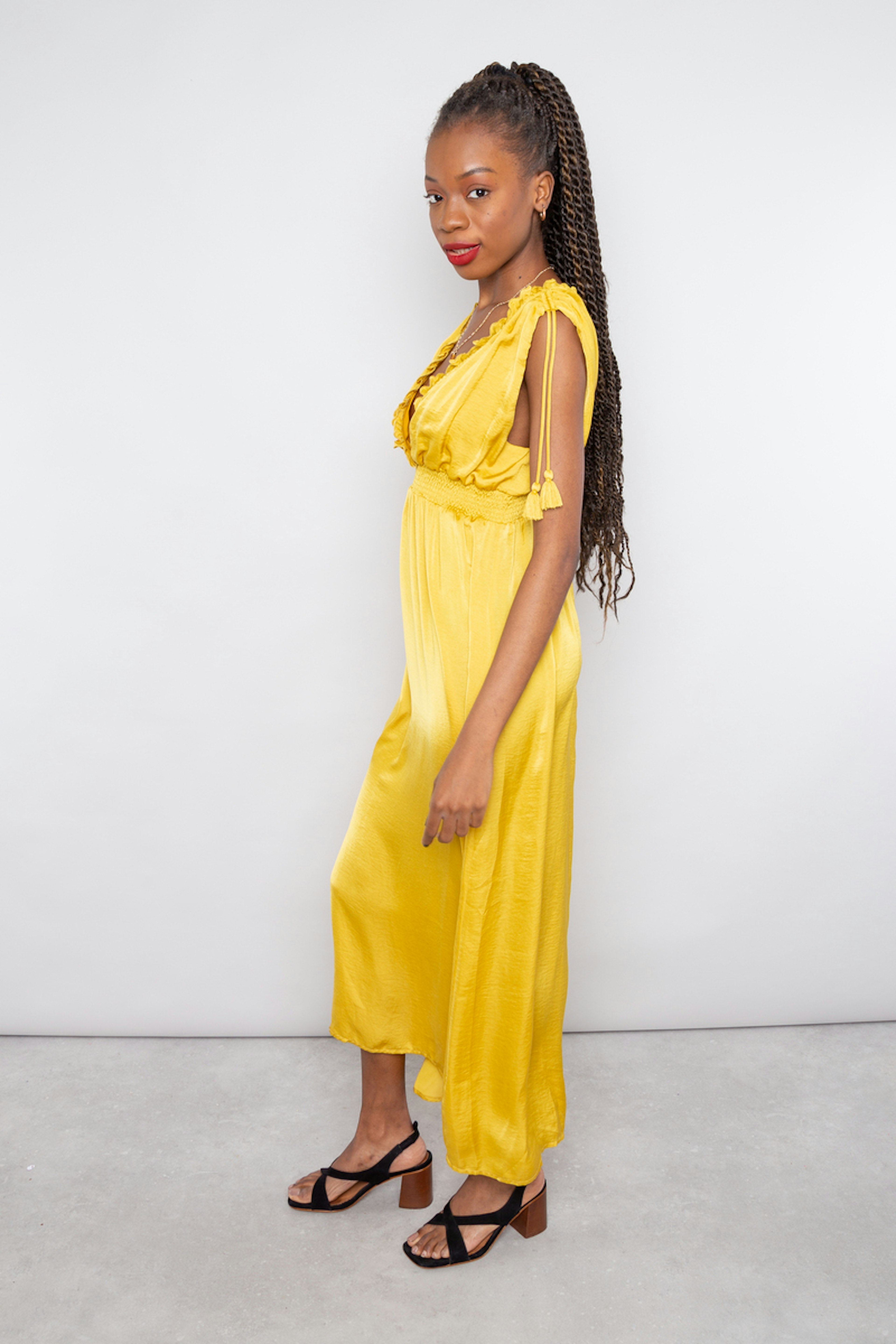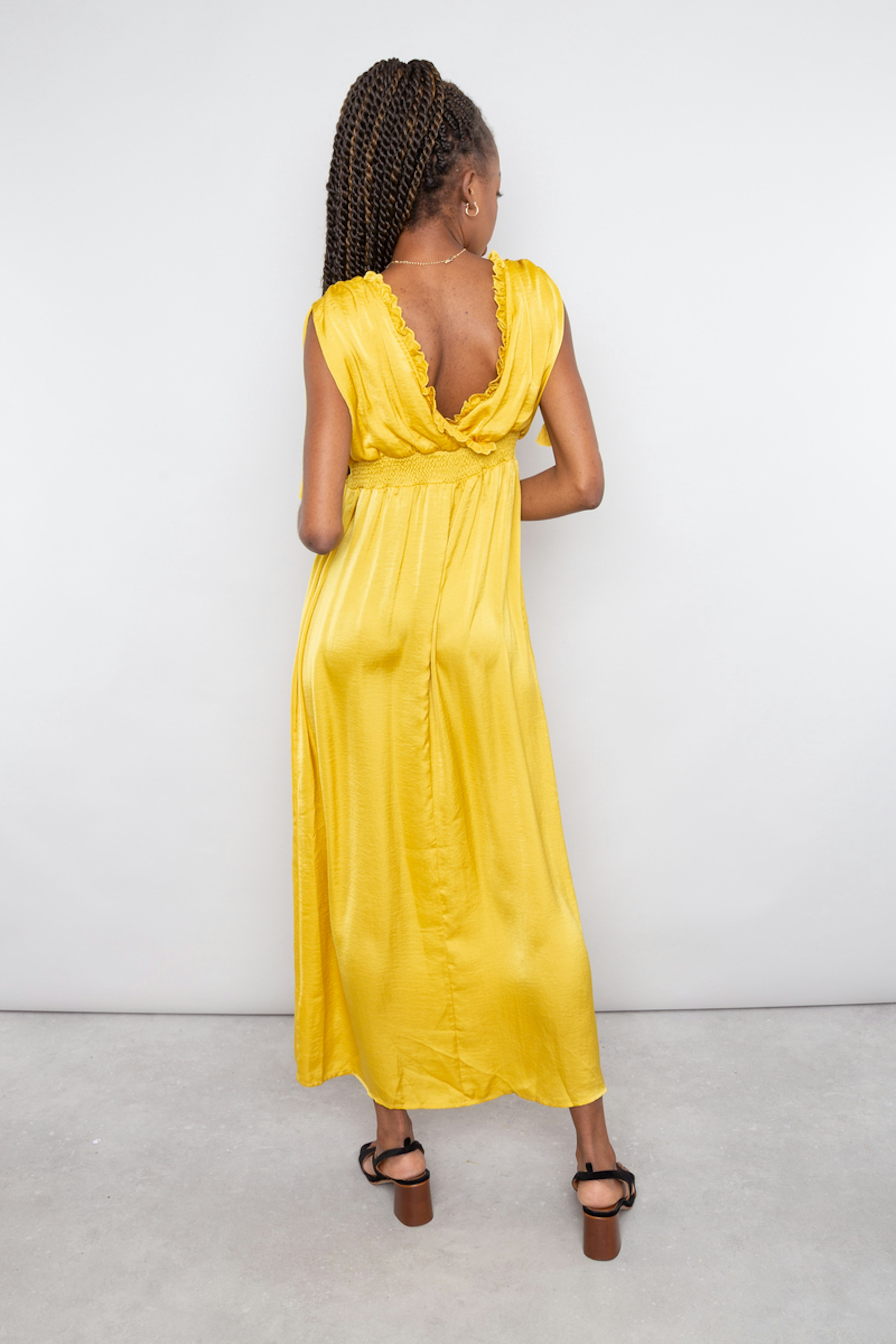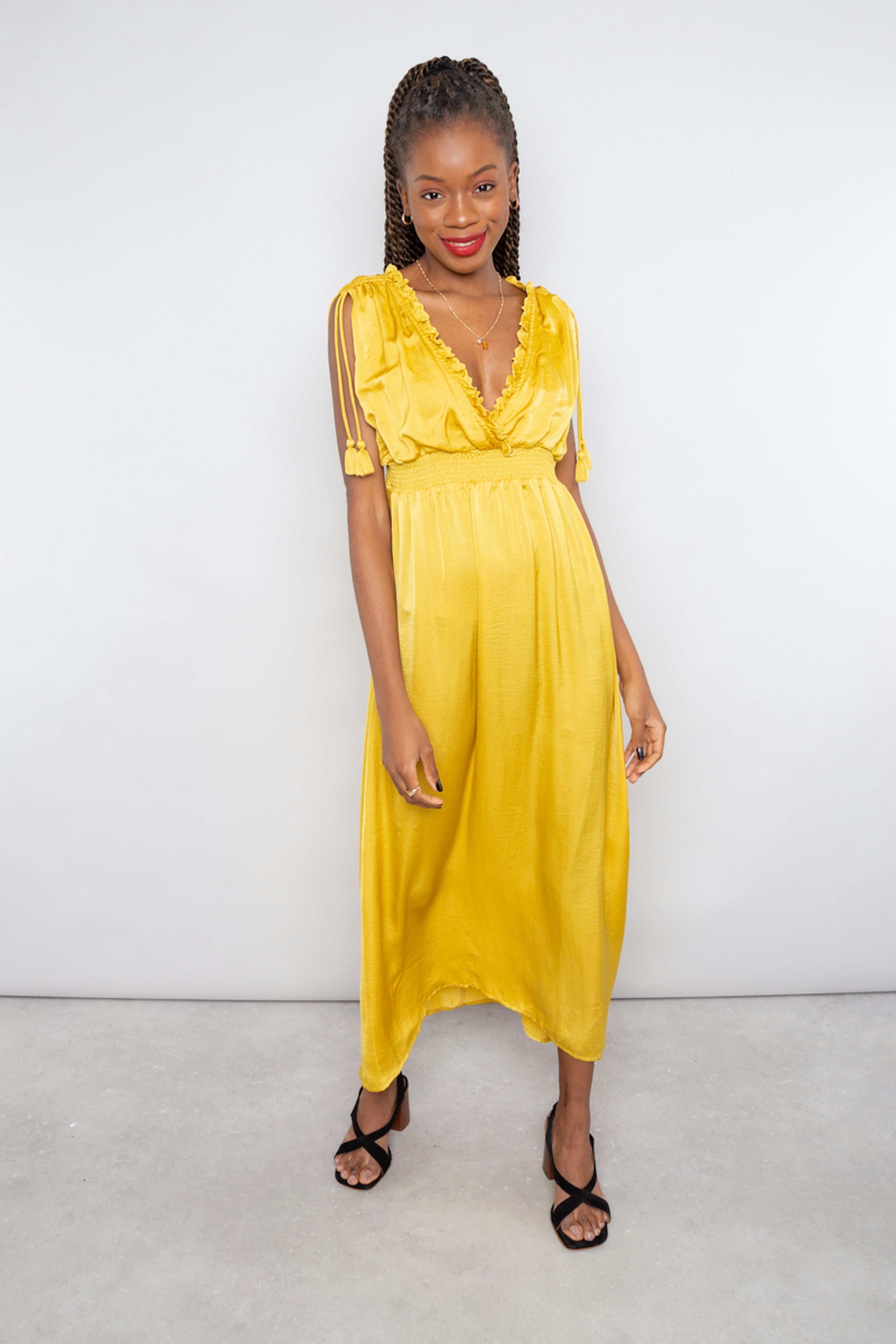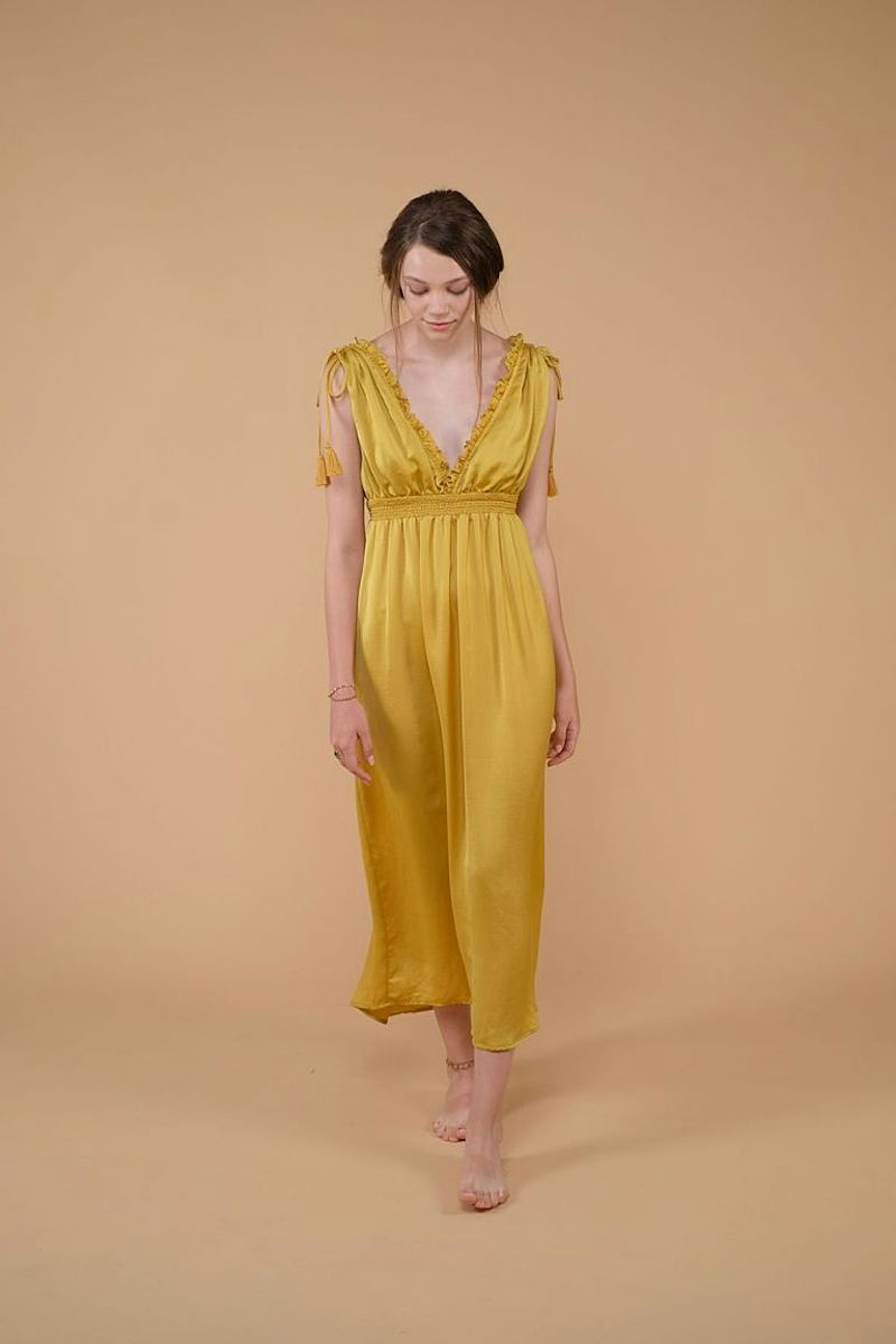 โ€ข Robe fluide sans manches de couleur miel โ€ข Taille รฉlastique smockรฉe โ€ข Bretelles froncรฉes sur le dessus des รฉpaules sublimรฉes par des liens de serrage ร  pompons โ€ข Encolure en V ornรฉe d'une fine bordure volantรฉe dans le dรฉcolletรฉ et dans le dos โ€ข Une robe รฉlรฉgante et fรฉminine