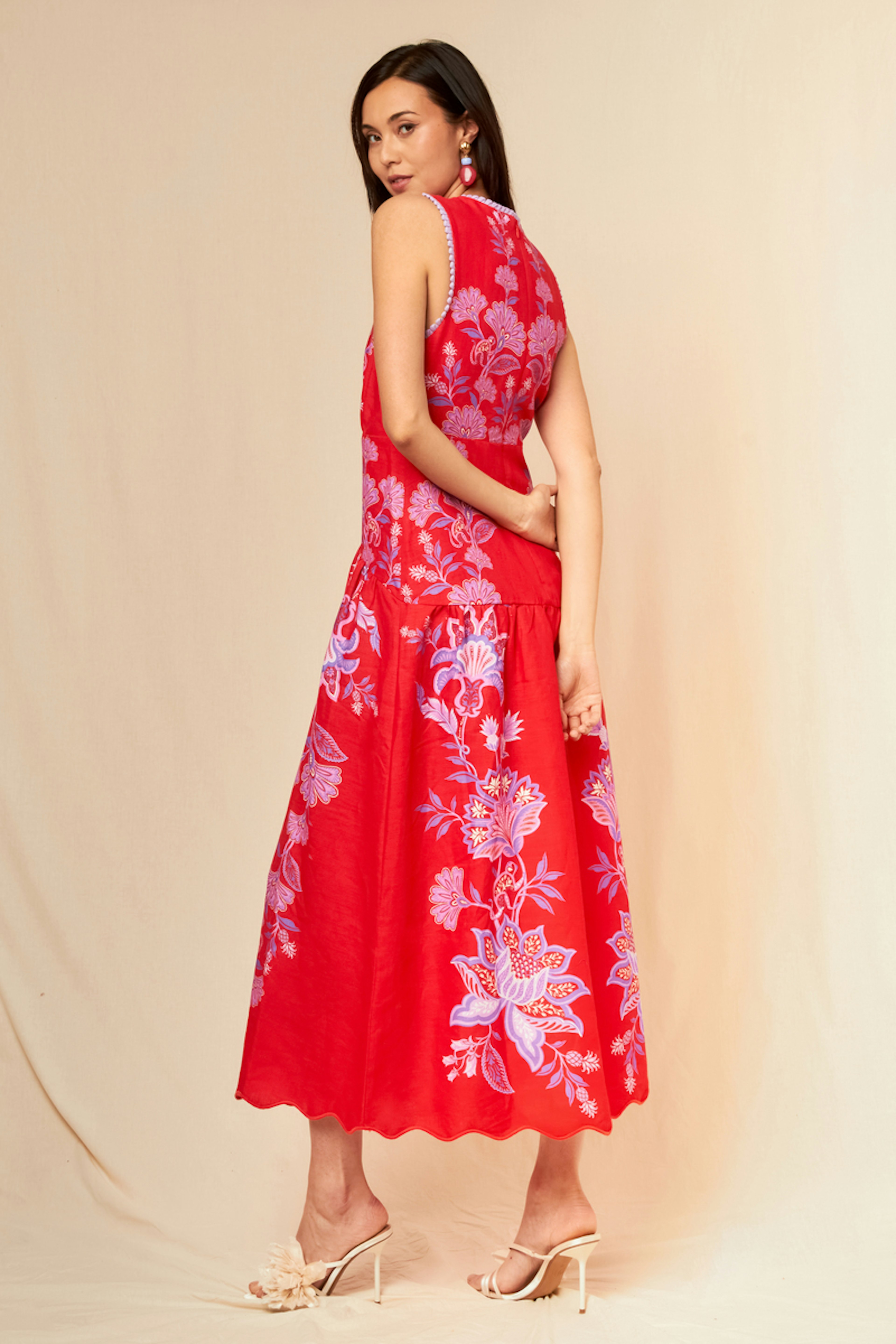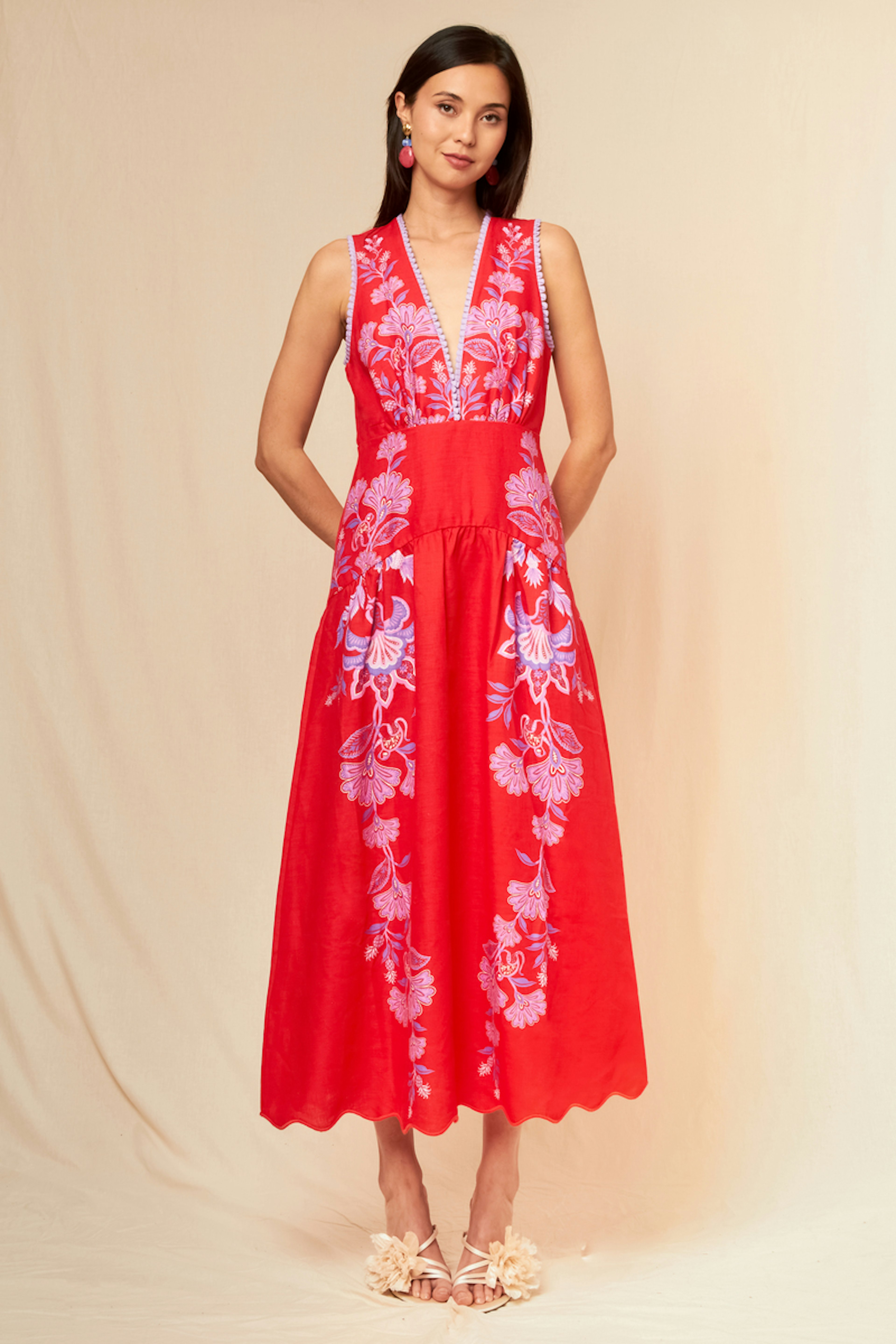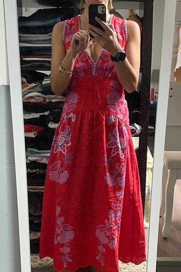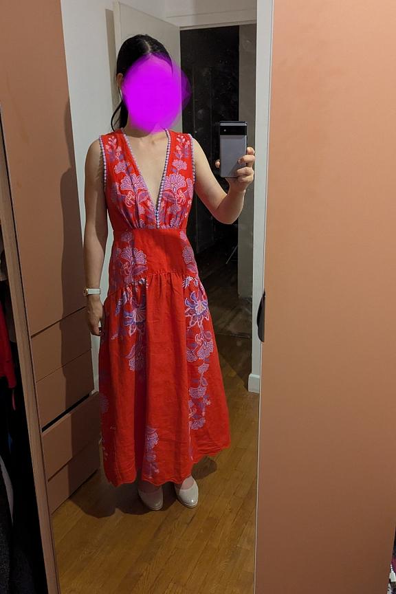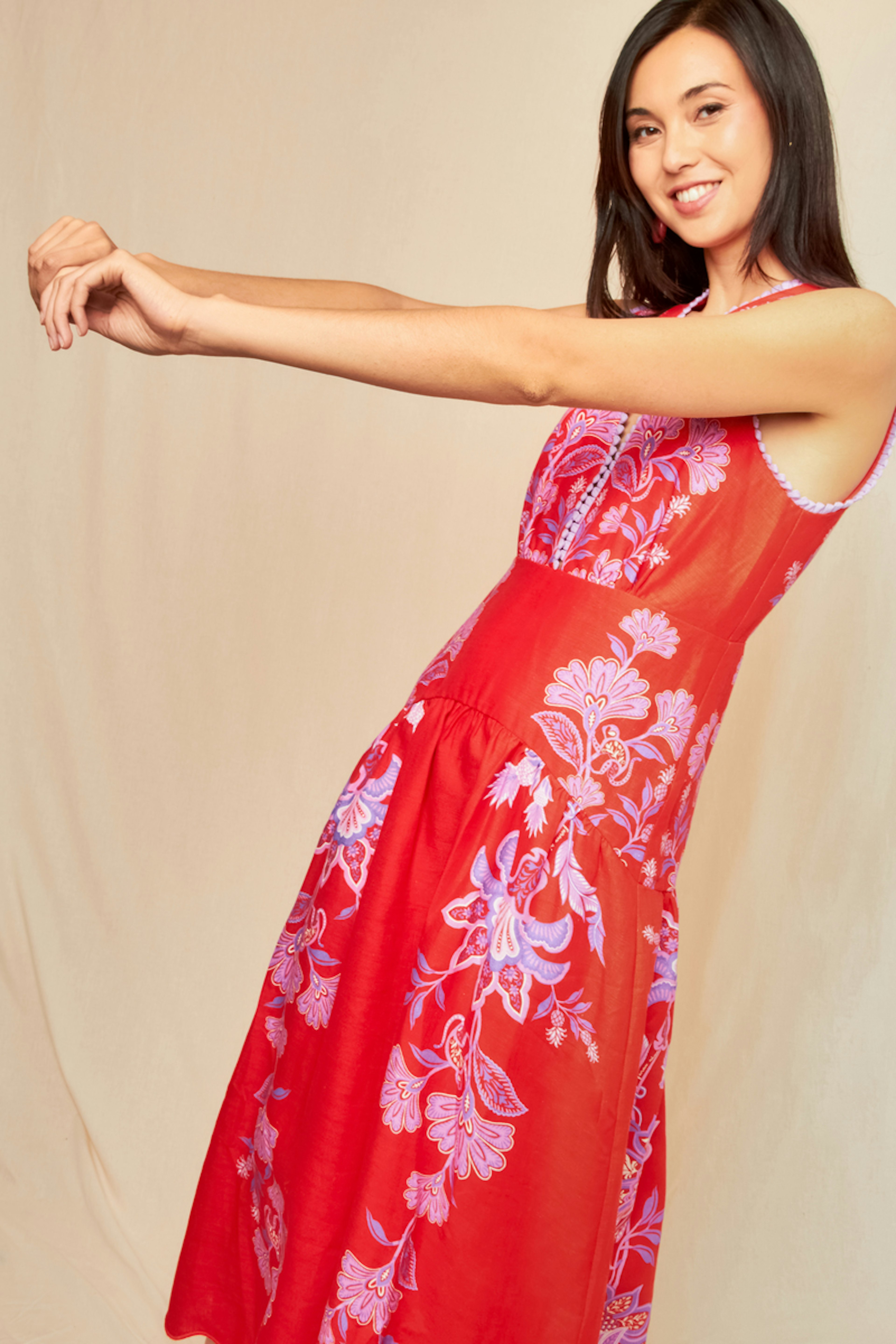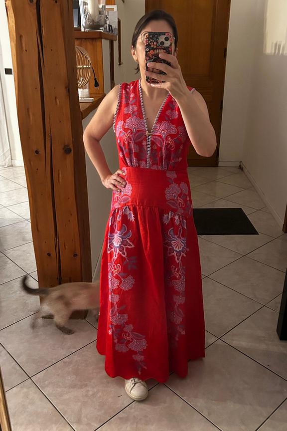 Ajoutez des sandales neutres et des boucles d'oreilles colorées pour un look estival. • Robe en lin • Coupe longue et évasée • Sans manches • Encolure en V • Motif floral