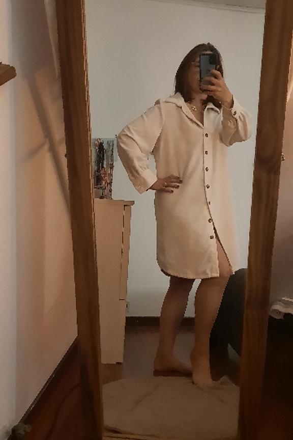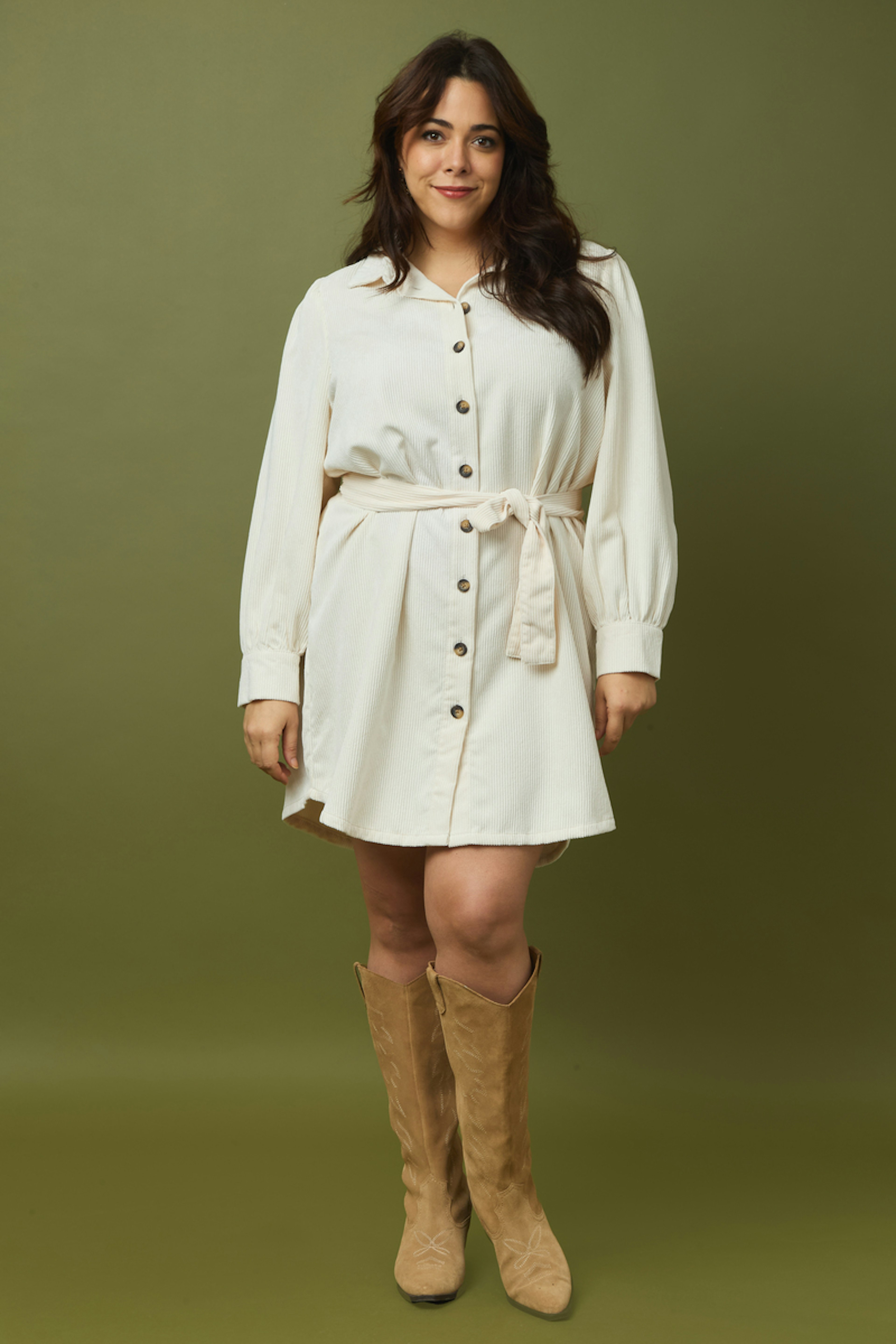 Associez cette robe avec des bottines en cuir et un chapeau feutre pour un look chic en hiver. • Robe courte en velours ecru • Coupe ceinturée • Manches longues • Col chemise • Boutons contrastés