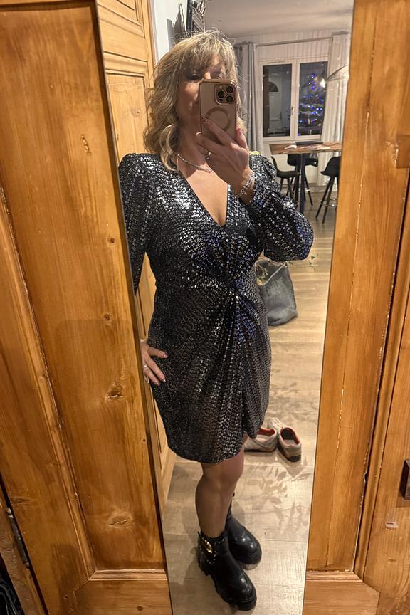 Ajoutez une touche glamour à votre look avec des bottes noires et des boucles d'oreilles scintillantes. Parfait pour briller en soirée! • Robe courte en sequins • Décolleté en V • Manches longues • Fronces à la taille • Motif à sequins