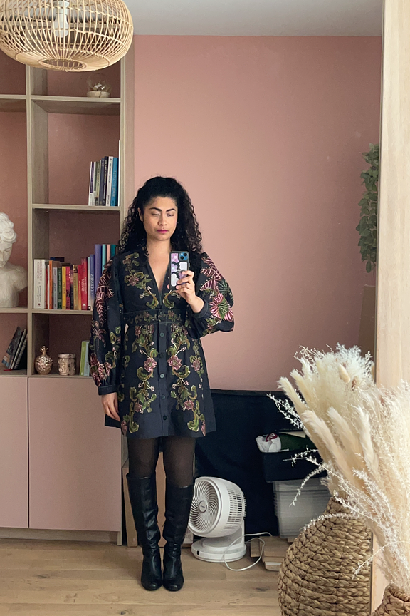 “C'est un véritable coup de foudre pour cette robe. Farm Rio est une de mes marques préférées car je trouve qu'elle met vraiment en valeur les courbes des femmes et particulièrement le teint des filles blacks et métisses. La coupe est superbe, elle épouse bien les courbes du corps. Parfait pour souligner la taille et masquer un petit ventre. Plutôt versatile, elle porte avec des bottes ou des baskets de ville. Coupe très originale. J'ai eu beaucoup de compliments sur les manches. Elles sont d'ailleurs rembourées de tulle pour garantir l'effet gonflé. Je trouve que c'est une robe qui convient particulièrement bien à une silhouette en forme de poire car elle est marque bien la taille et vient élargir les épaules. Attention, taille petit au niveau de la poitrine. Je fais un 90A et quand je le portais avec un soutien-gorge rembourrée, c'était tout de suite un peu trop étroit. J'adore l'imprimé! Les photos du site ne font pas justice à l'intensité des couleurs. C'est sublime. Tissu très agréable. Je valide pour celles qui comme moi ont la peau sensible et préfèrent les matières naturelles. Je l'ai portée en hiver sur des collants mais elle peut aussi se porte par grosse chaleur. Je l'ai portée en voyage dans des pays chauds et c'était très confortable.”