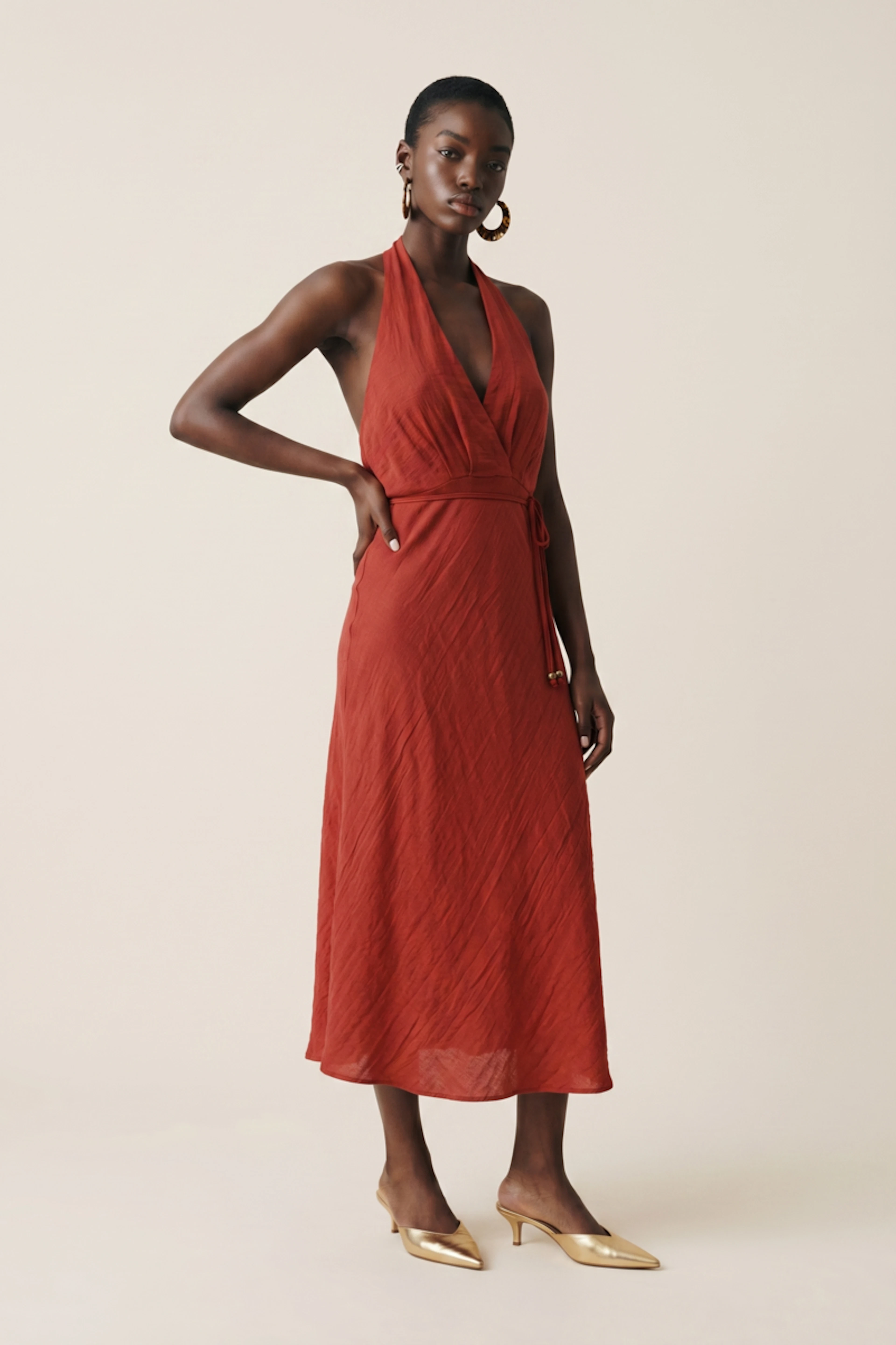 Portez cette robe avec des sandales dorées et un sac tissé pour un look estival élégant. • Robe longue • Décolleté col licou • Ceinture à nouer à la taille • Jupe évasée • Coloris uni