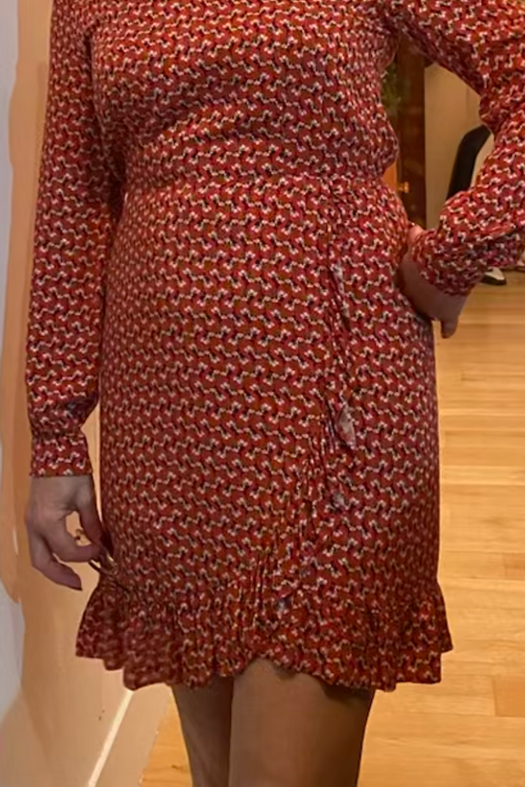 โข Robe cache-cลur rouge avec dรฉtails fleuris โข Encolure en V โข Manches longues โข Longueur courte avec un volant sur le cรดtรฉ