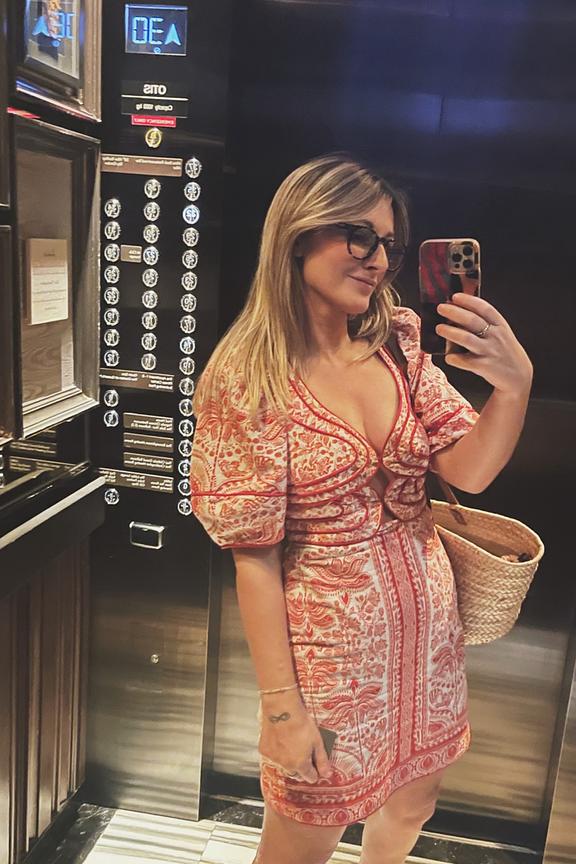“Sublime ! Cette robe est magnifique, les détails avec les perles au niveau des lacets, le décolleté, la couleur, les manches bouffantes, le motif… Je n’ai eu que des compliments dessus. La robe met vraiment en valeur. Je mesure 1m70 pour 58 kg, la longueur est parfaite. Elle peut se porter avec des sandales types K-Jacques en cuir naturel la journée, ou avec des talons dorés le soir.”