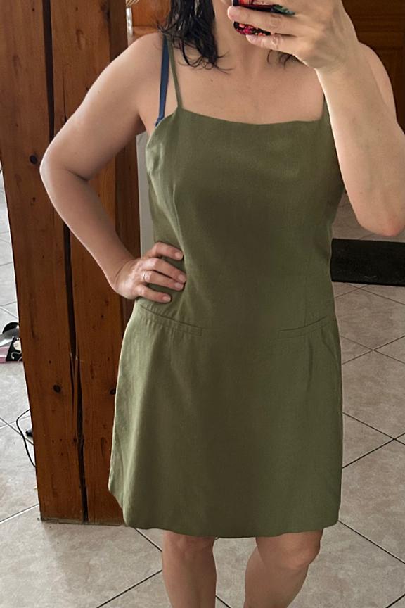 Portez cette robe avec des sandales dorรฉes et un chapeau de paille pour un look estival parfait ! โ€ข Robe courte en coton โ€ข Bretelles fines ajustables โ€ข Dรฉcolletรฉ carrรฉ โ€ข Coupe prรจs du corps โ€ข Couleur vert kaki รฉclatante