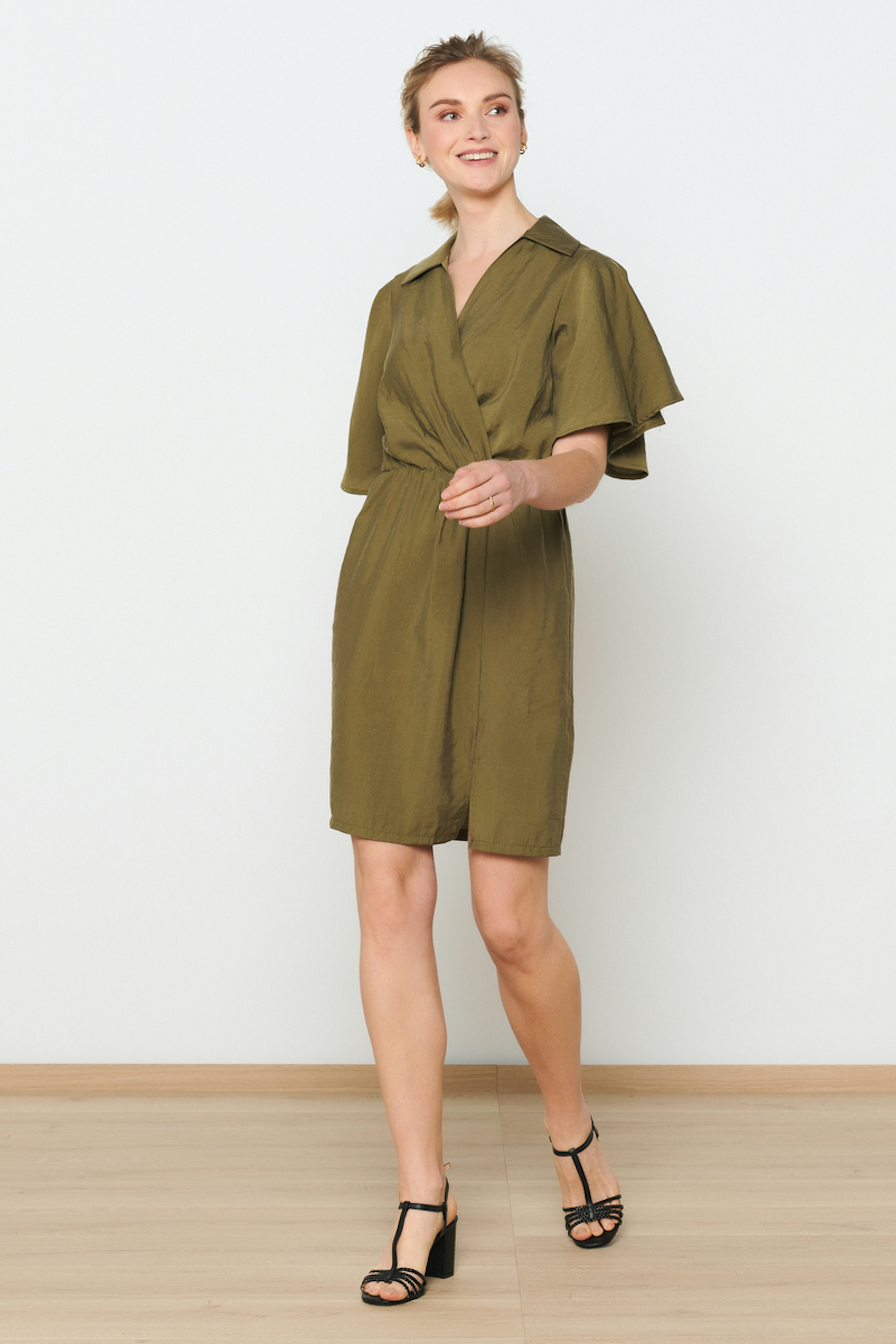Sublimez votre été avec cette robe kaki aérée, idéale pour une promenade ensoleillée ou un dîner en terrasse. Parfait pour toute saison avec une veste en jean Levi's. • Robe droite en Lyocell • Col chemise élégant • Manches courtes fluides • Longueur genou
