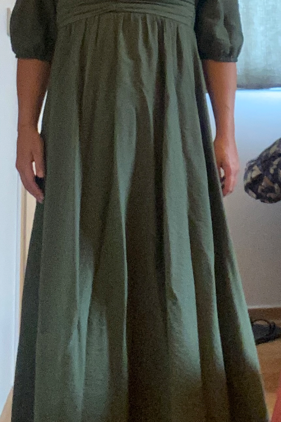 Associez cette robe avec des sandales à talons et quelques accessoires dorés pour un look élégant et intemporel. • Robe longue en viscose • Décolleté en V • Manches 3/4 bouffantes • Taille cintrée • Couleur kaki