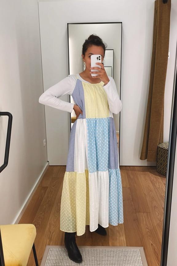 Misez sur un esprit bohรจme chic avec cette robe patchwork Frnch, idรฉale pour les journรฉes ensoleillรฉes. Parfaite pour l'รฉtรฉ, elle s'accompagne volontiers d'un chapeau de paille et de sandales plates pour une allure lรฉgรจre et estivale. โข Robe patchwork en coton โข Bretelles fines โข Jupe ร volants โข Longueur midi โข Motif rayures et broderies